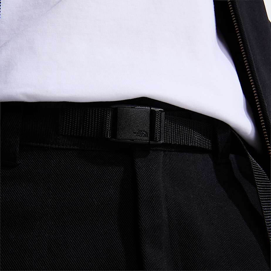 Er ist aus strapazierfähigem Baumwolltwill gefertigt und verfügt über zwei offene Taschen, eine Gesäßtasche und einen integrierten Gürtel mit Schnallenverschluss.