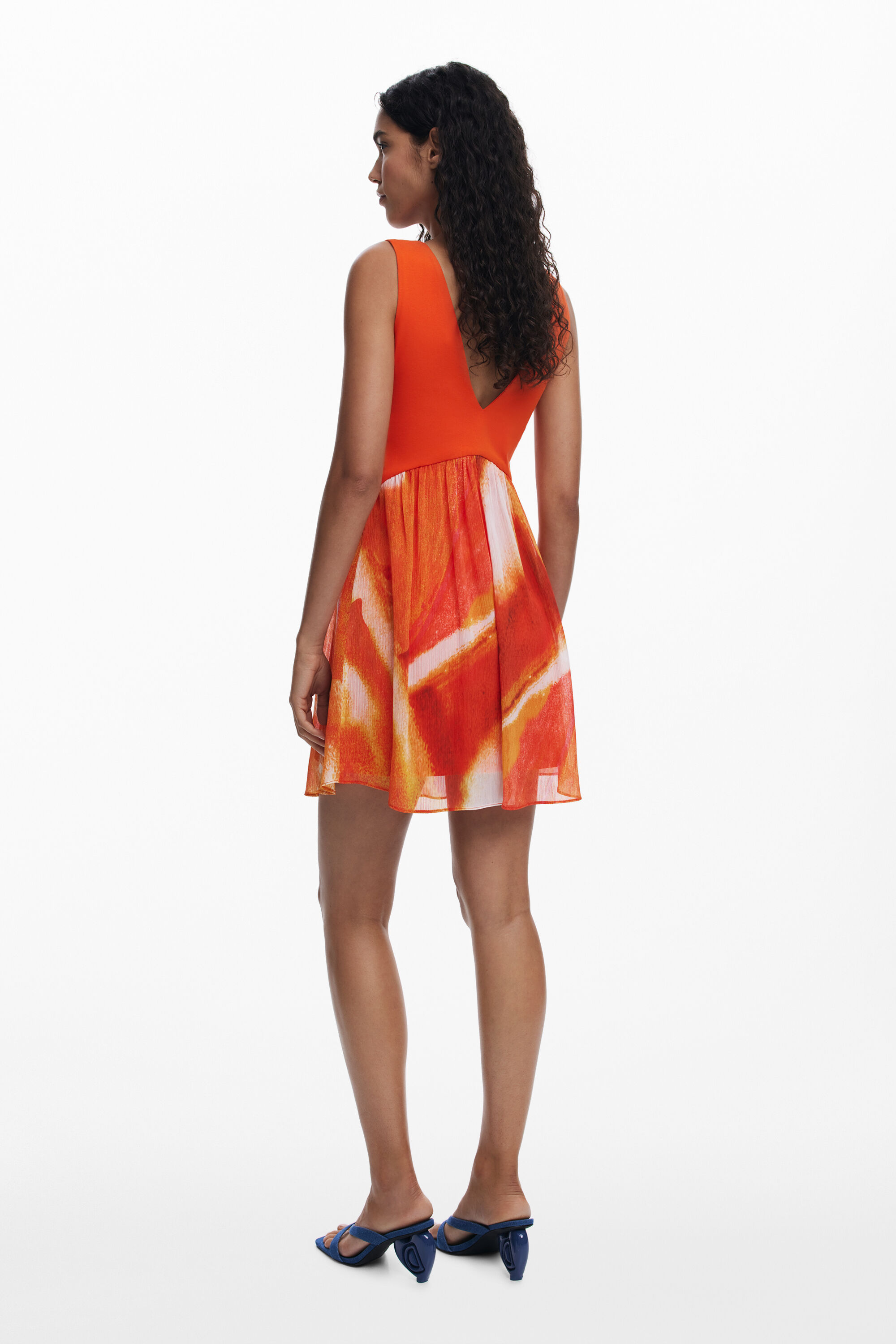 Abito corto con corpetto a tinta unita e gonna con stampa etnica, scollo a V e chiusura con cerniera.Colore: