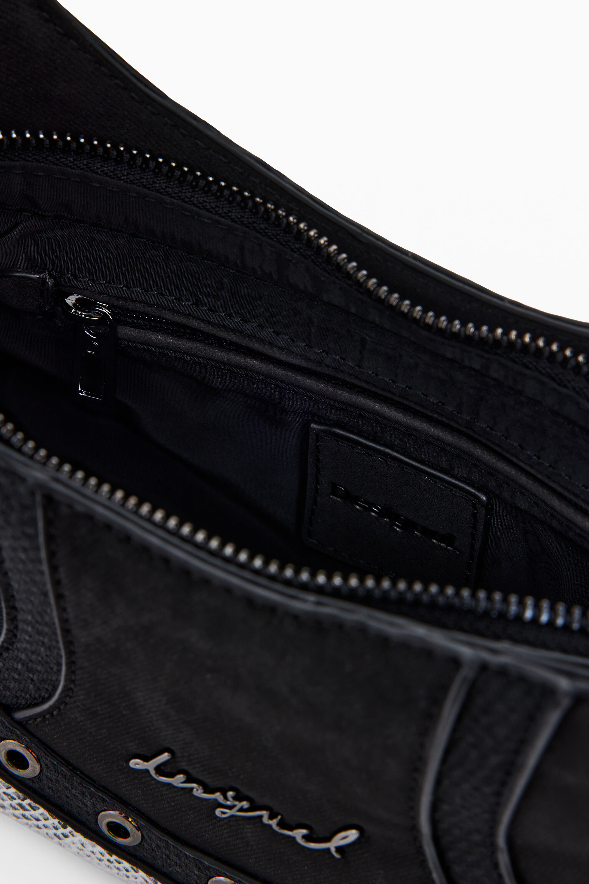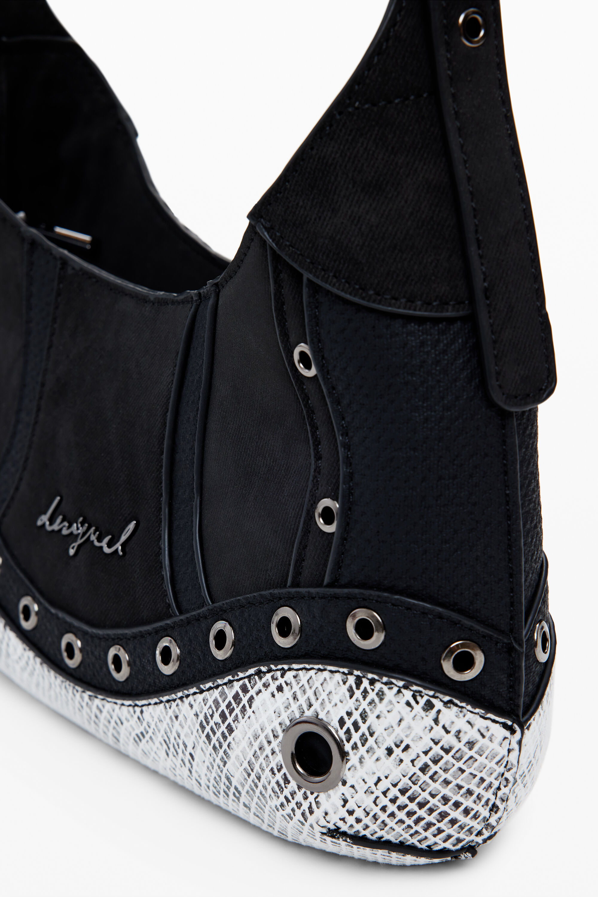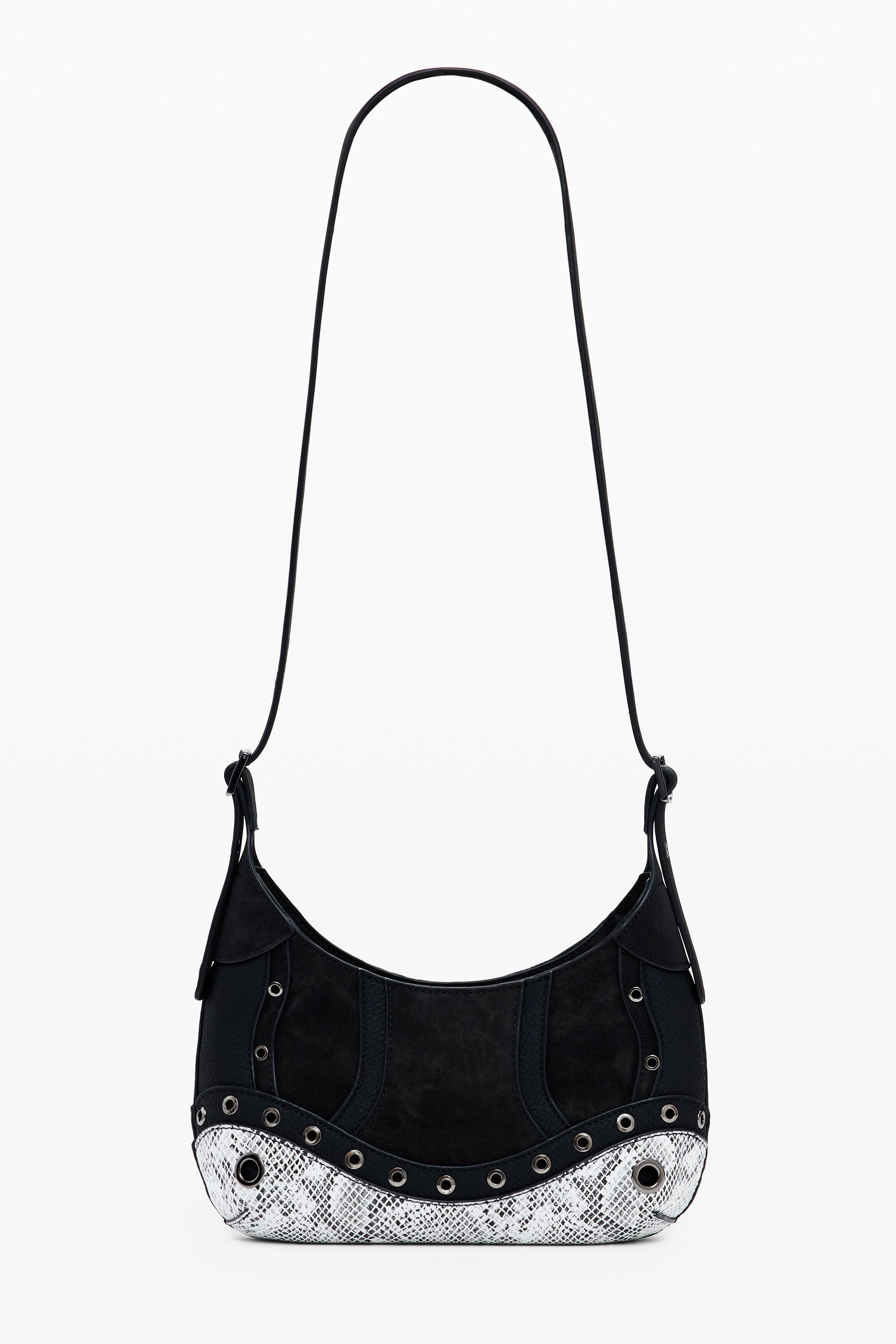 Borsa a spalla di piccole dimensioni, con combinazione di tessuti, effetto serpente, dettagli con borchie metalliche, manici intercambiabili e chiusura con cerniera.Combinazione di tessutiChiusura: con cernieraManici intercambiabiliDettaglio del logo in applicazione metallicaDettaglio di borchie metallicheEffetto pelleProgettato a BarcellonaMisure: 24 x 9 x 16,30 cm