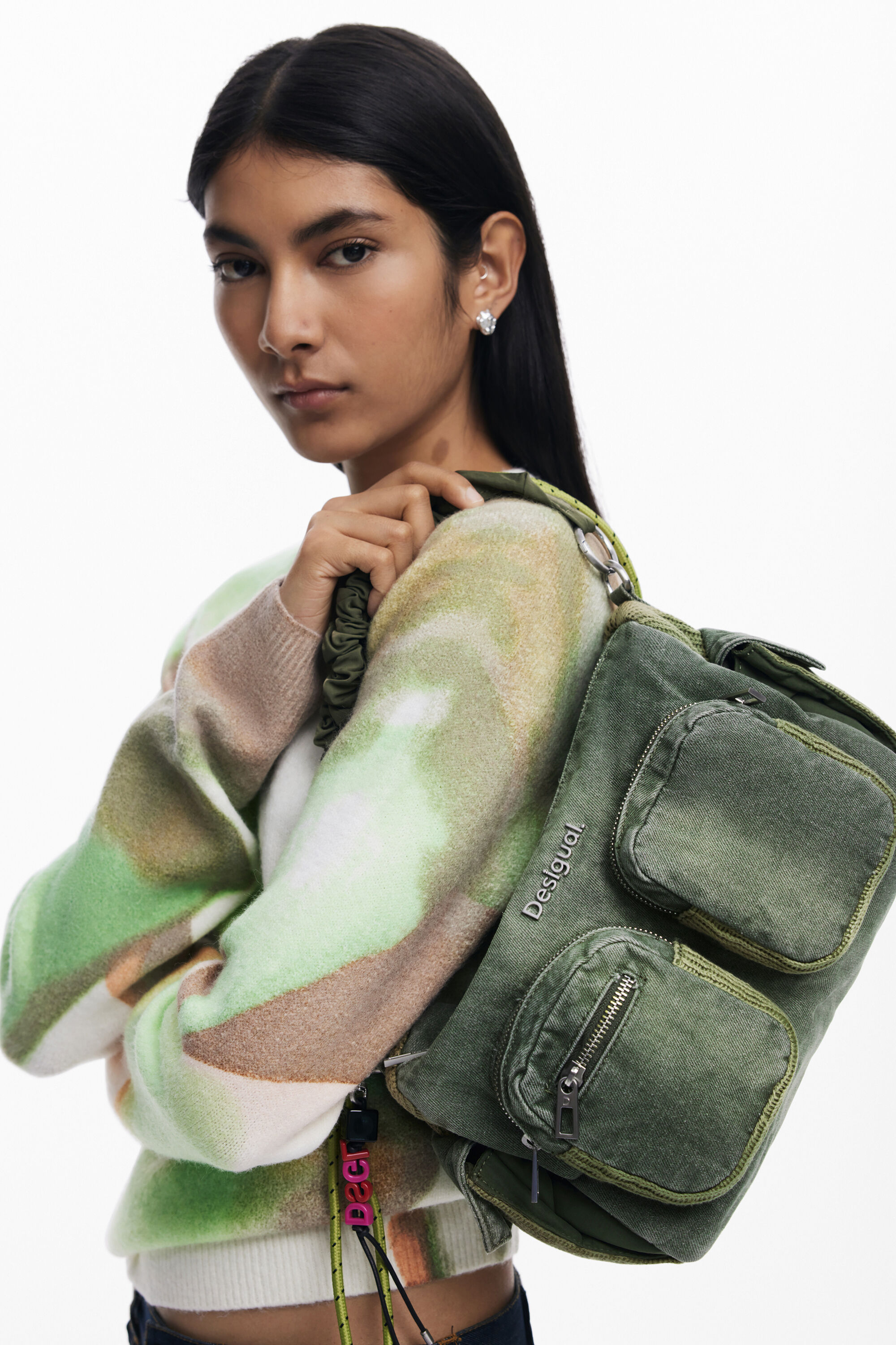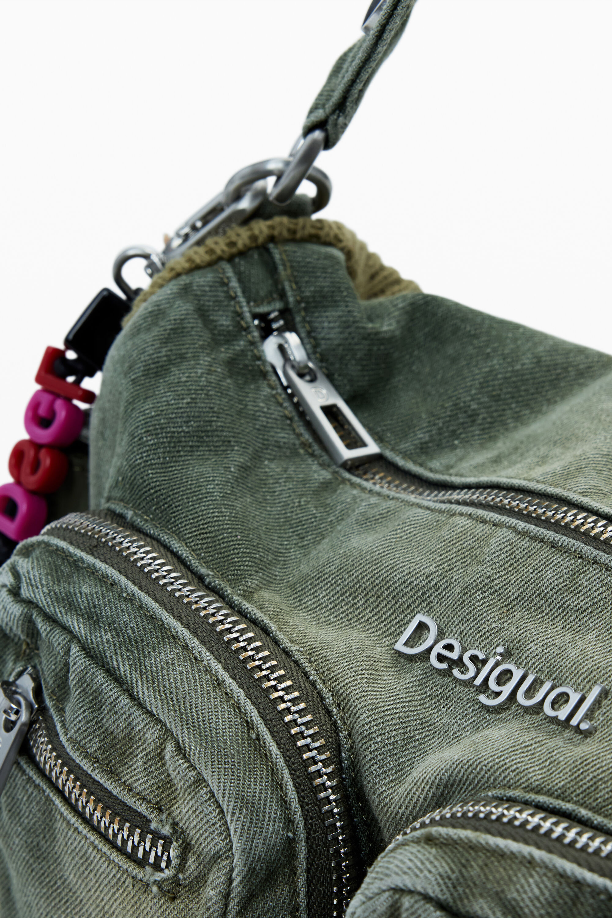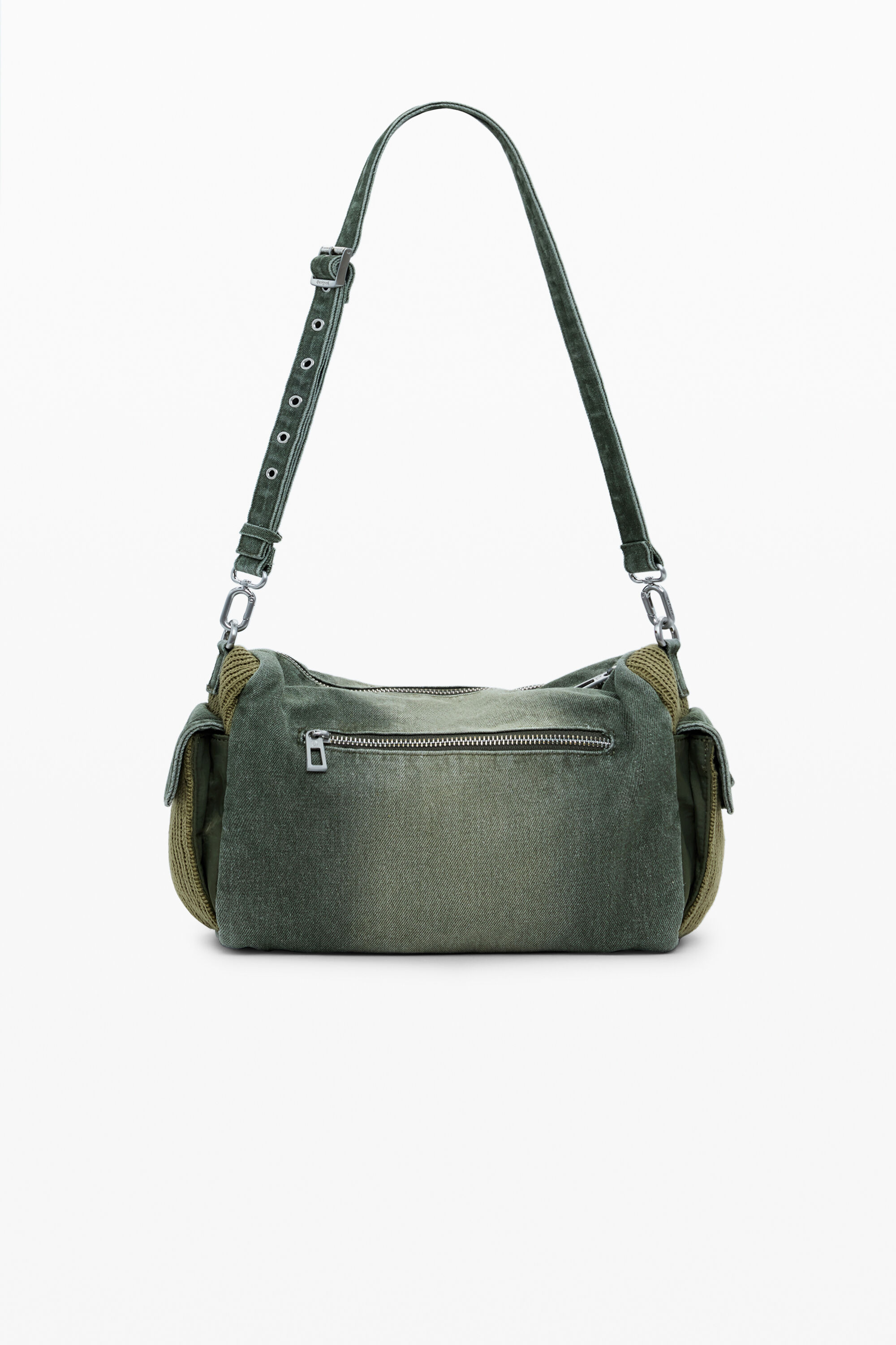 Borsa media con diverse tasche, effetto consumato, applicazioni metalliche e tracolle intercambiabili.BicoloreMultitascheTasche con cernieraChiusura: con cernieraTasca interna con cernieraManici intercambiabiliCintura con applicazioni metallicheDesign con due materiali diversi.Effetto consumatoCollezione AW25Progettato a BarcellonaMisure: 26,5x12,5x18,10 cm