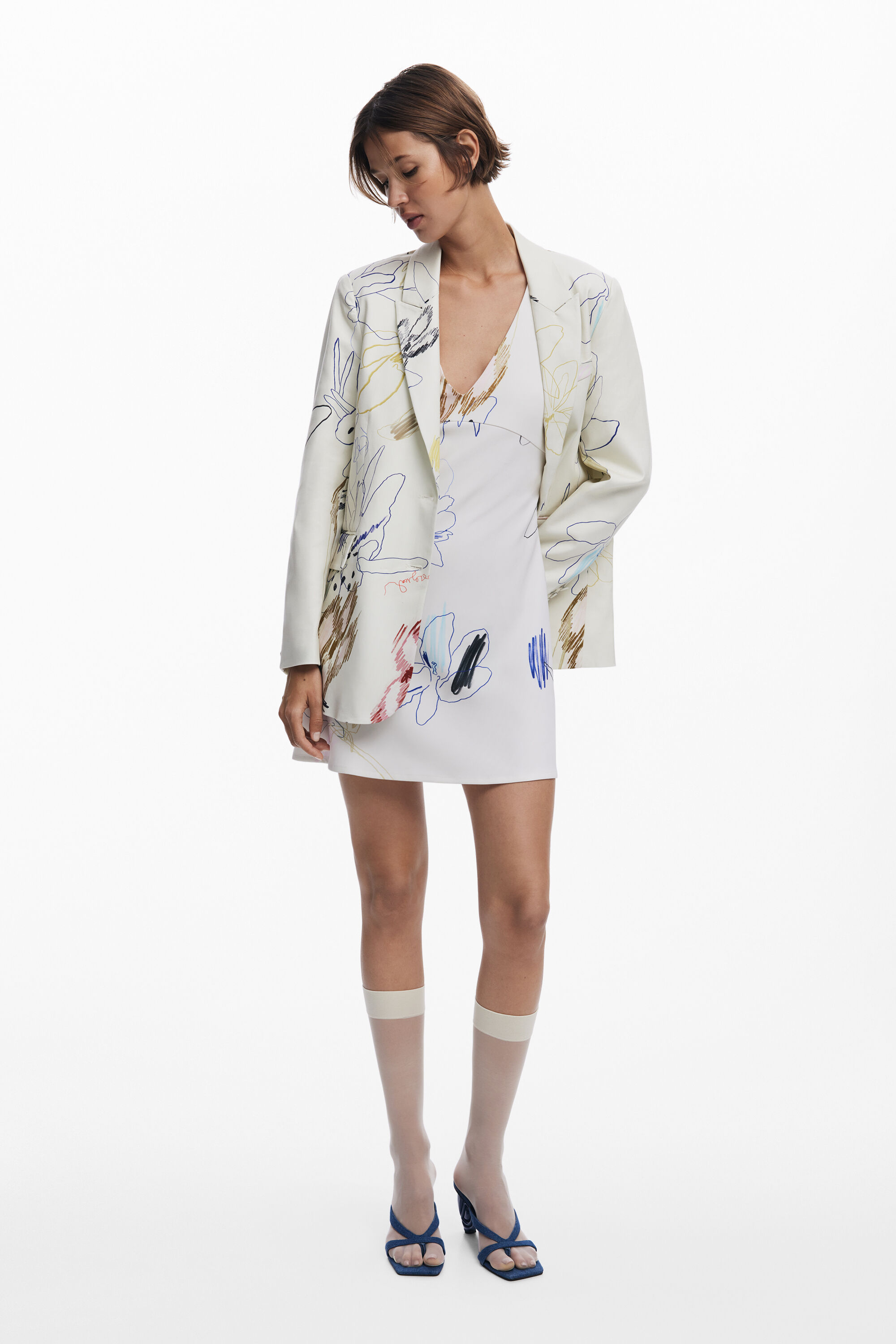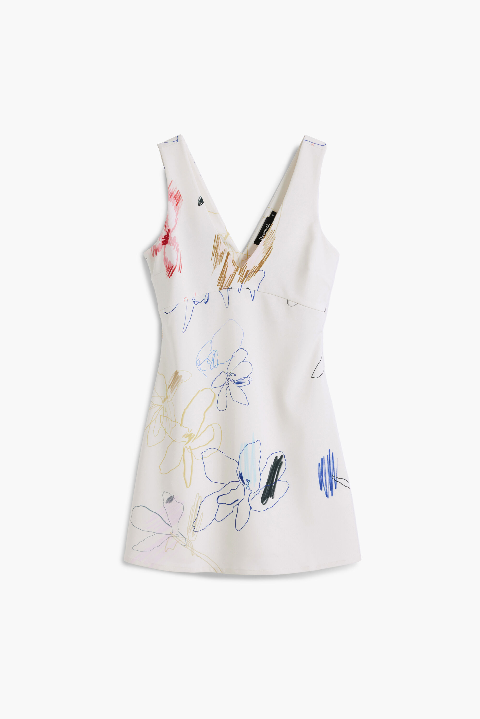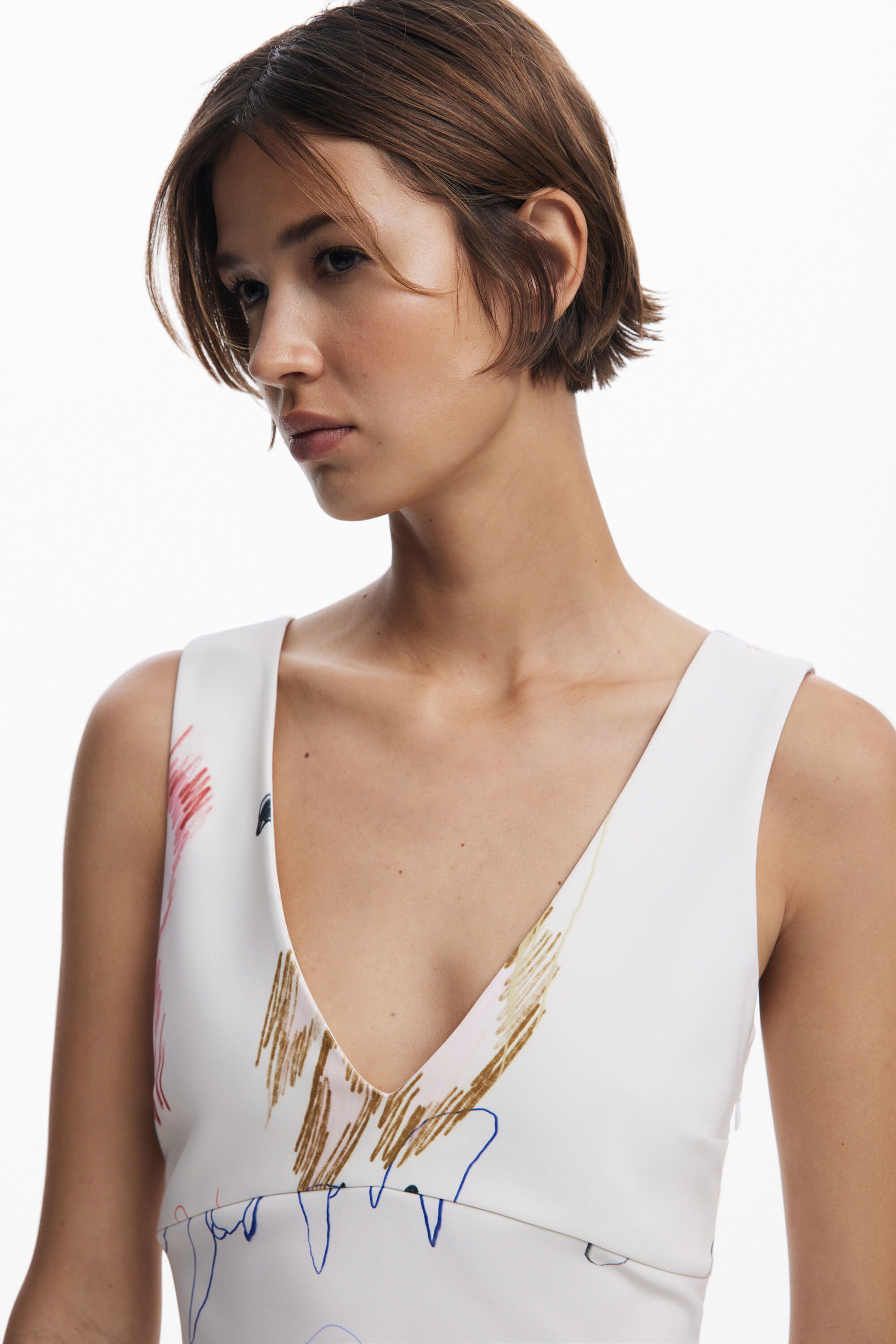 Abito corto stile scamiciato, senza maniche, con scollo a V e stampa a tratti in diversi colori.Stampa ArtyFit: RegularCollo: a VSenza manicheLunghezza: CortoChiusura: con cernieraStampa a contrasto di coloreRealizzato con materiali sostenibiliCollezione AW25Progettato a BarcellonaPoliestere riciclato