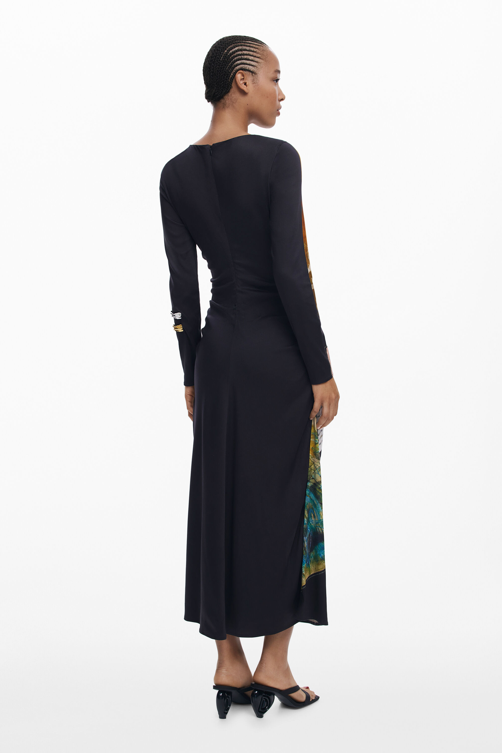 Abito a manica lunga, collo rotondo, orlo asimmetrico, arricciatura laterale e stampa tipo collage.Stampa ArtyVestibilità: SlimCollo: rotondoManica: LungaLunghezza: MidiChiusura: con cernieraArricciatura lateraleRealizzato con materiali sostenibiliCollezione AW25Progettato a BarcellonaViscosa Lenzing™ EcoVero™