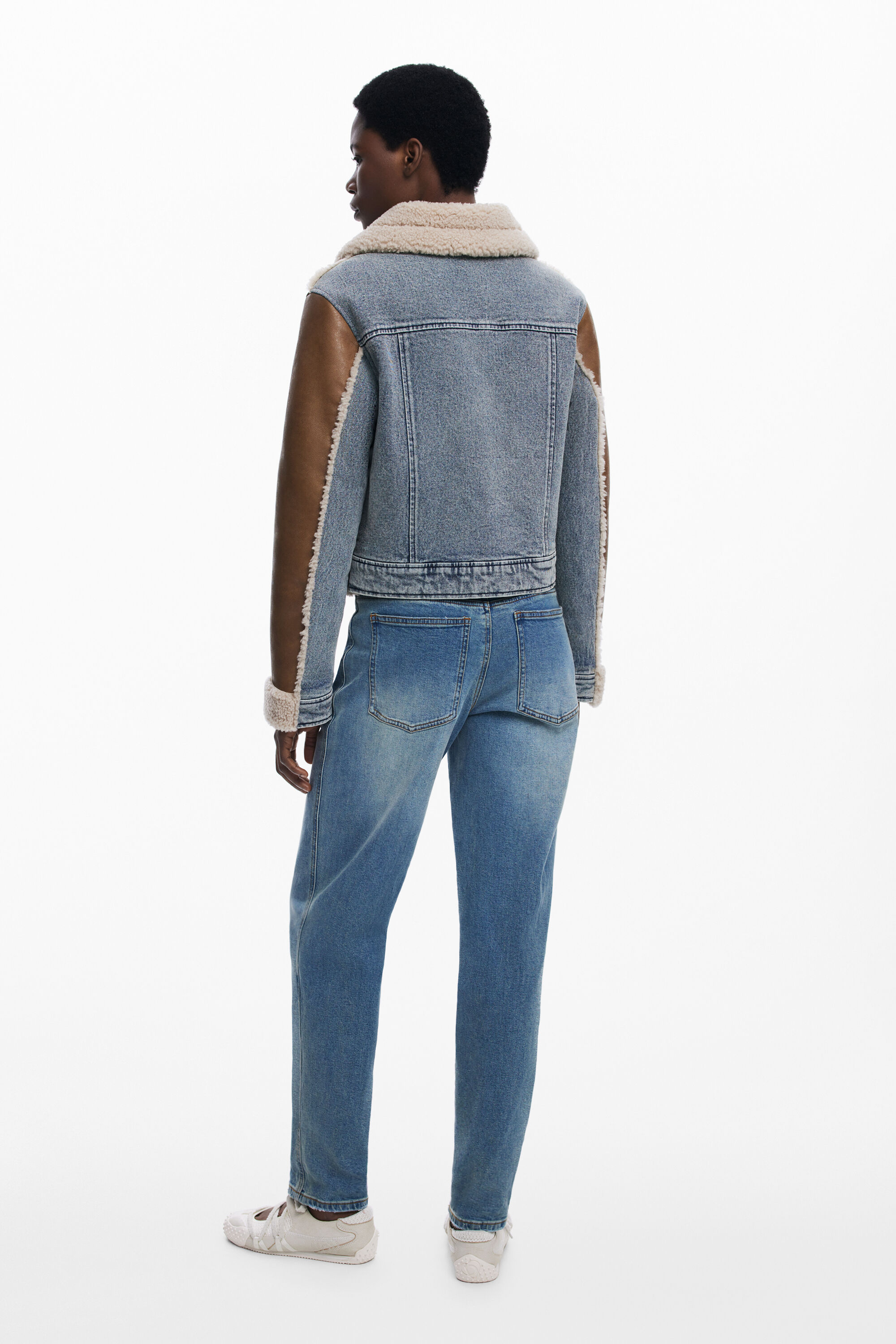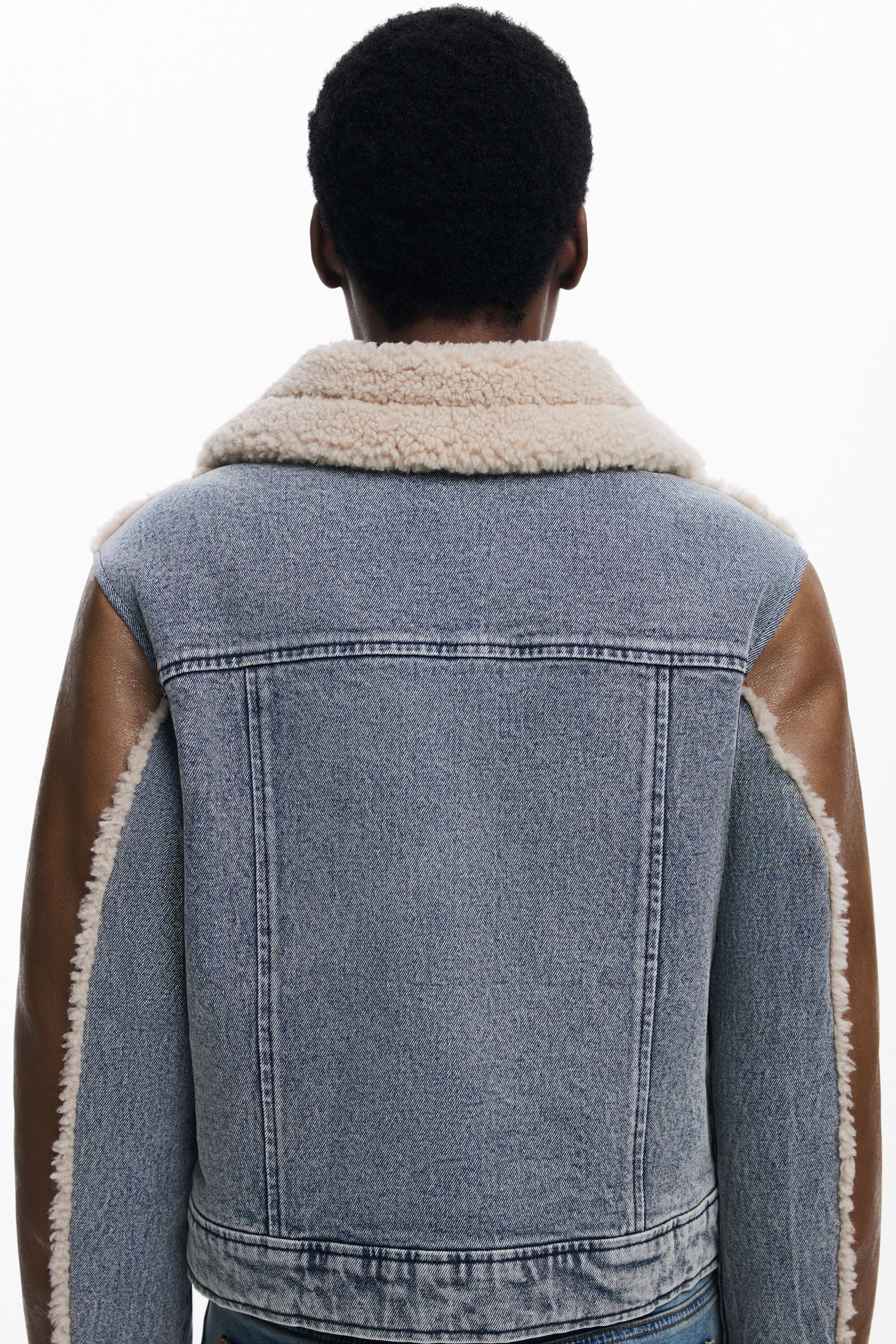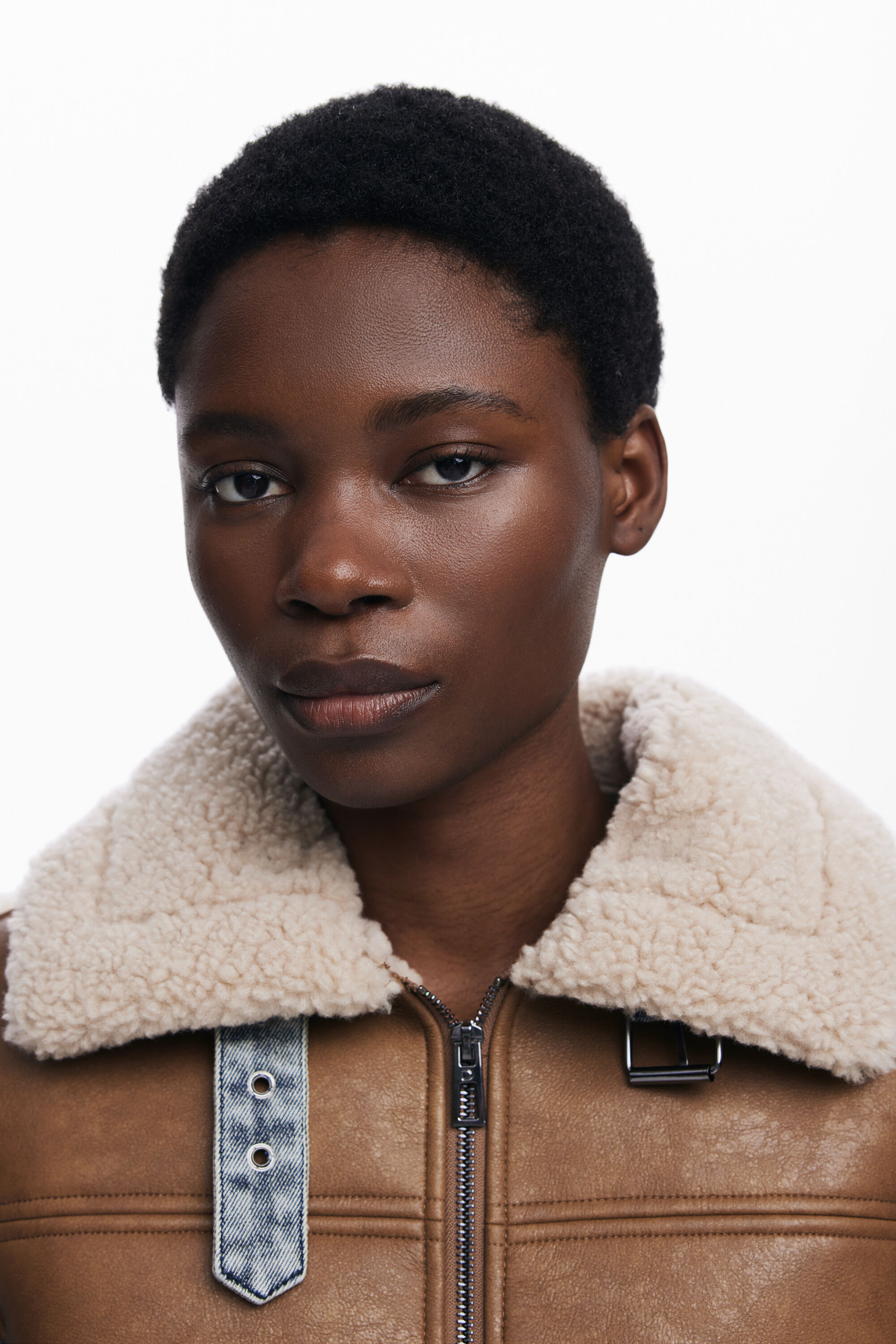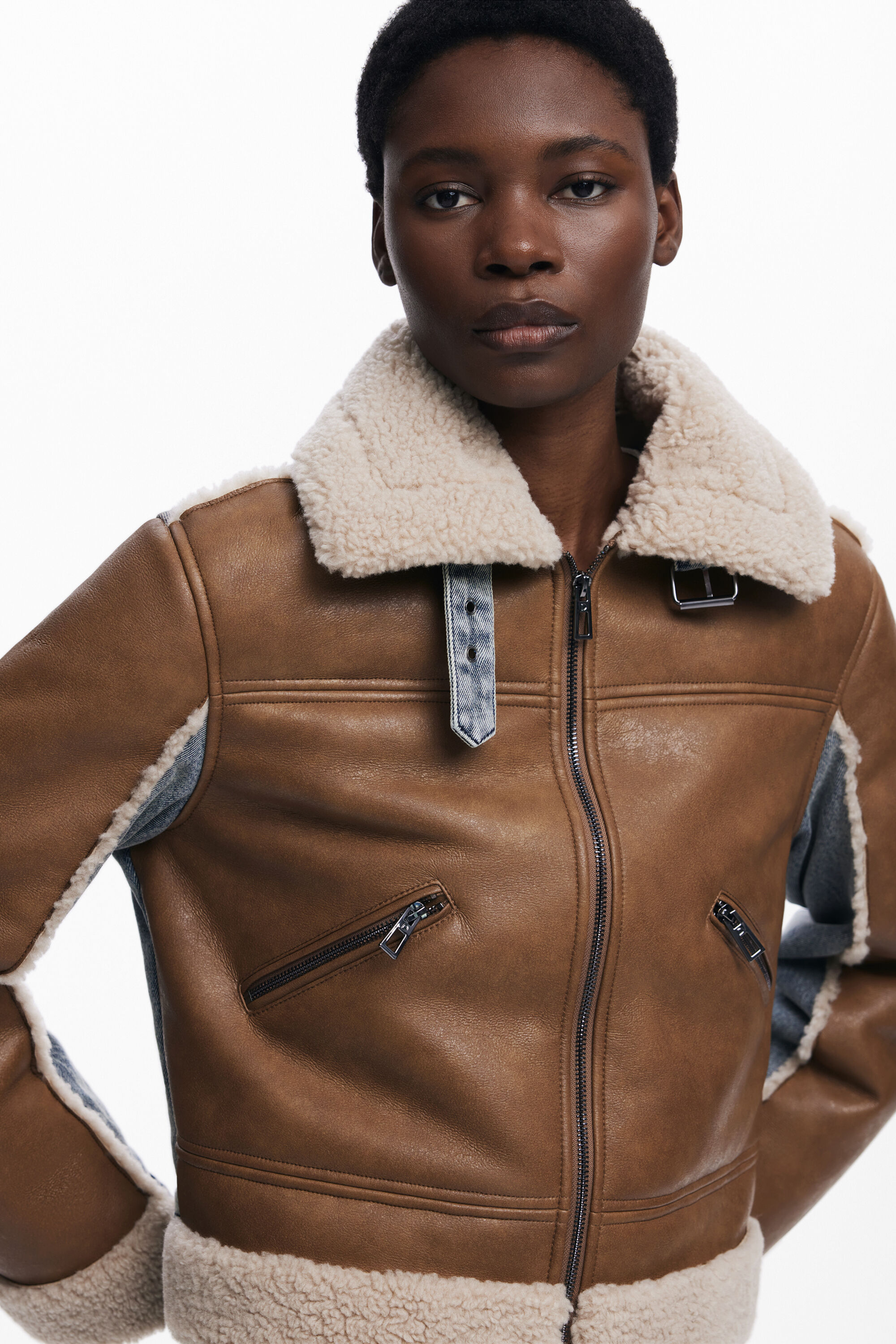 Giacca corta stile aviatore in effetto pelle combinata con tessuto denim, chiusura con cerniera e collo e finiture in montone sintetico.Fit: RegularColletto: a camiciaManica: LungaTasche anterioriChiusura: con cernieraCombinazione di tessutiFiniture in montone sinteticoCollezione AW25Progettato a Barcellona