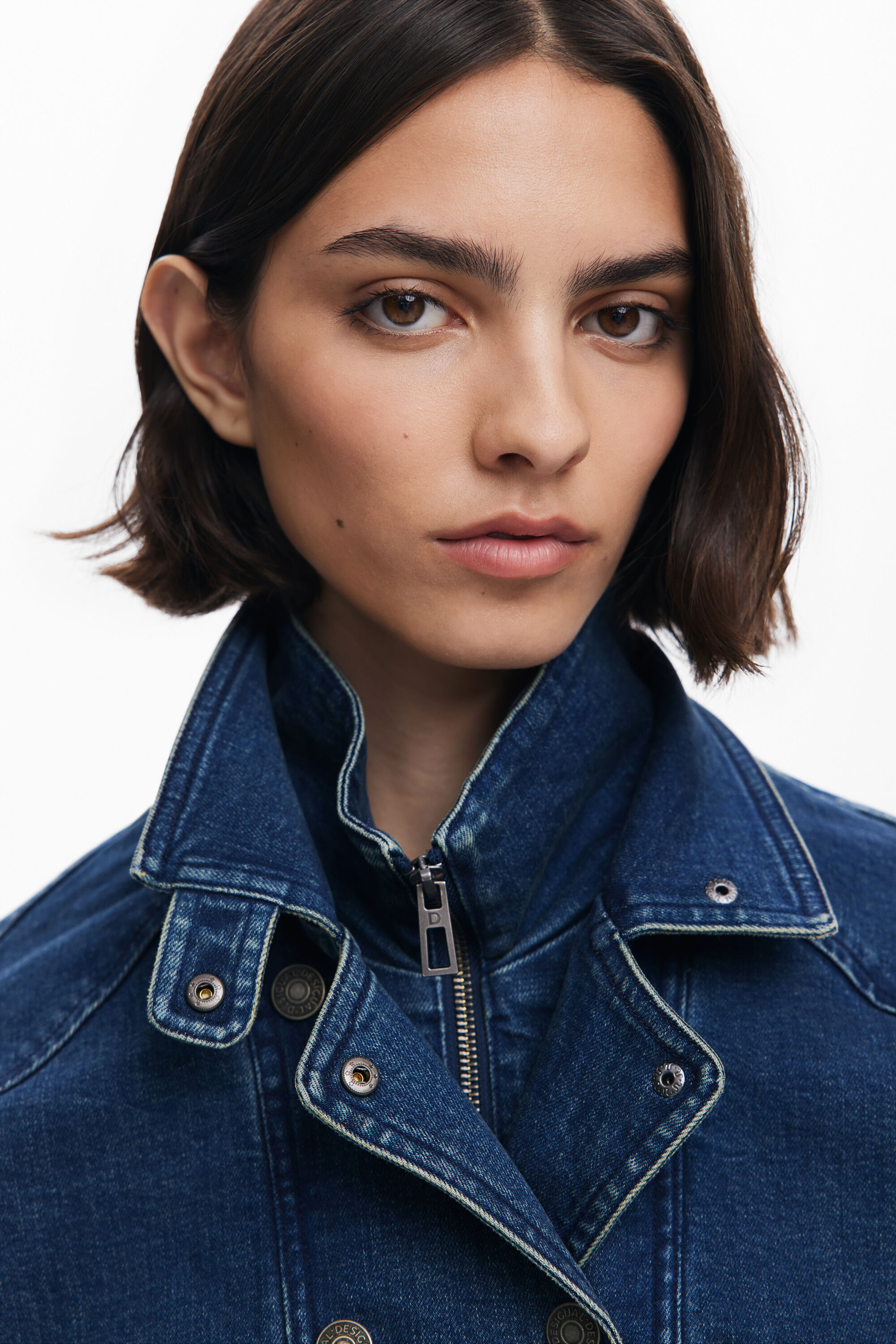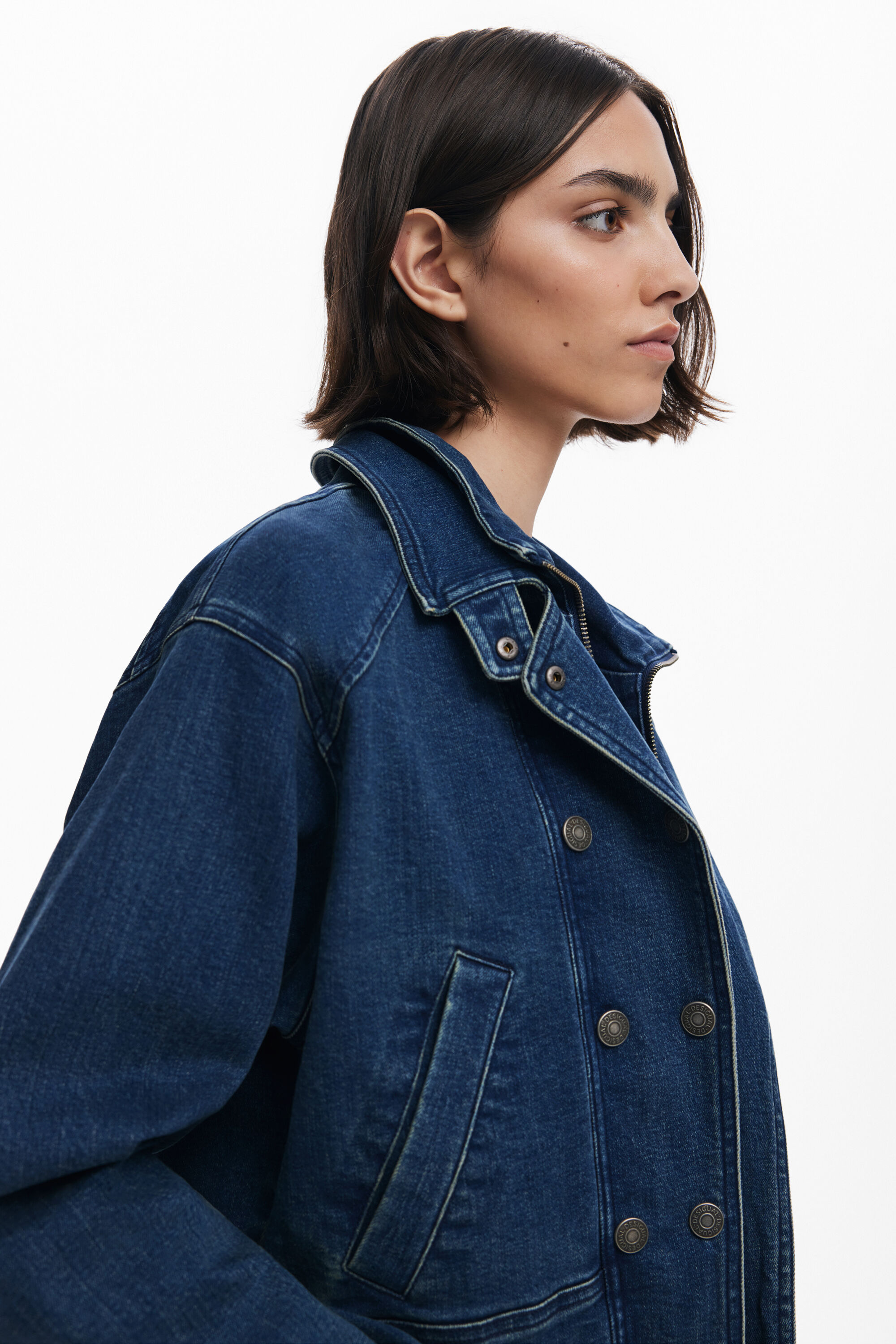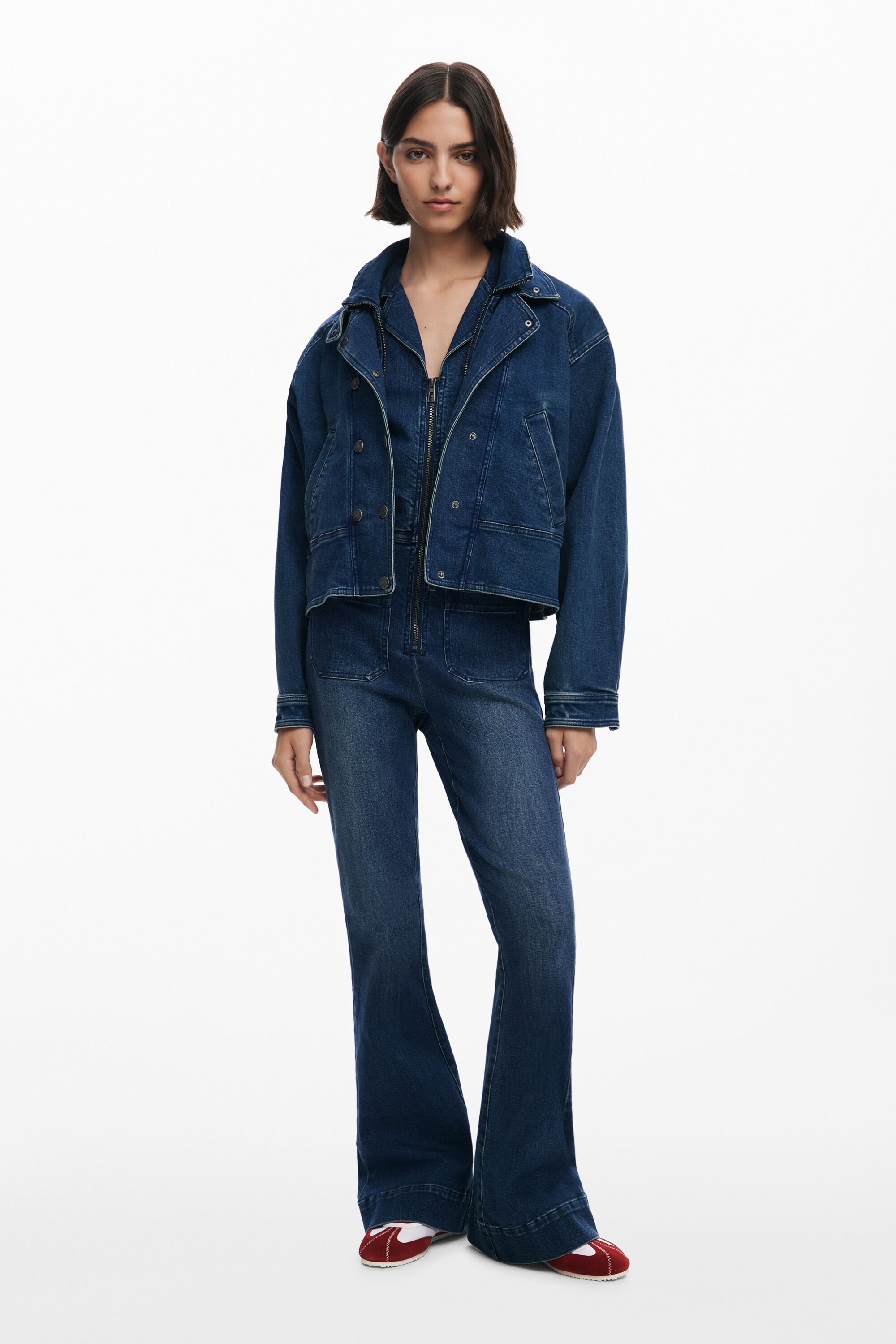 Giacca di jeans tipo Trucker, corta, aderente in vita, con doppio colletto e doppia abbottonatura anteriore.Colore: Tinta unitaFit: RegularDoppio collettoManica: LungaCroppedTasche anterioriChiusura: con cerniera e bottoneDoppia abbottonaturaRealizzato con materiali sostenibiliCollezione AW25Progettato a BarcellonaAcquistando prodotti in cotone di Desigual, stai sostenendo il nostro investimento in Better Cotton.