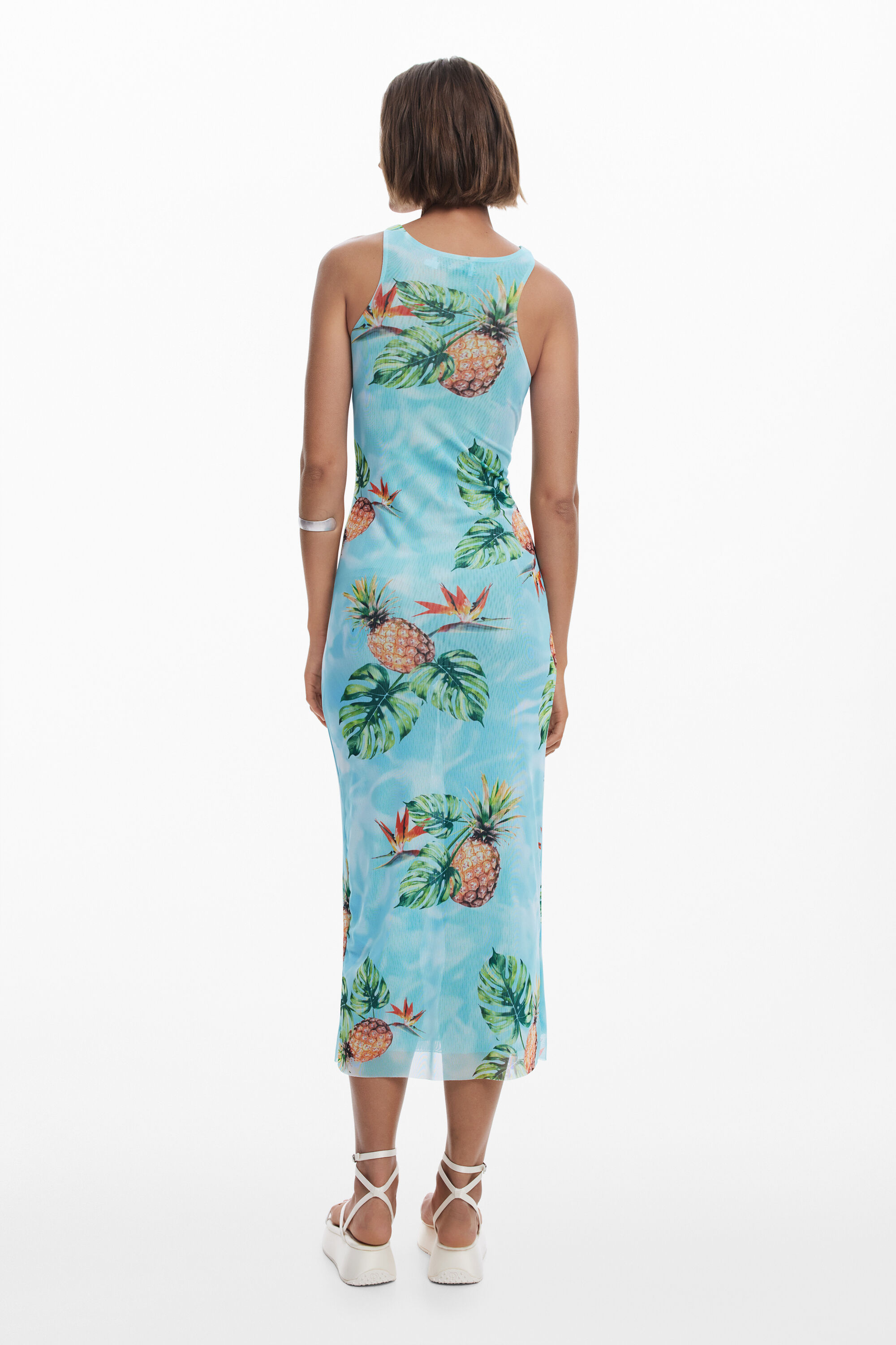 Sleeveless long dress with a knot at the neck creating a crossover effect, with a tropical design.