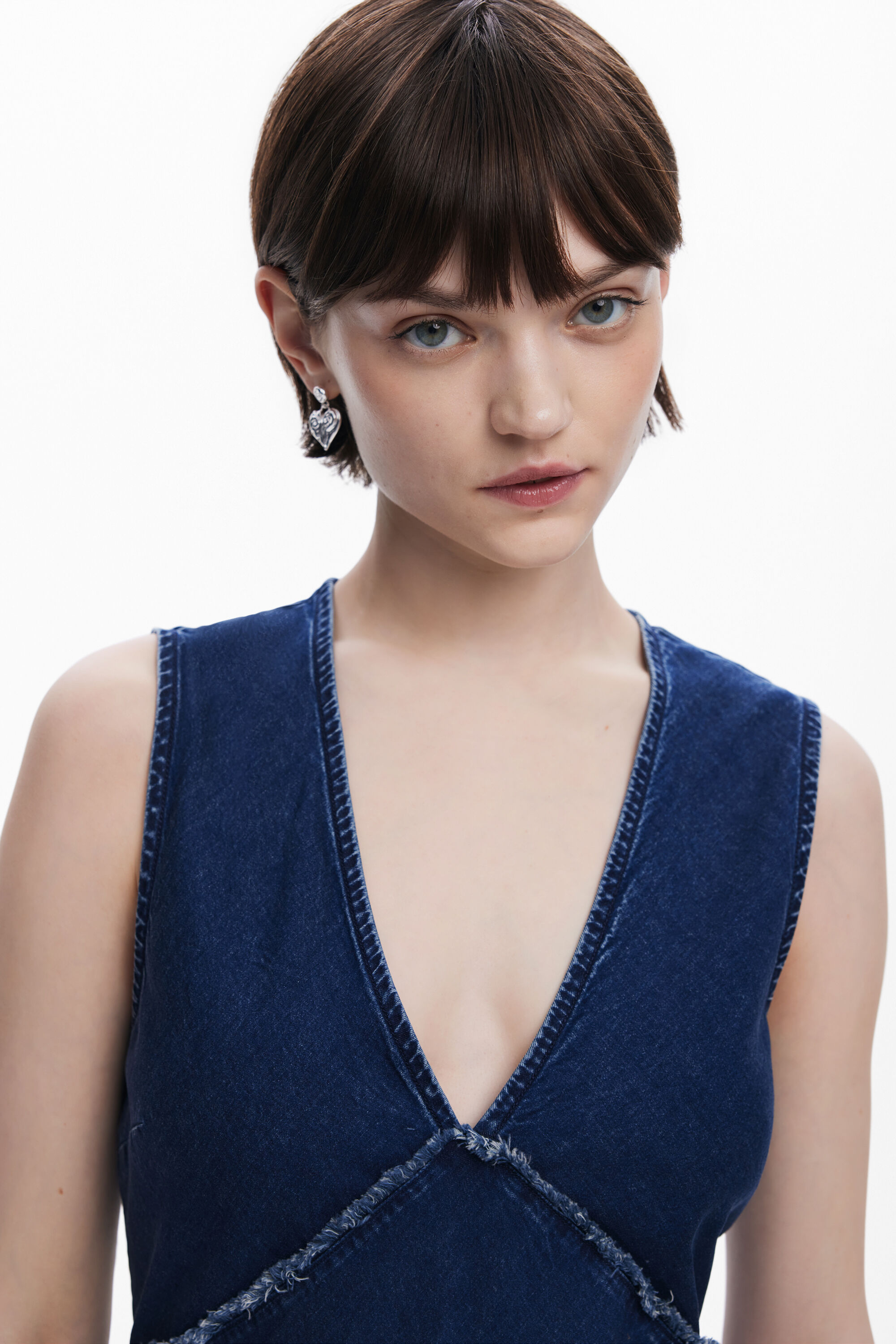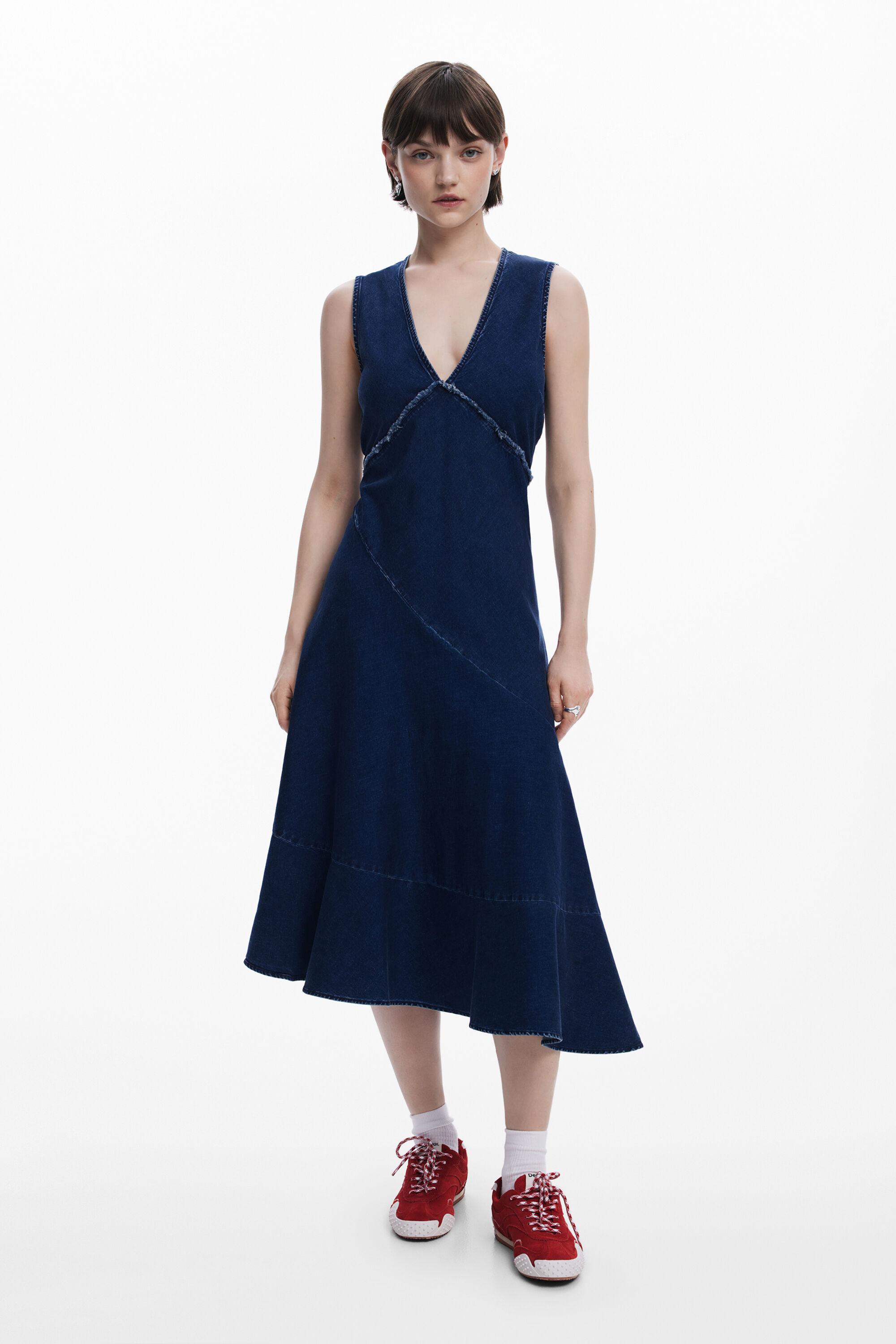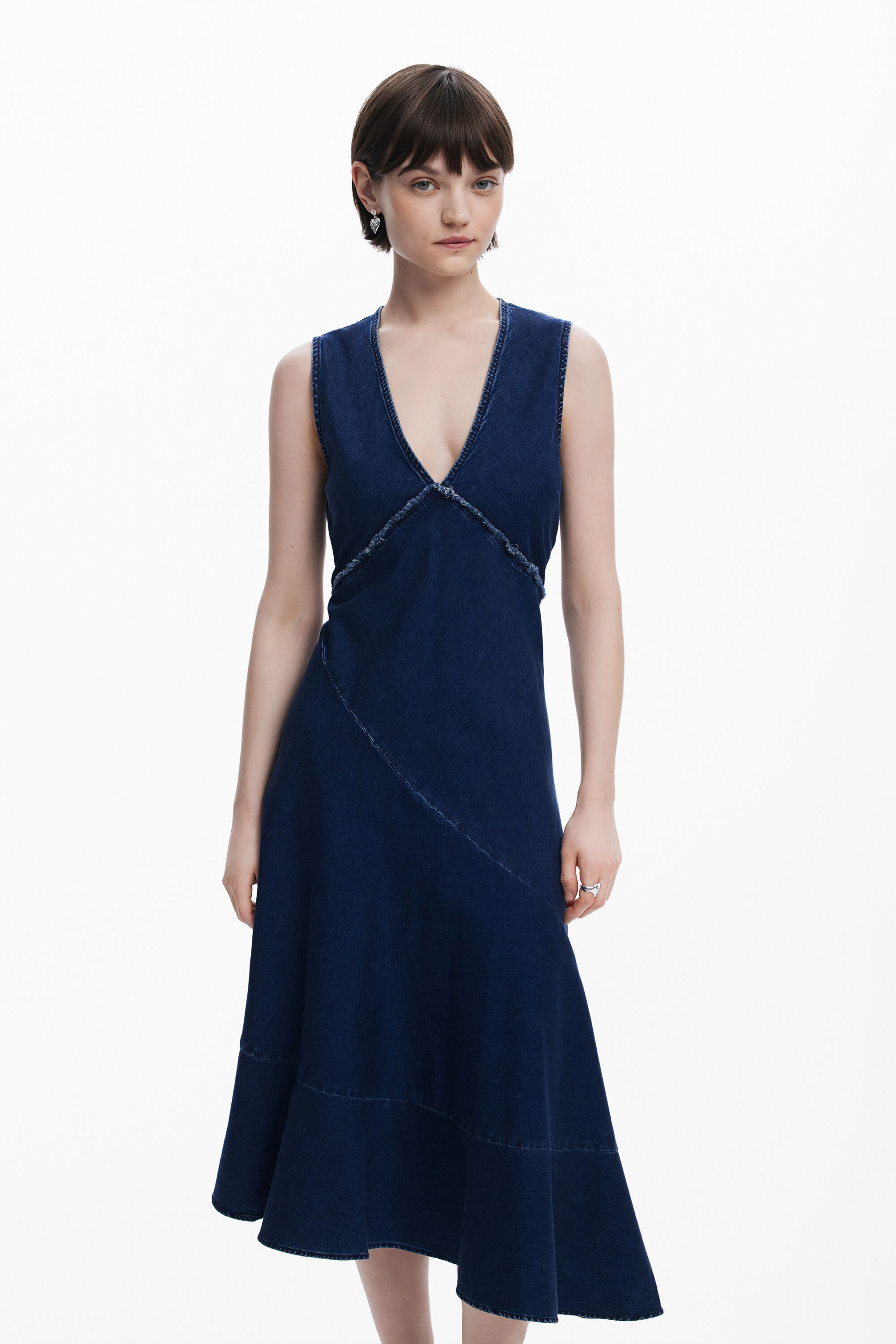 Midi dress in denim fabric, with a V-neckline, sleeveless, asymmetric hem, frayed seam detail, and zipper closure.Fit: