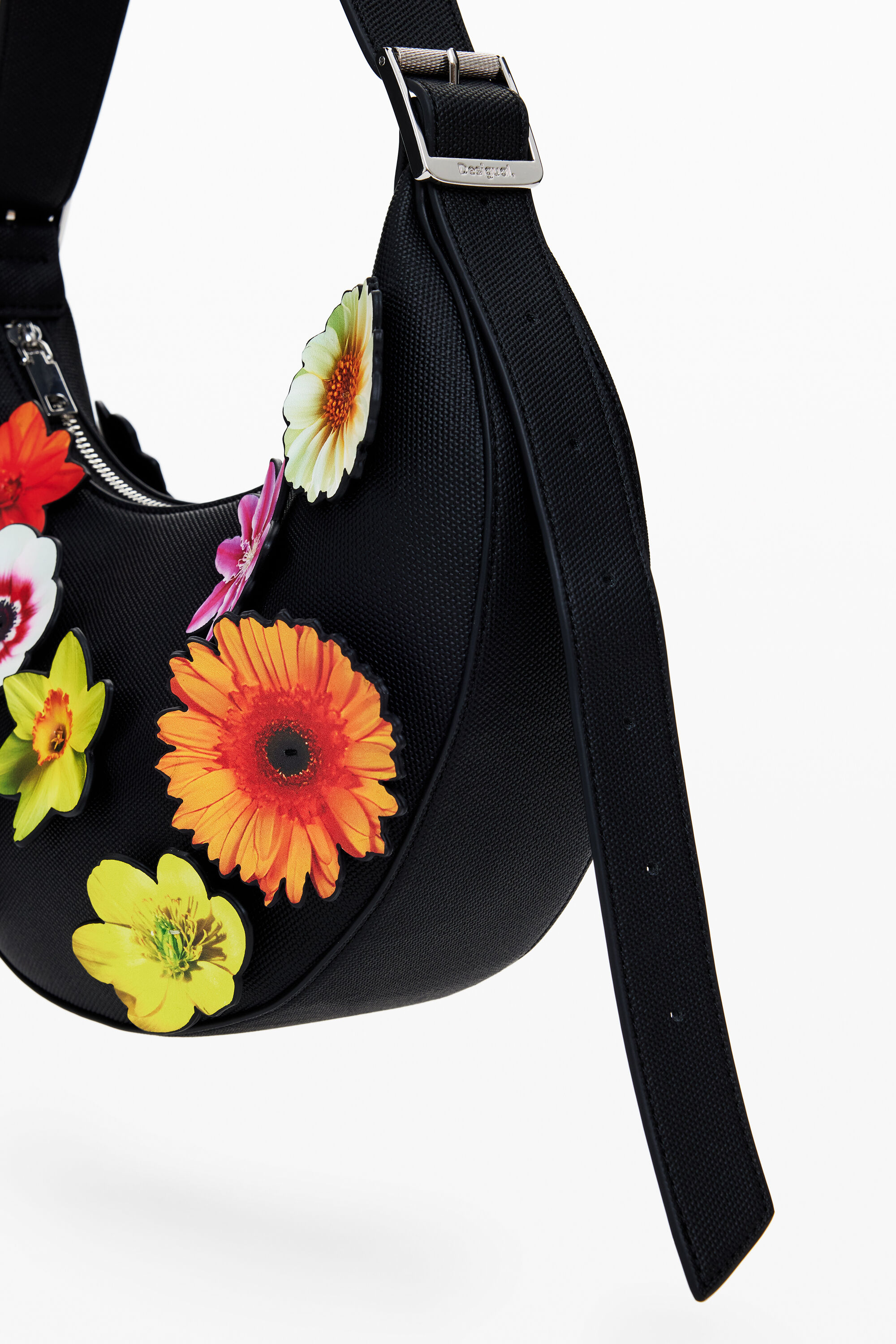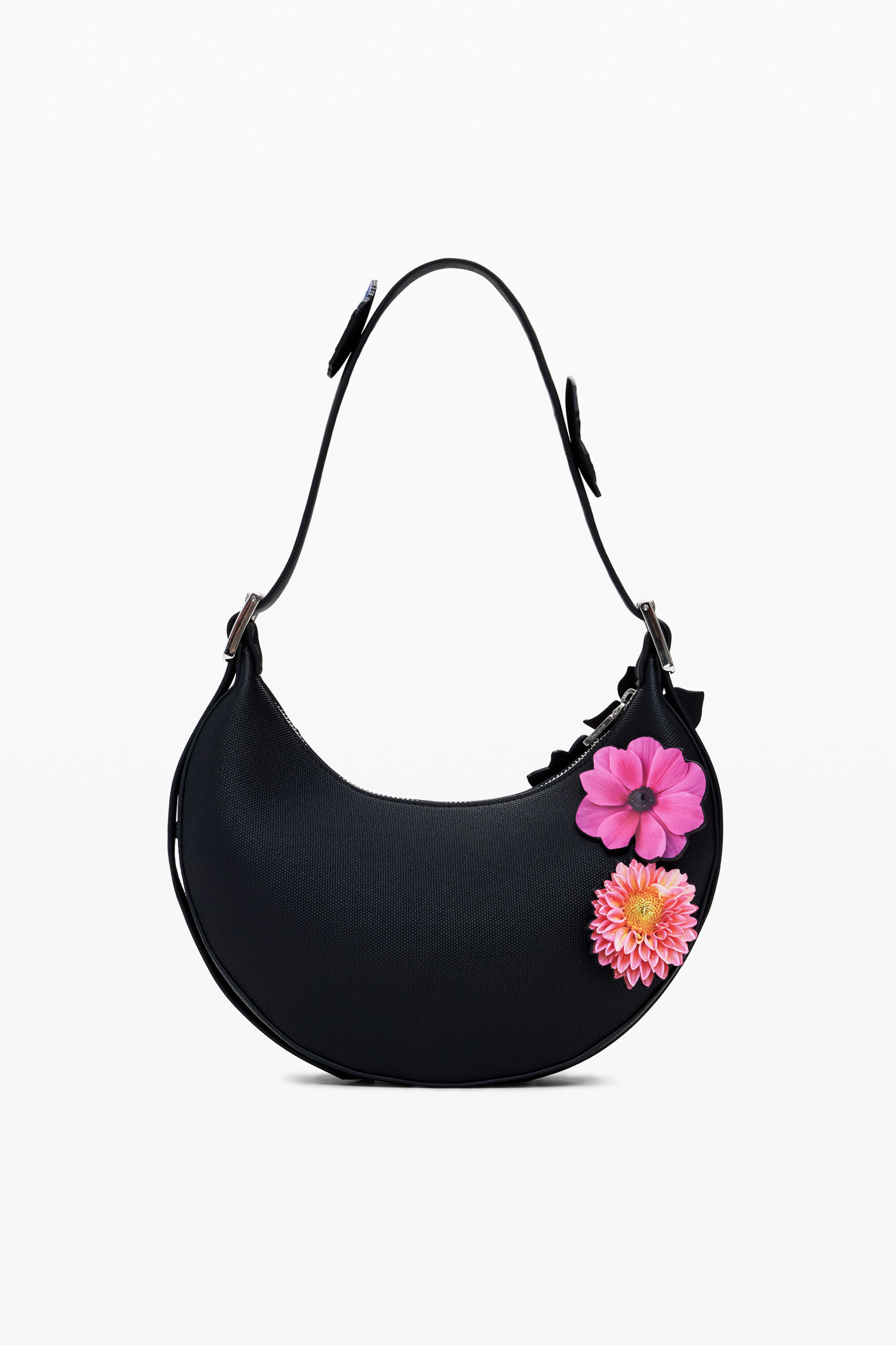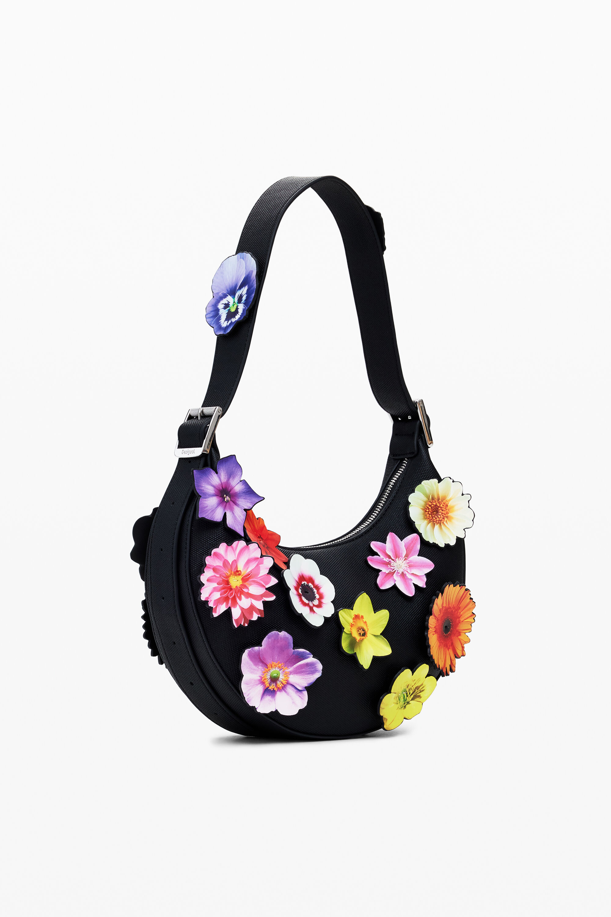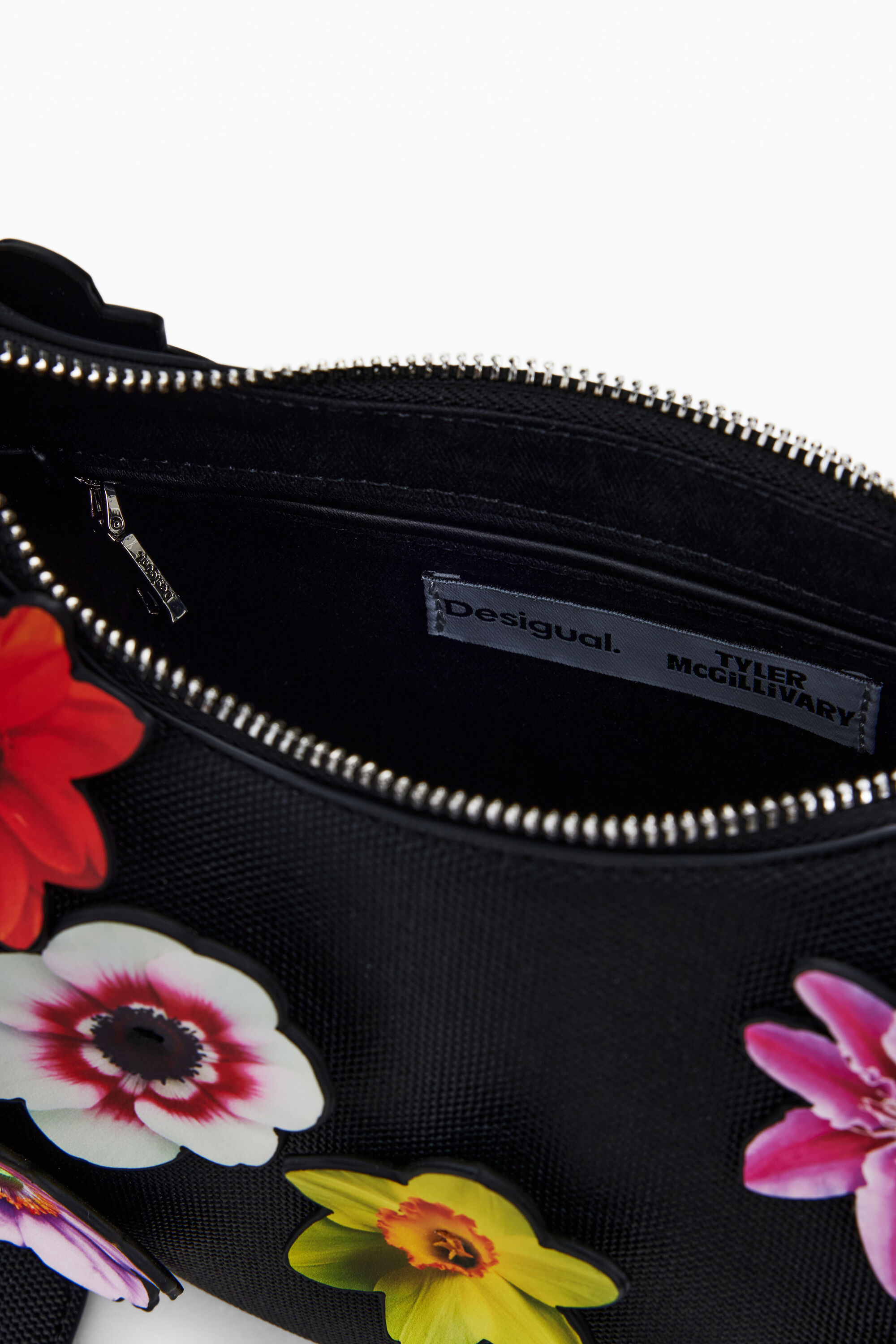 Medium shoulder bag in faux leather fabric with print and 3D flower appliqués designed by Tyler McGillivary.Leather effect