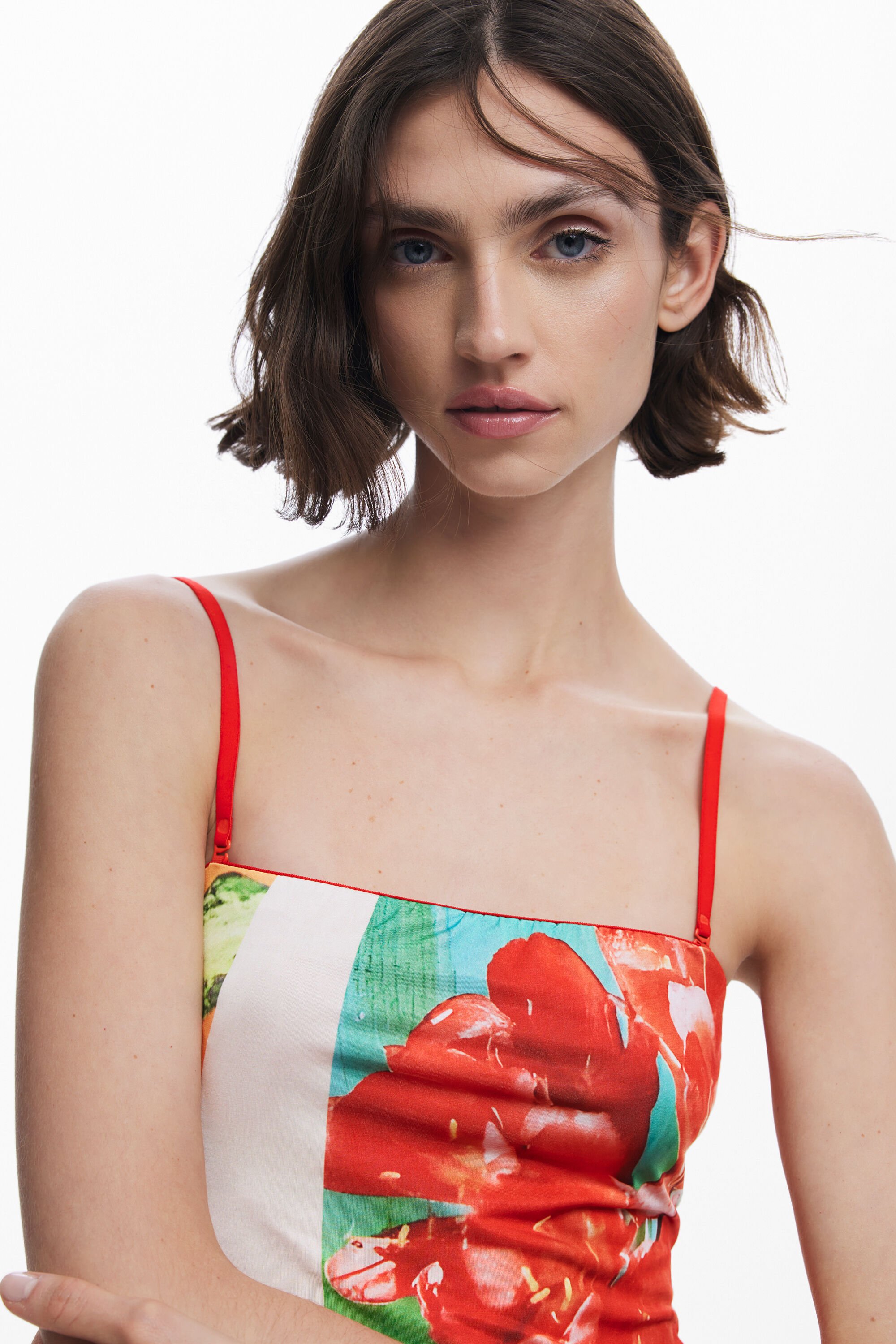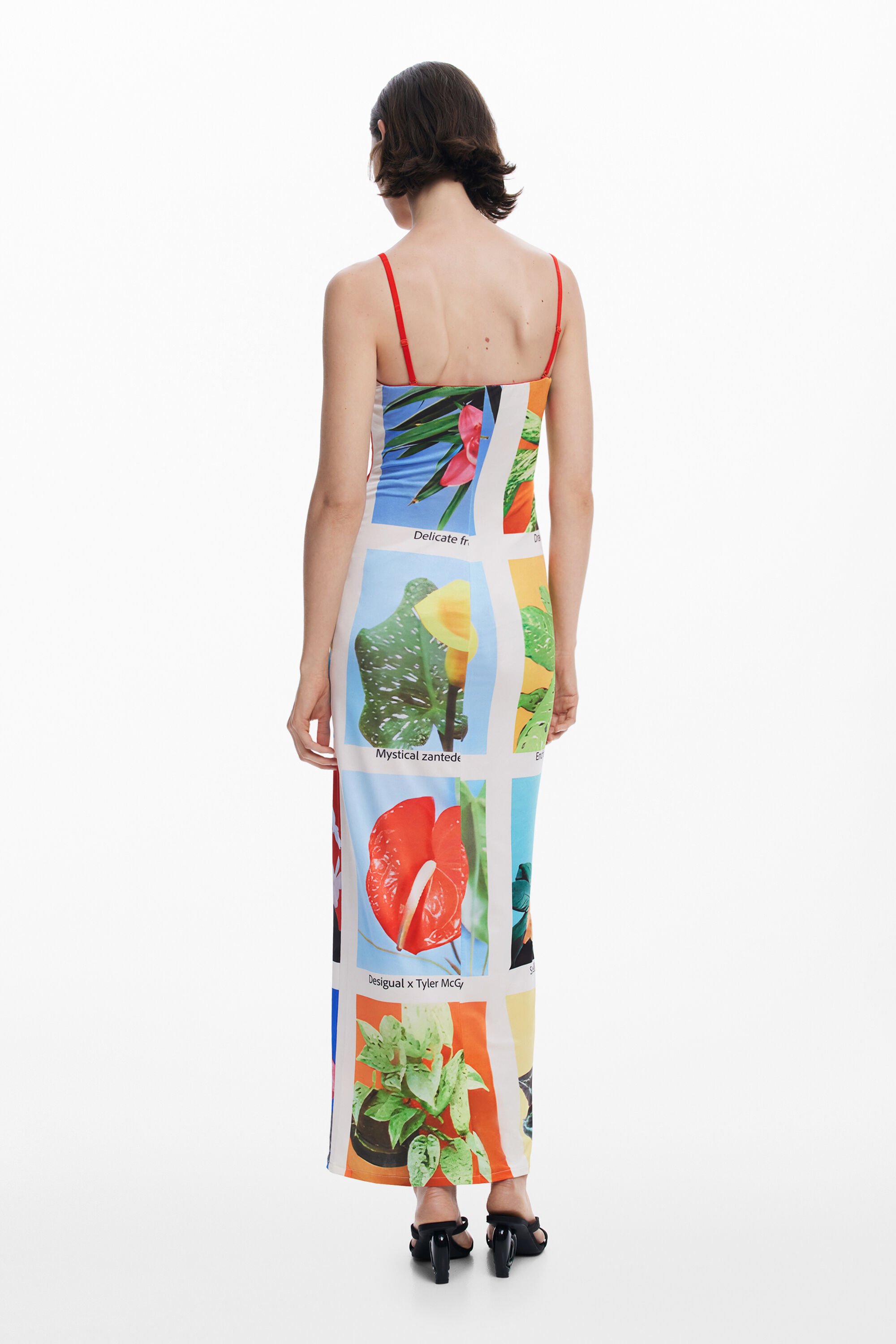 Long dress with a straight neckline, removable thin straps, and botanical postcard print designed by Tyler McGillivary.
