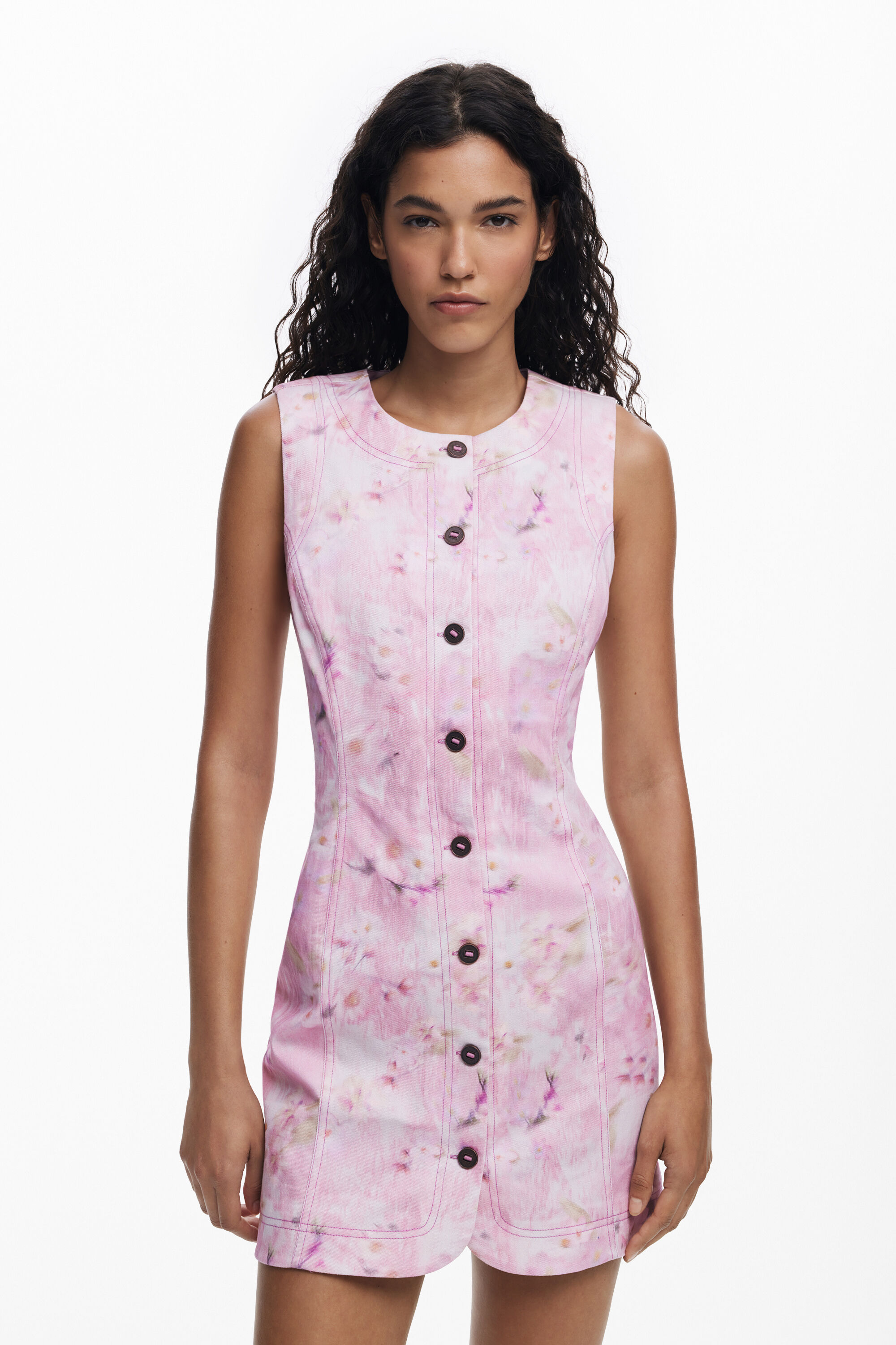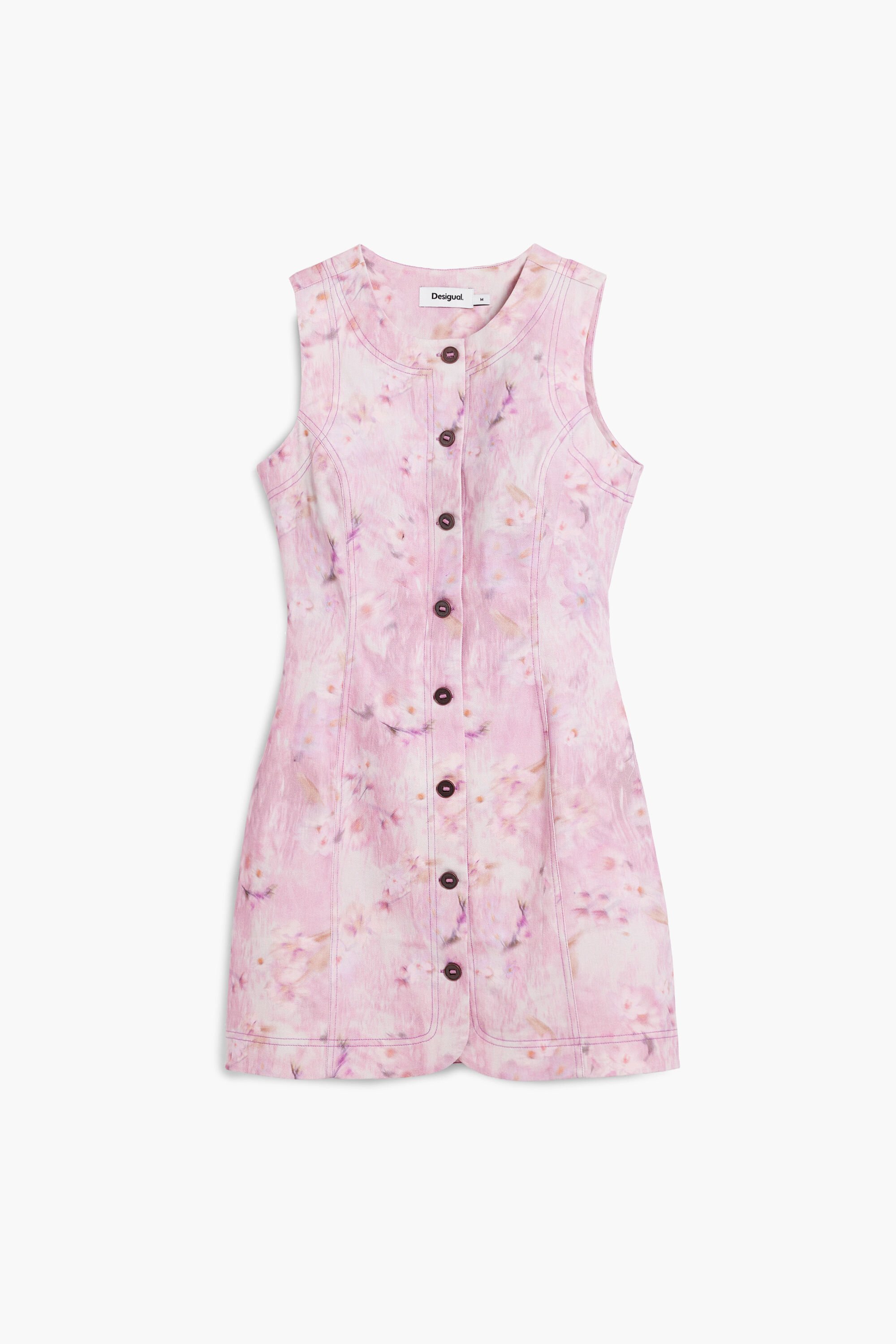 Sleeveless short dress in denim-effect fabric with elastic, buttoned at the front and floral print.Color: MulticolorFit: RegularNeckline: RoundSleevelessLength: ShortClosure: buttonedFabric with denim effectDecorative stitchingDesigned in BarcelonaBCI COTTONWhen you buy cotton products from Desigual, you are supporting our investment in Better Cotton.