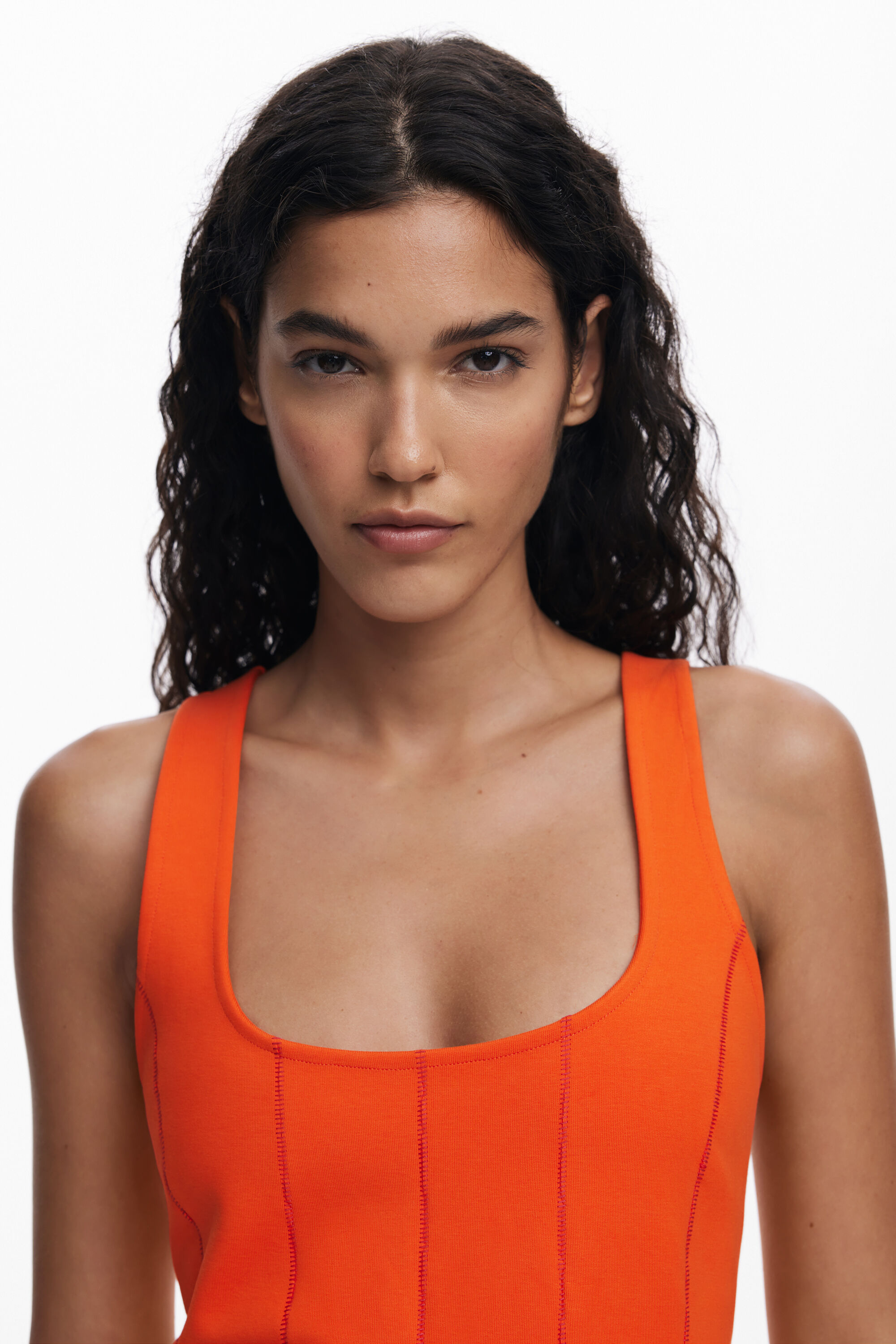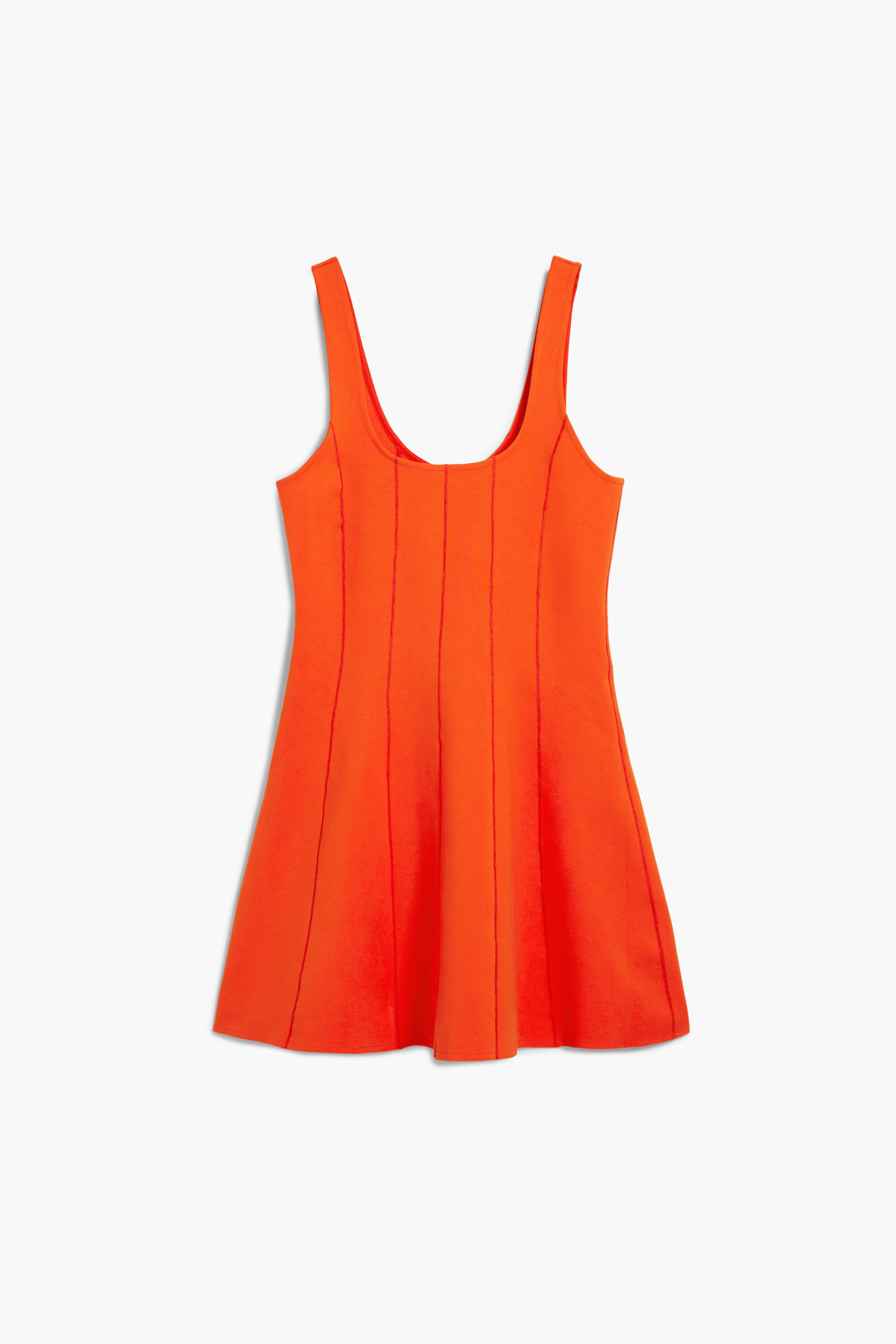 Fitted short dress with vertical panels, square neckline, and solid color straps.