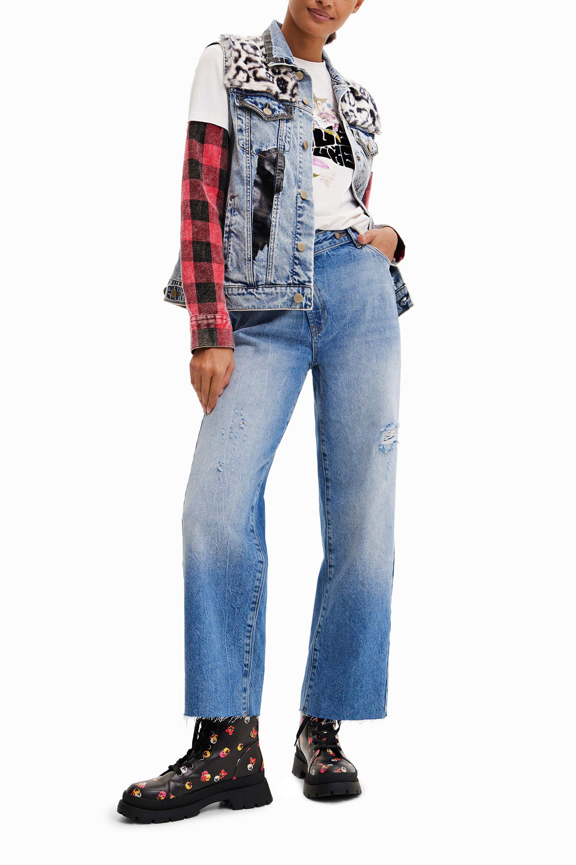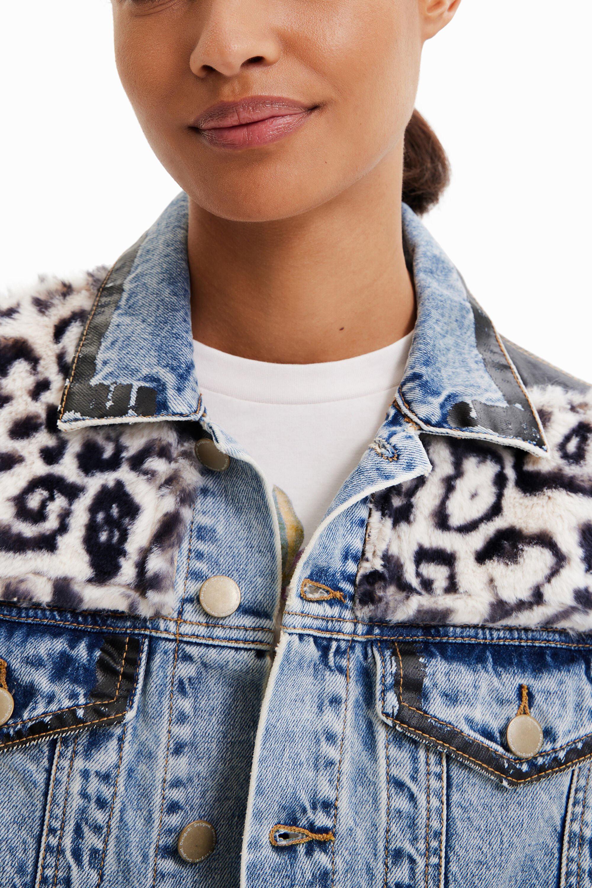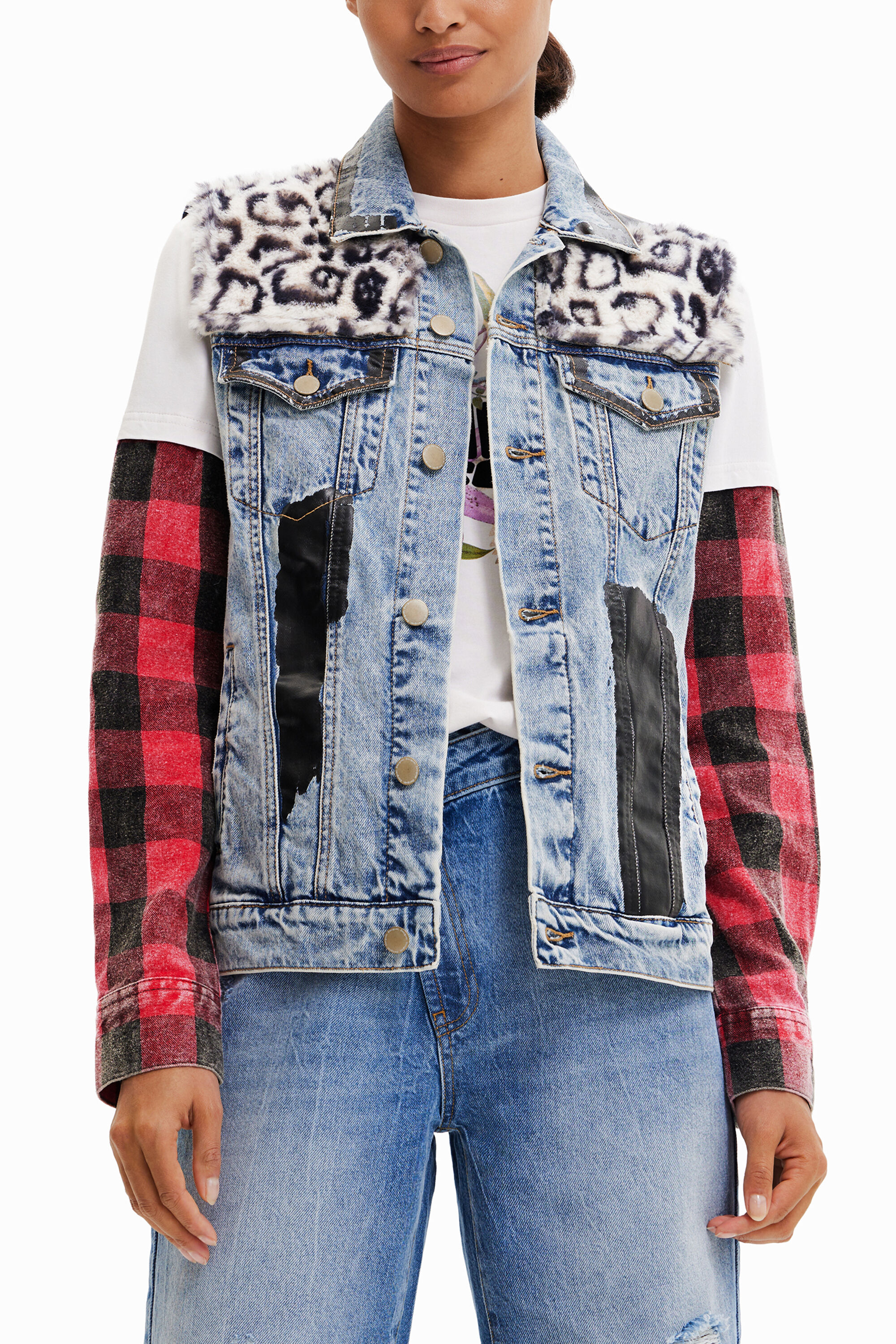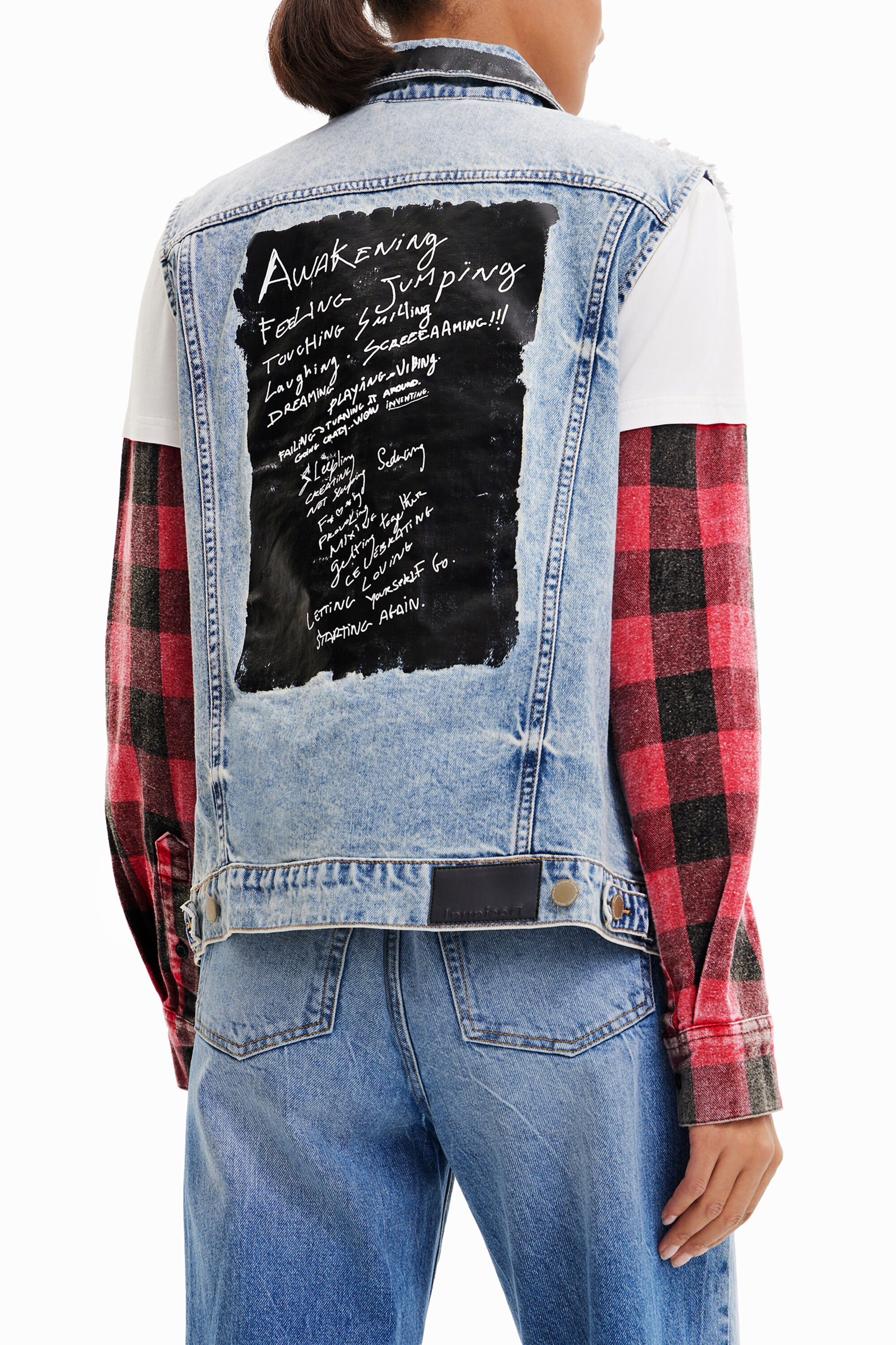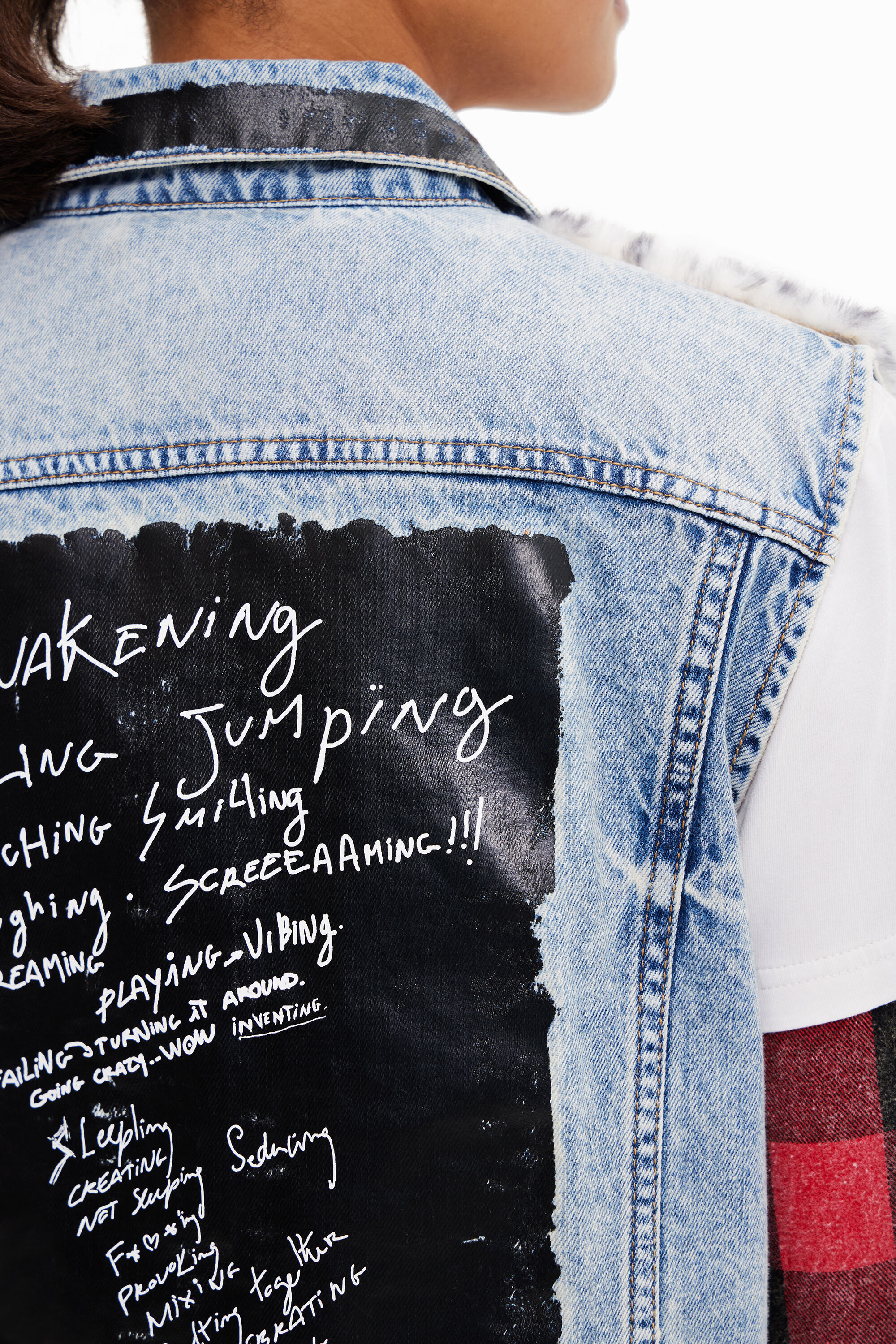 This denim gilet has a unique twist thanks to animal print patches on the top part and black brushstrokes with a hand-painted effect.