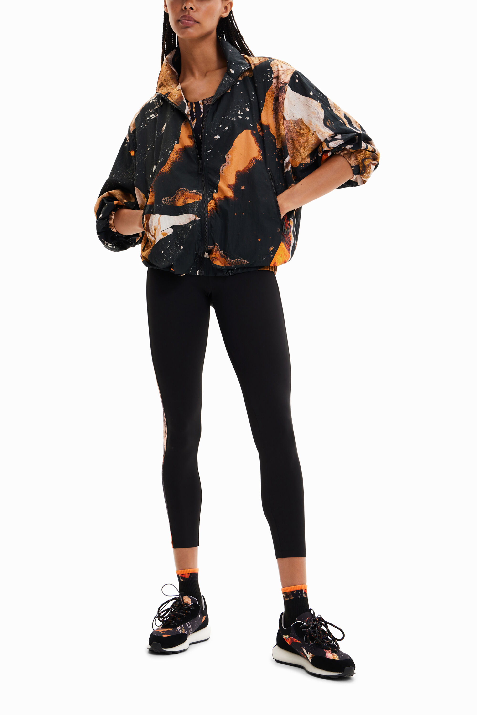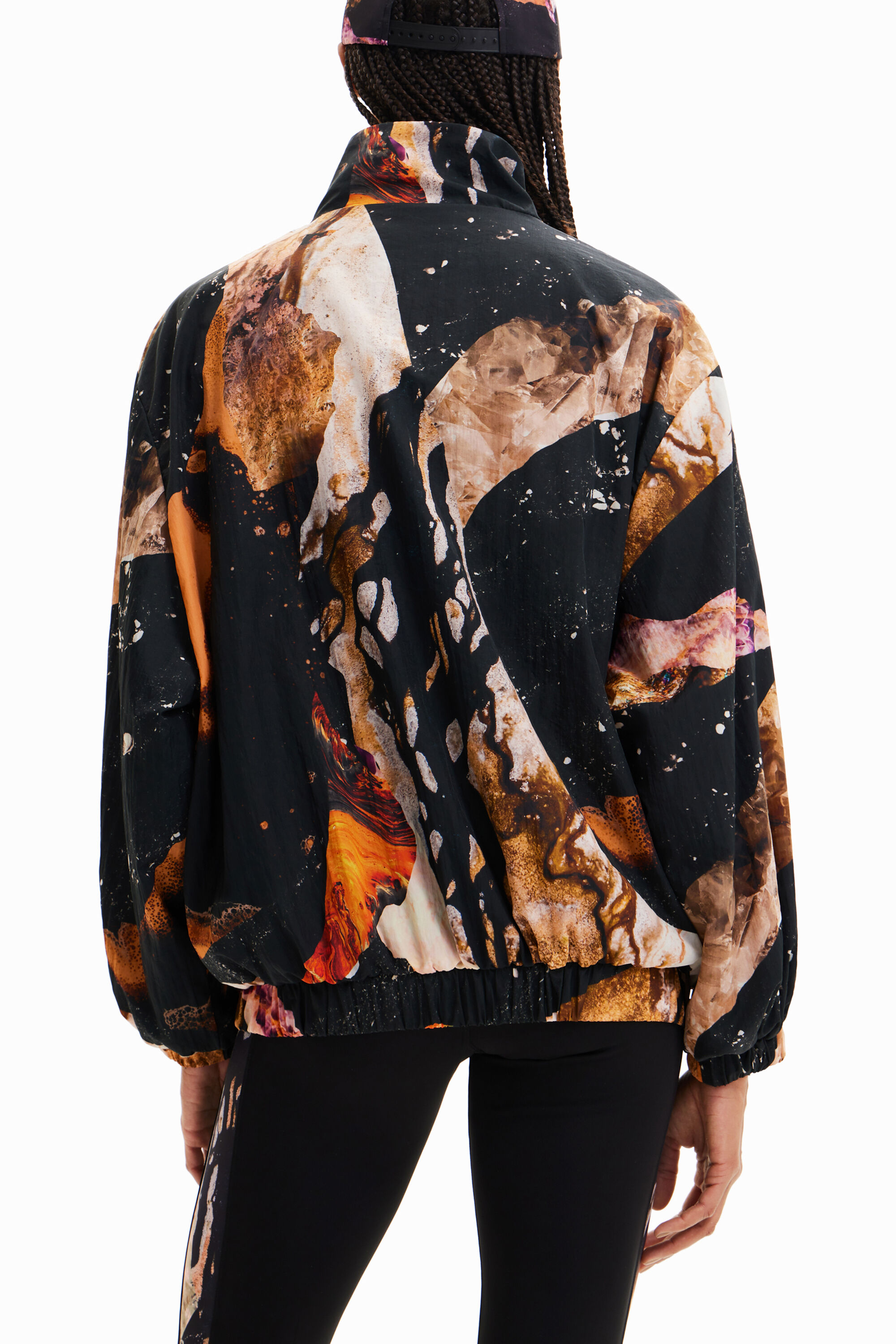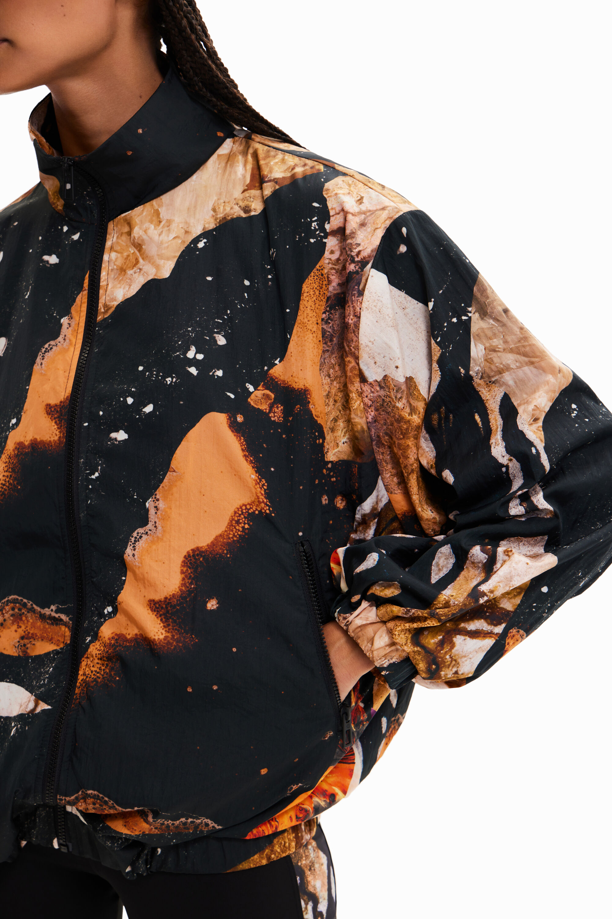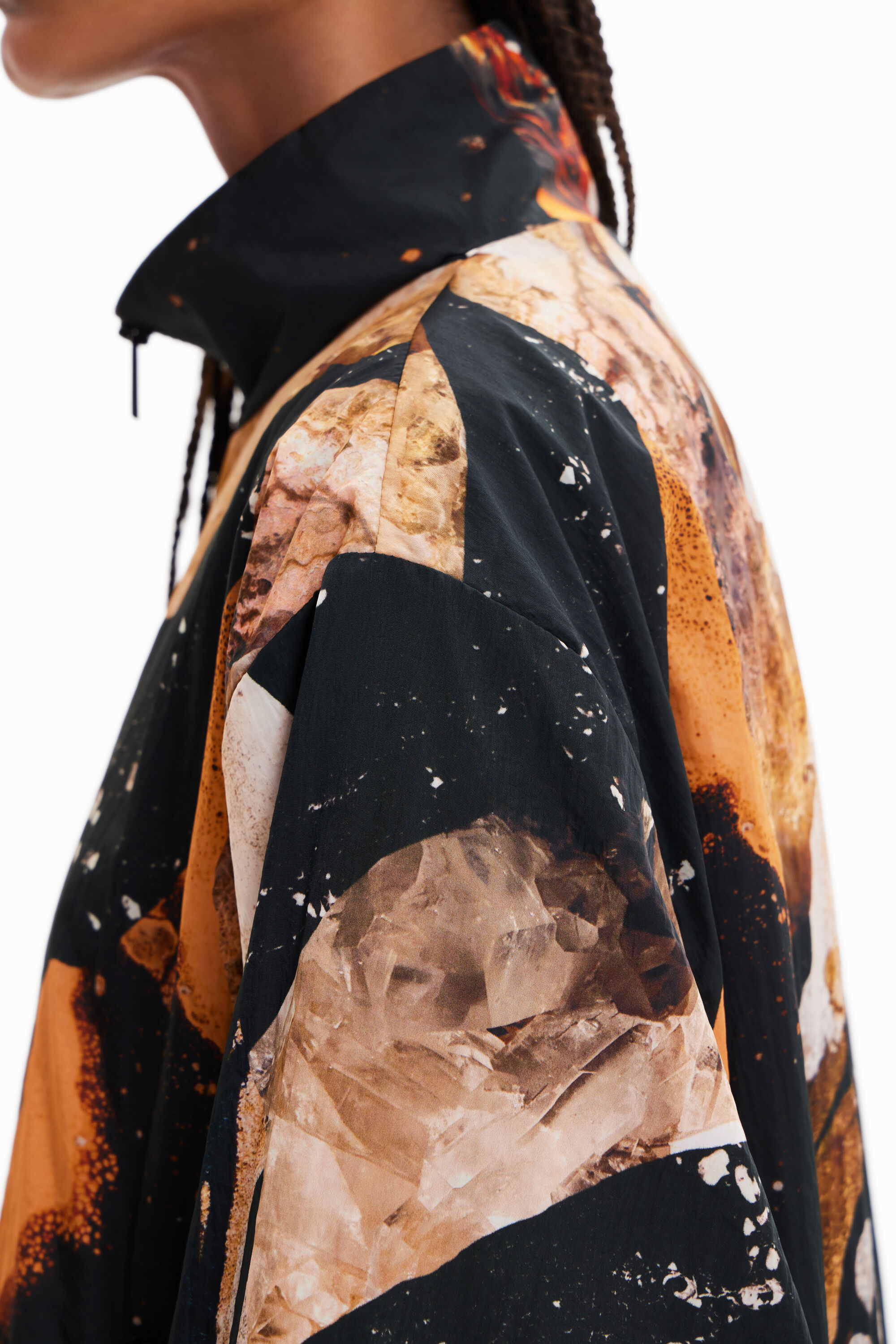 And this short, sporty jacket with a mineral-effect digital print is following the trend in the most original way.High collarZip closureTwo pocketsMineral-effect digital printElasticated cuffs: Sustainable fibres: recycled polyamideFit: OversizeLong sleeves