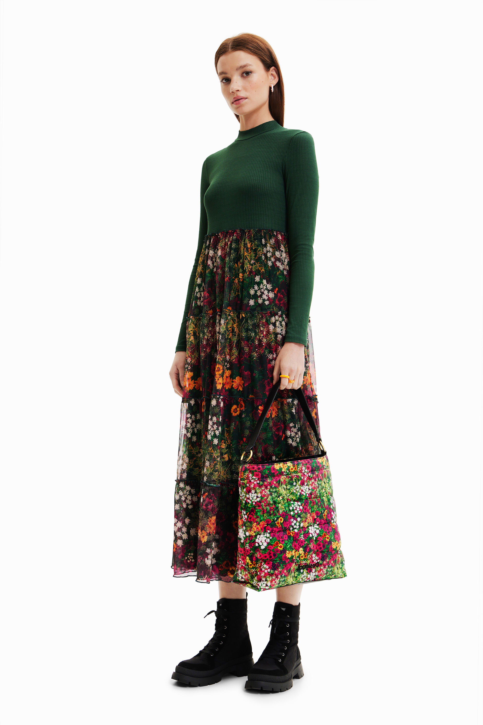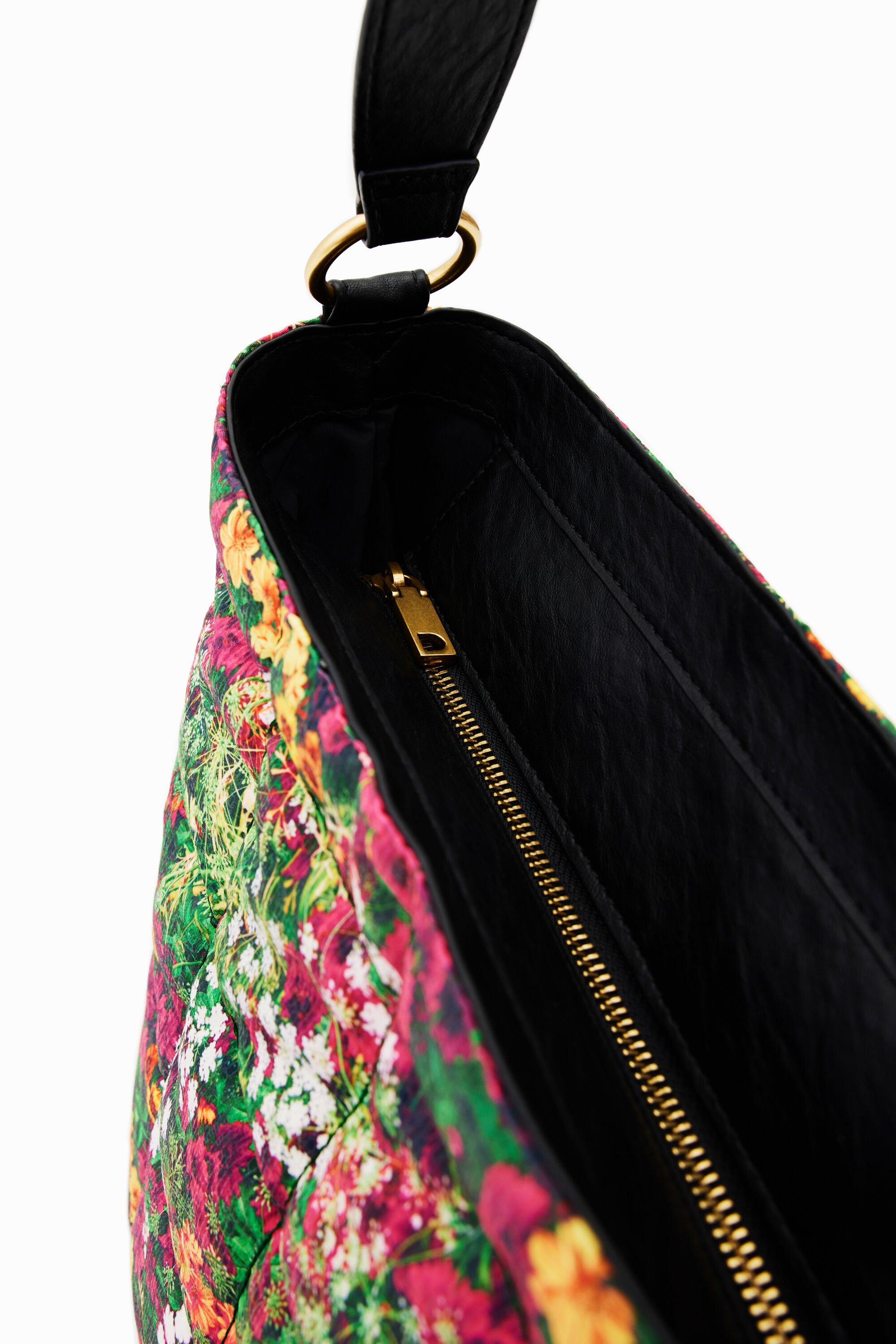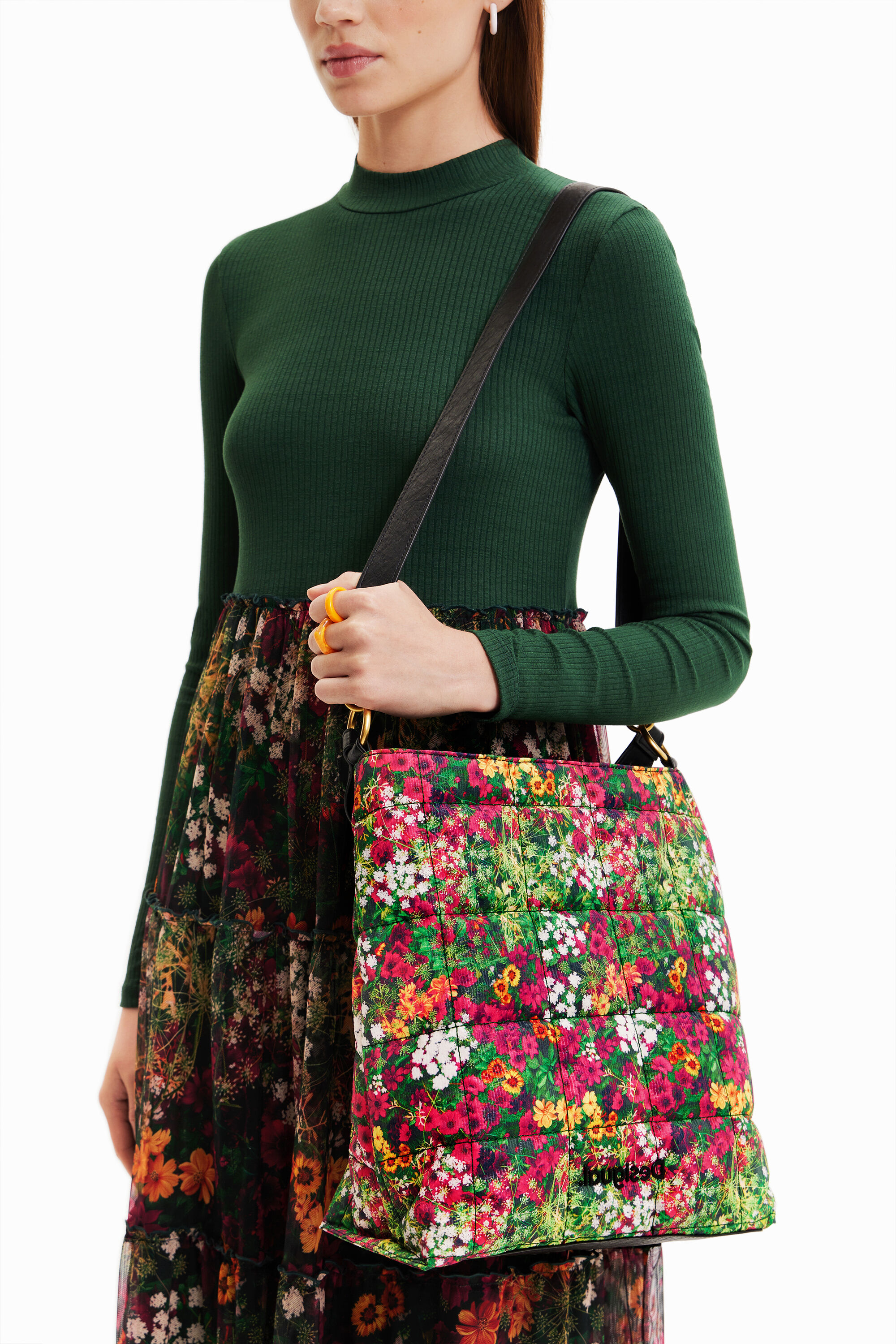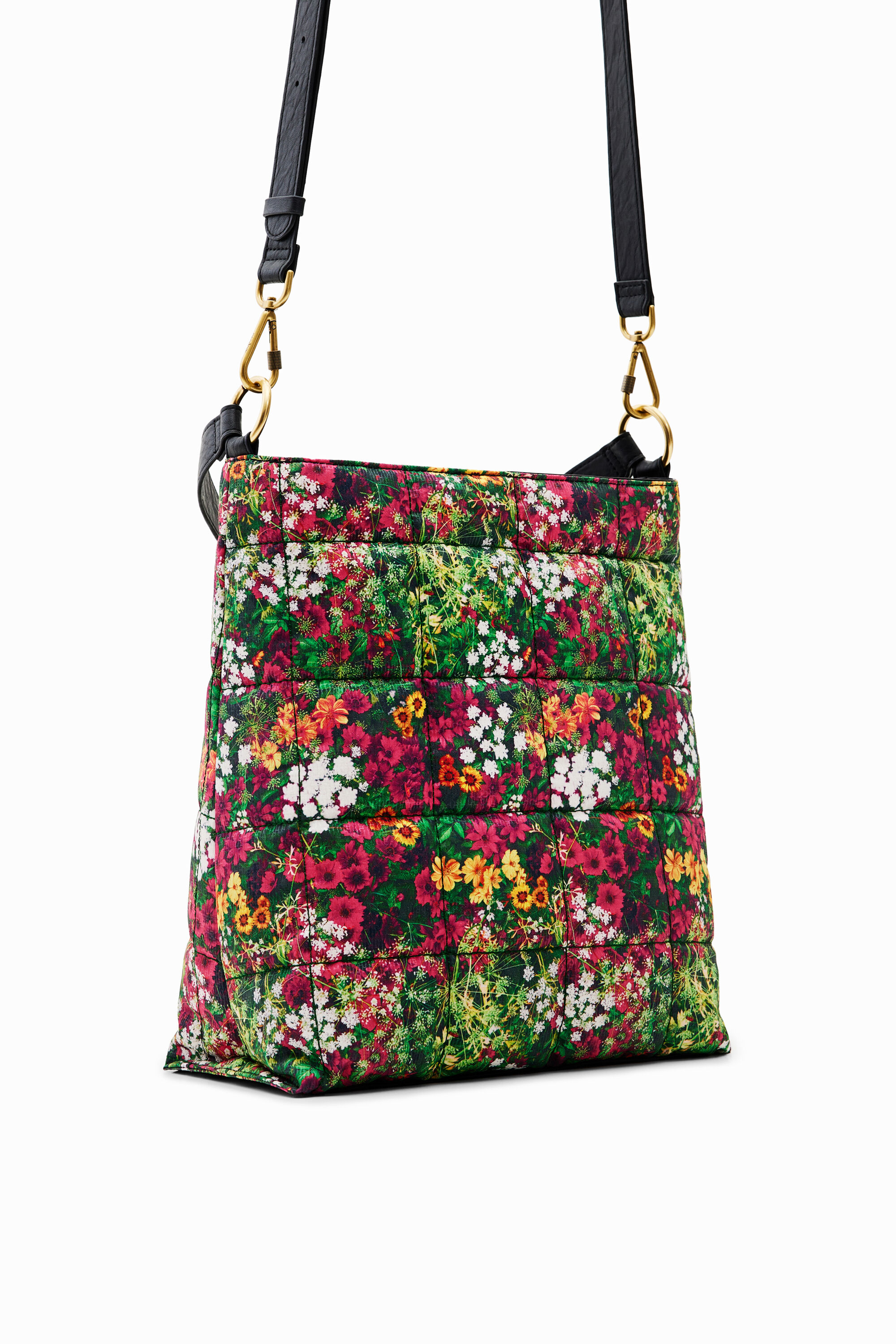 A very light shoulder bag with a mini flower print made from recycled fibres.