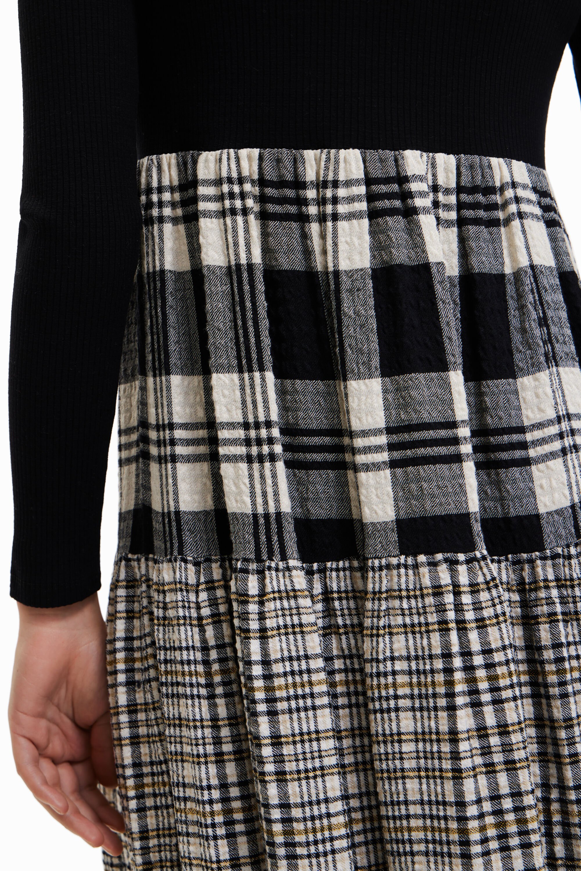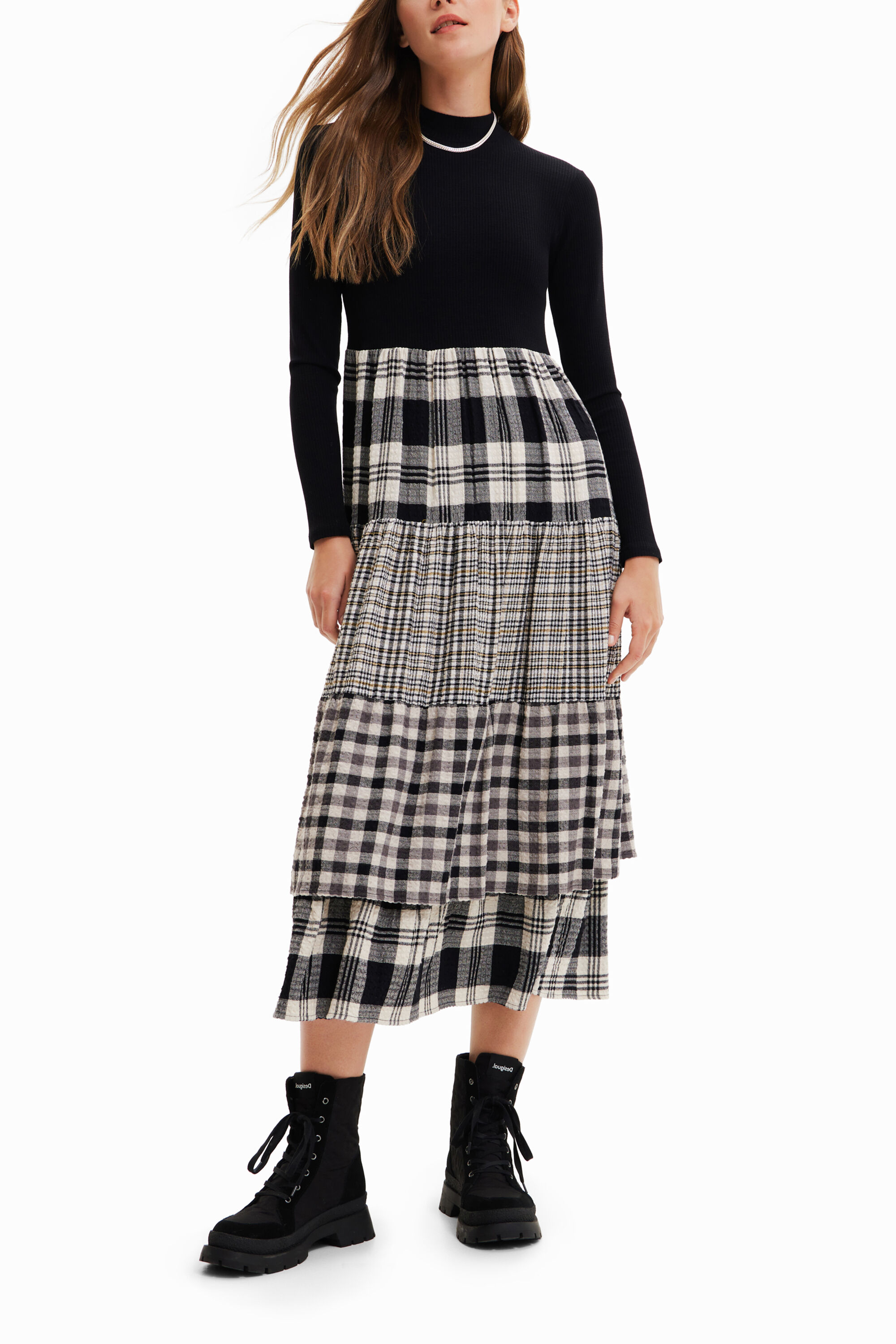 A midi dress made up of a fitted plain ribbed top with a layered skirt in different two-tone plaid fabrics.Perkins collarPlaid patchwork skirtSustainable fibres: