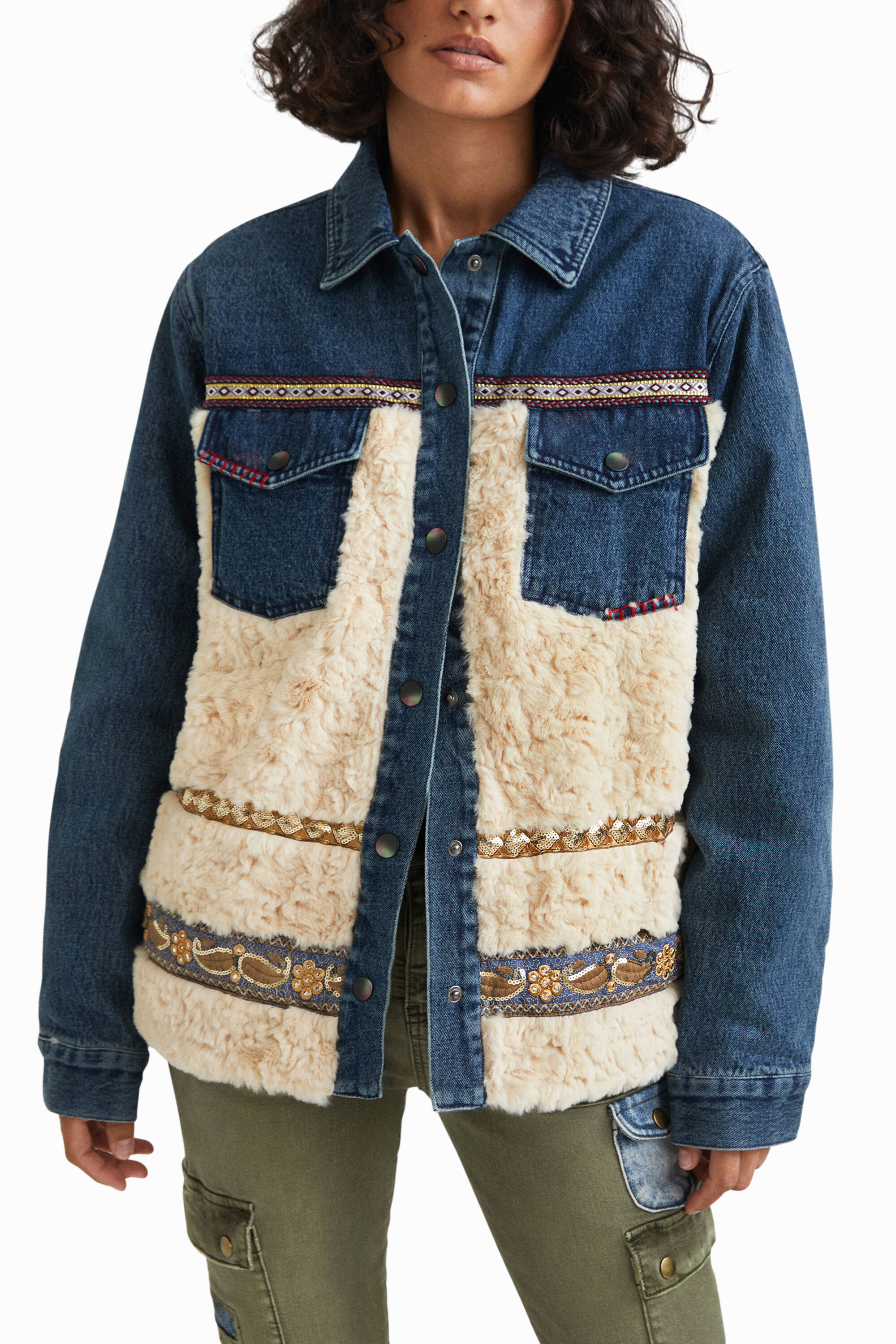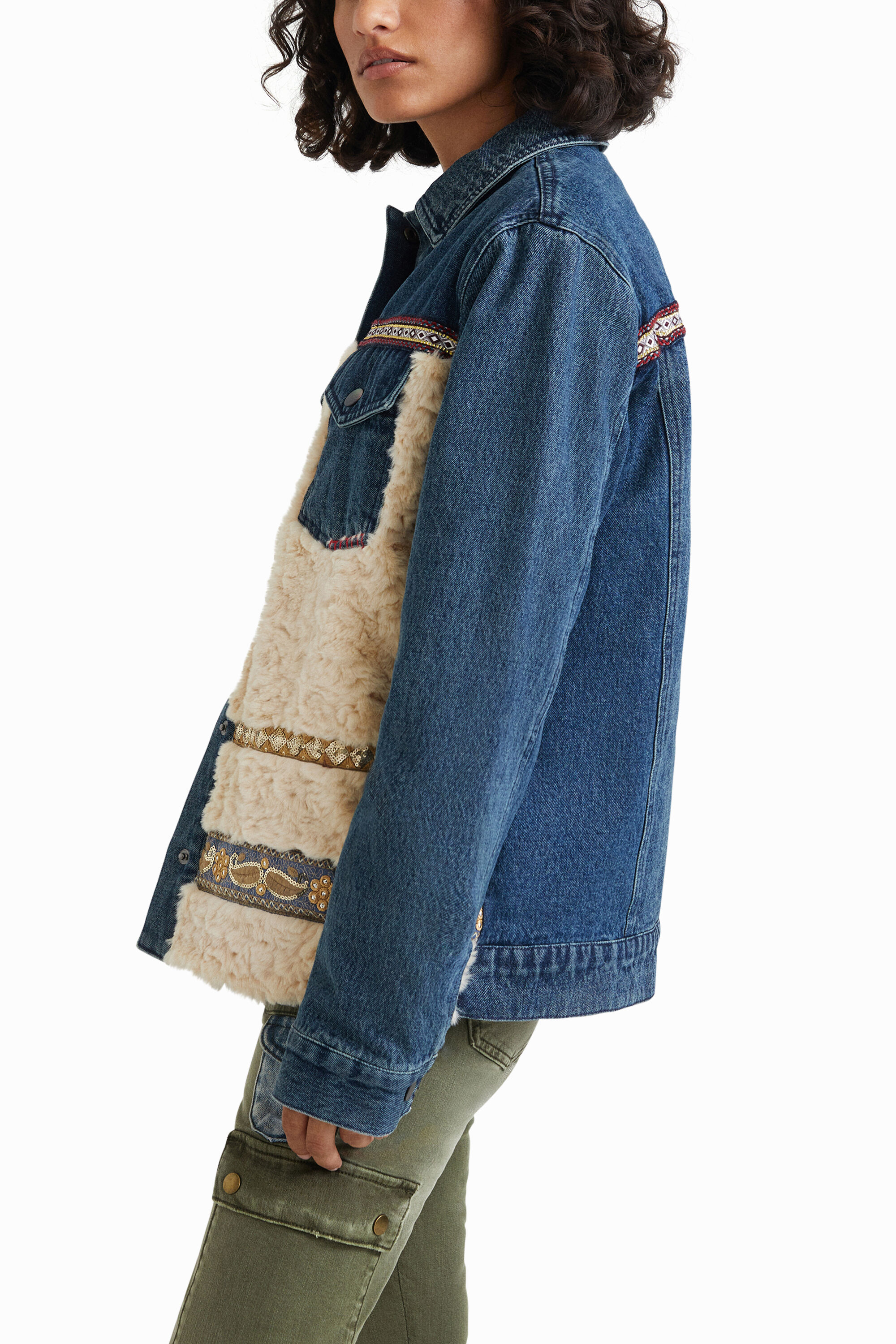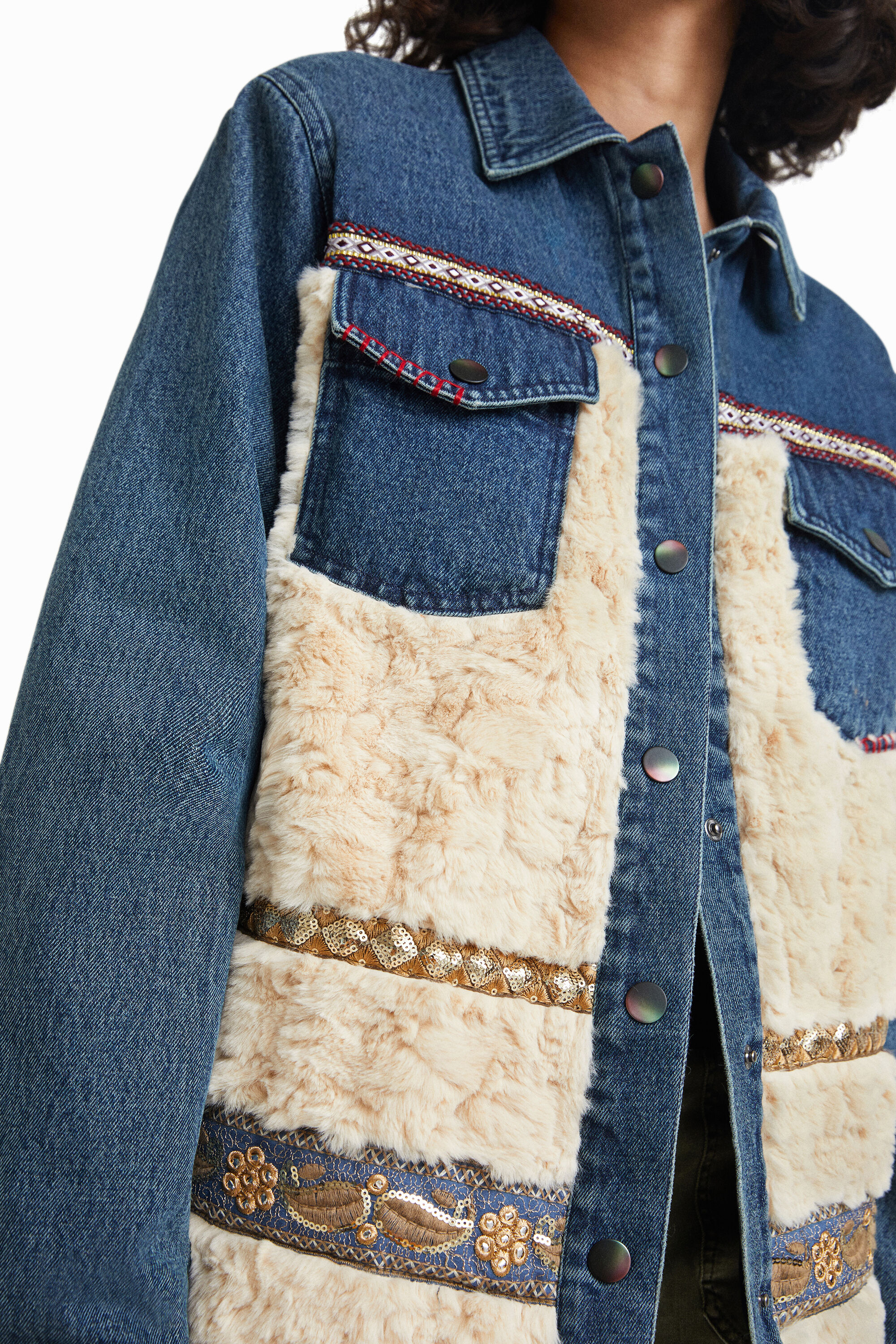 Cutaway collarMetal buttons fastenerFour pocketsCombination of denim panels with fleeceBands with ethnic friezes in metallic Lurex yarn and sequinsWashed/wornRegular fitLong sleeve