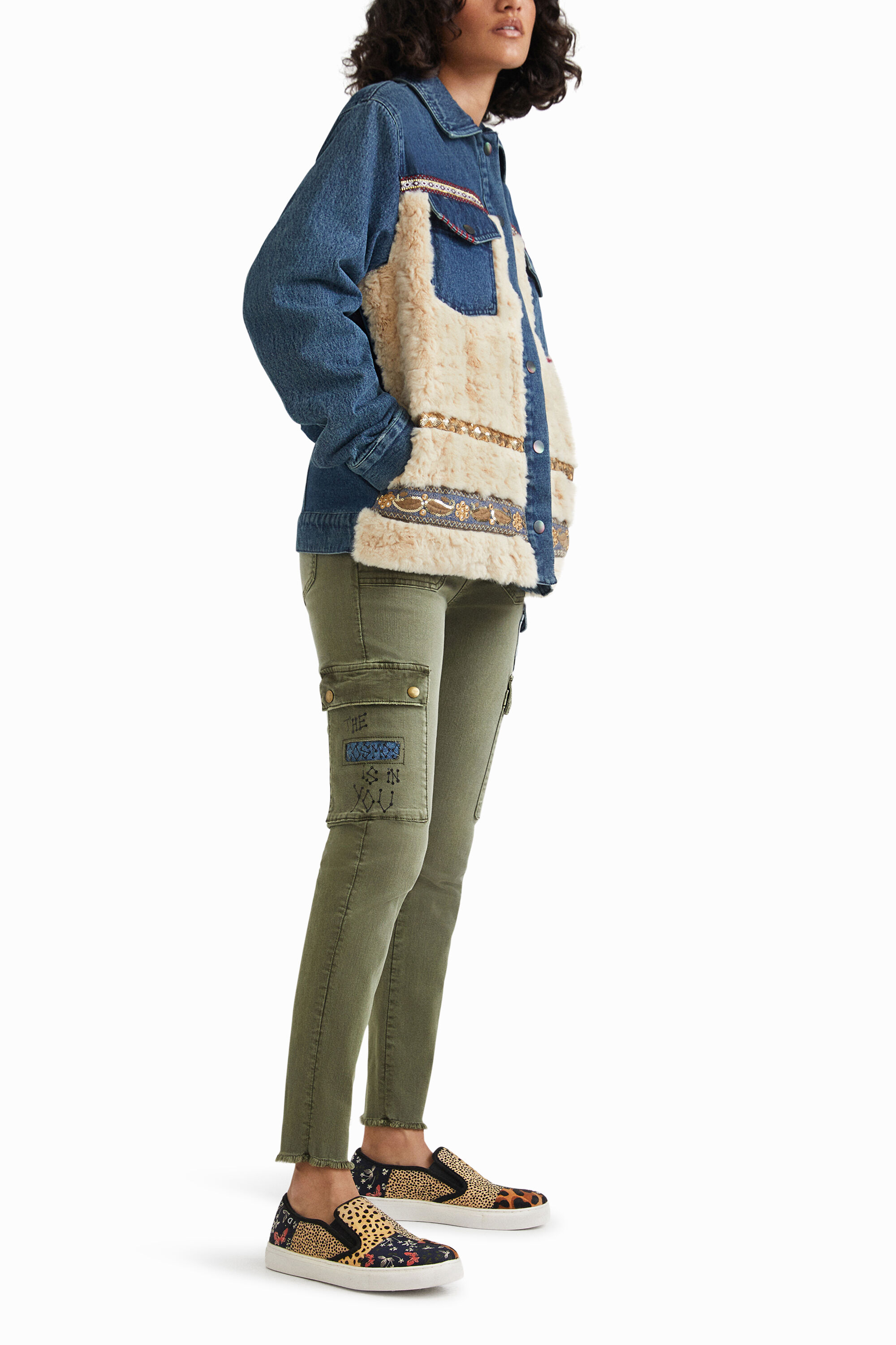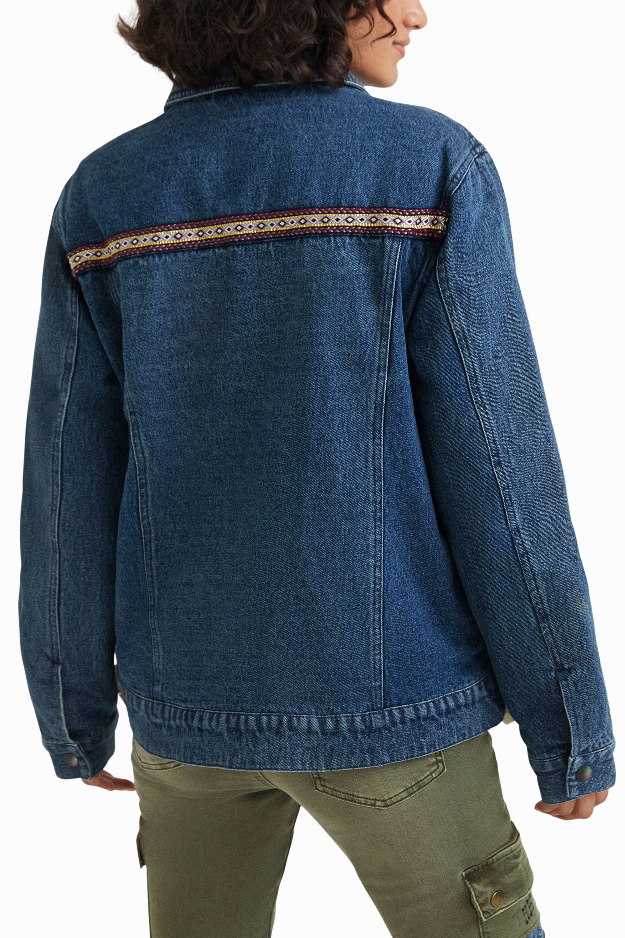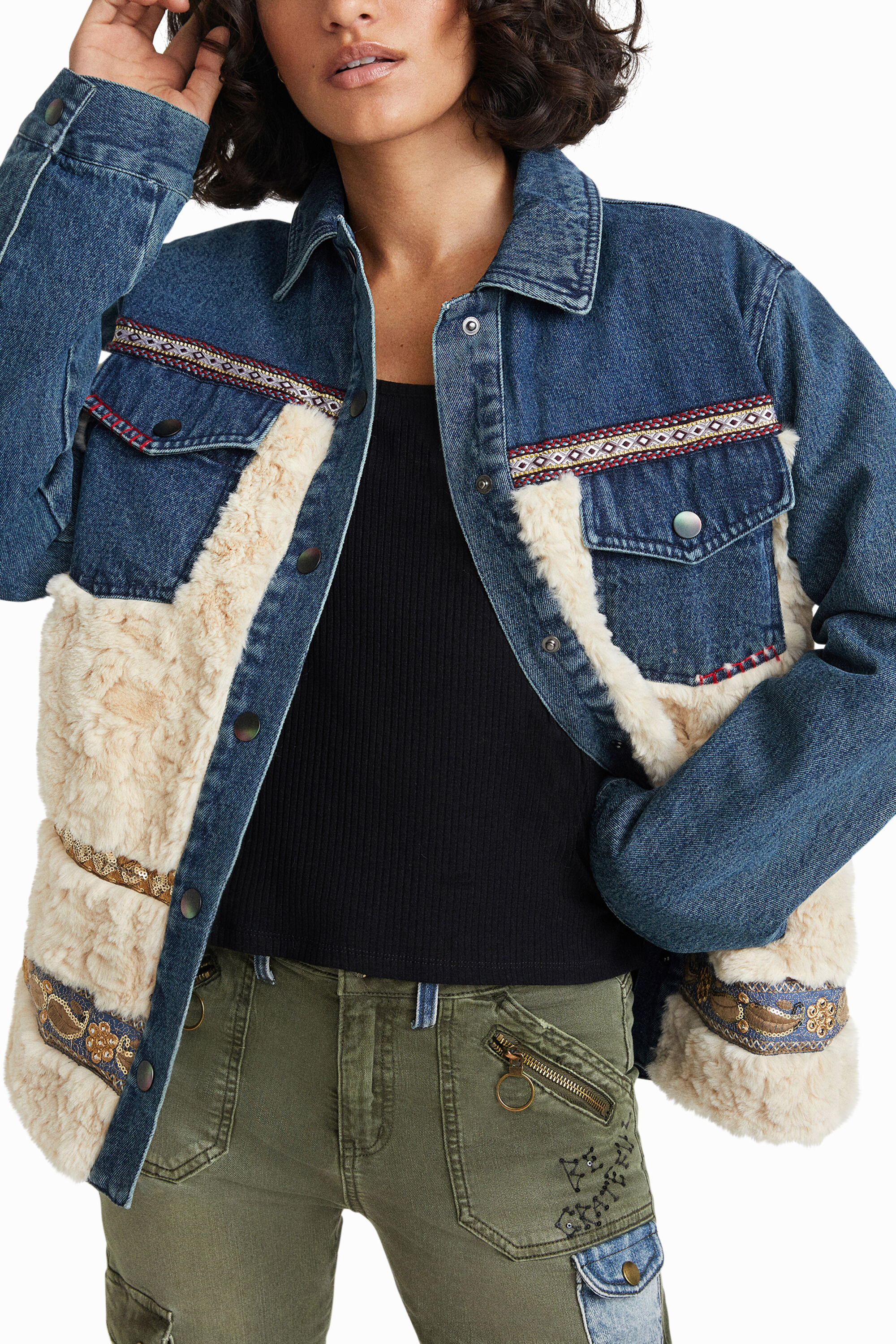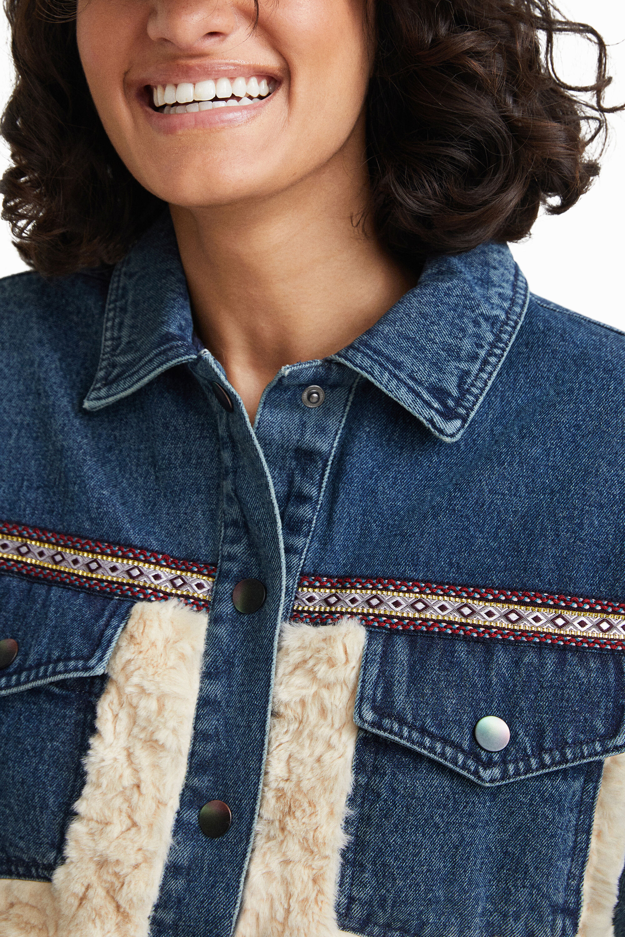 Cutaway collarMetal buttons fastenerFour pocketsCombination of denim panels with fleeceBands with ethnic friezes in metallic Lurex yarn and sequinsWashed/wornRegular fitLong sleeve