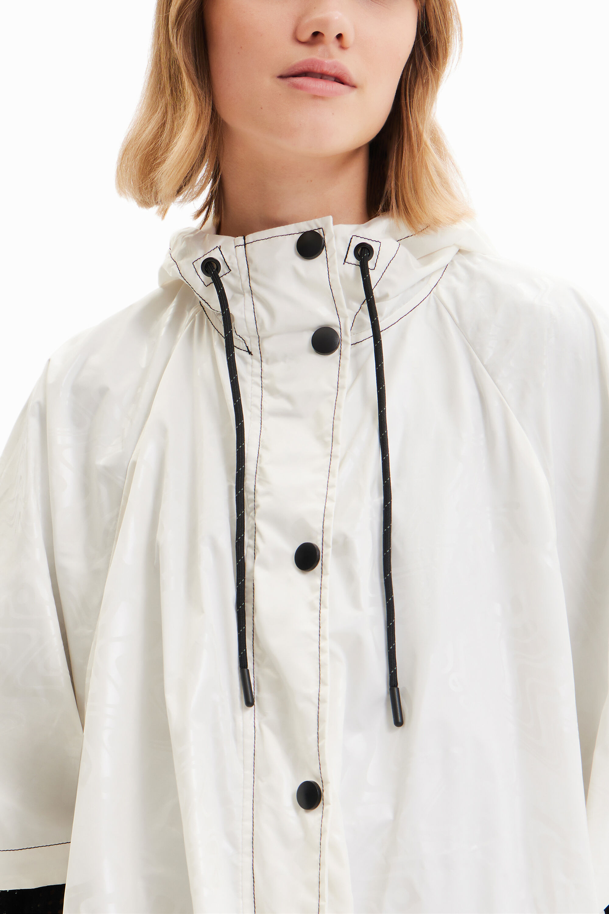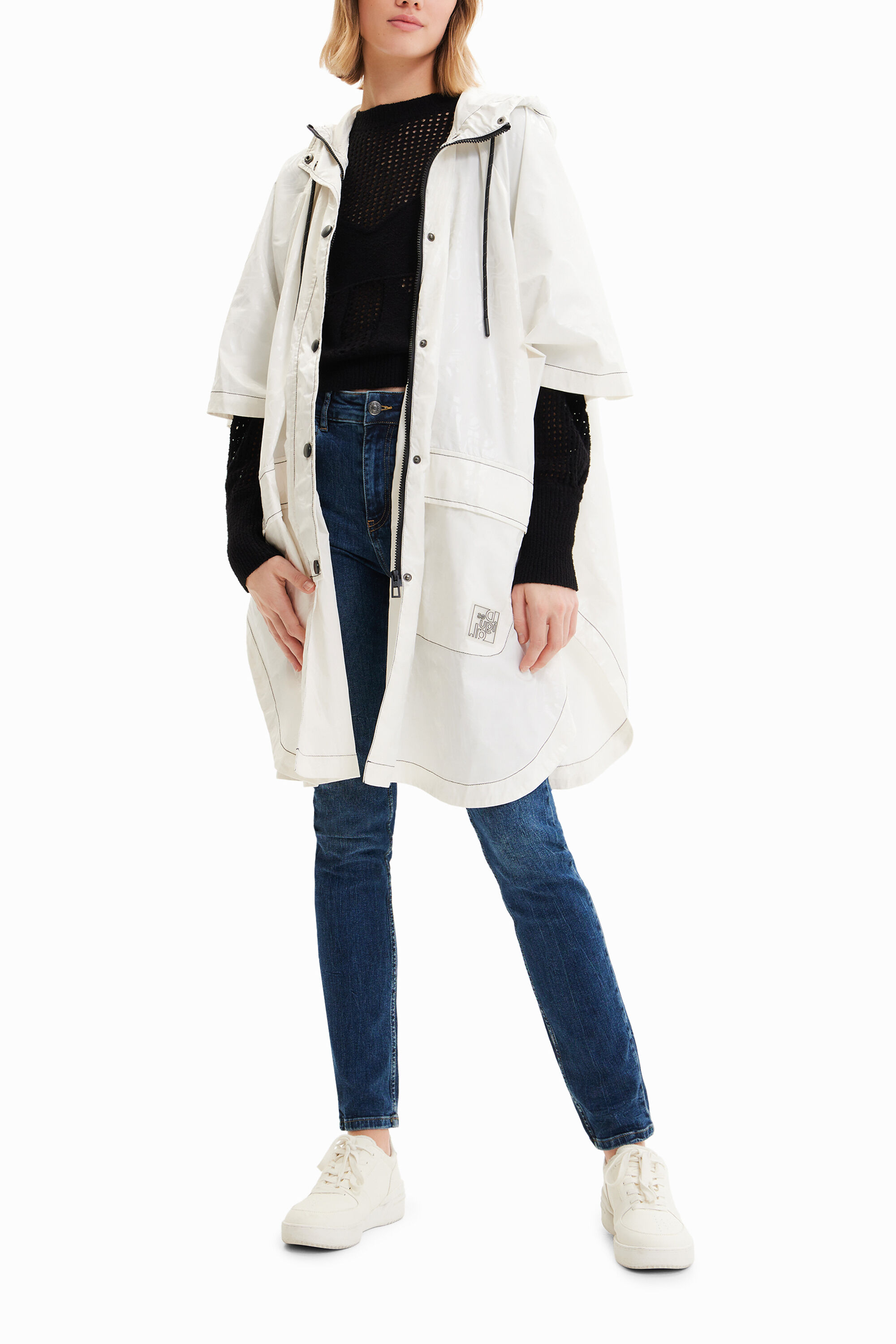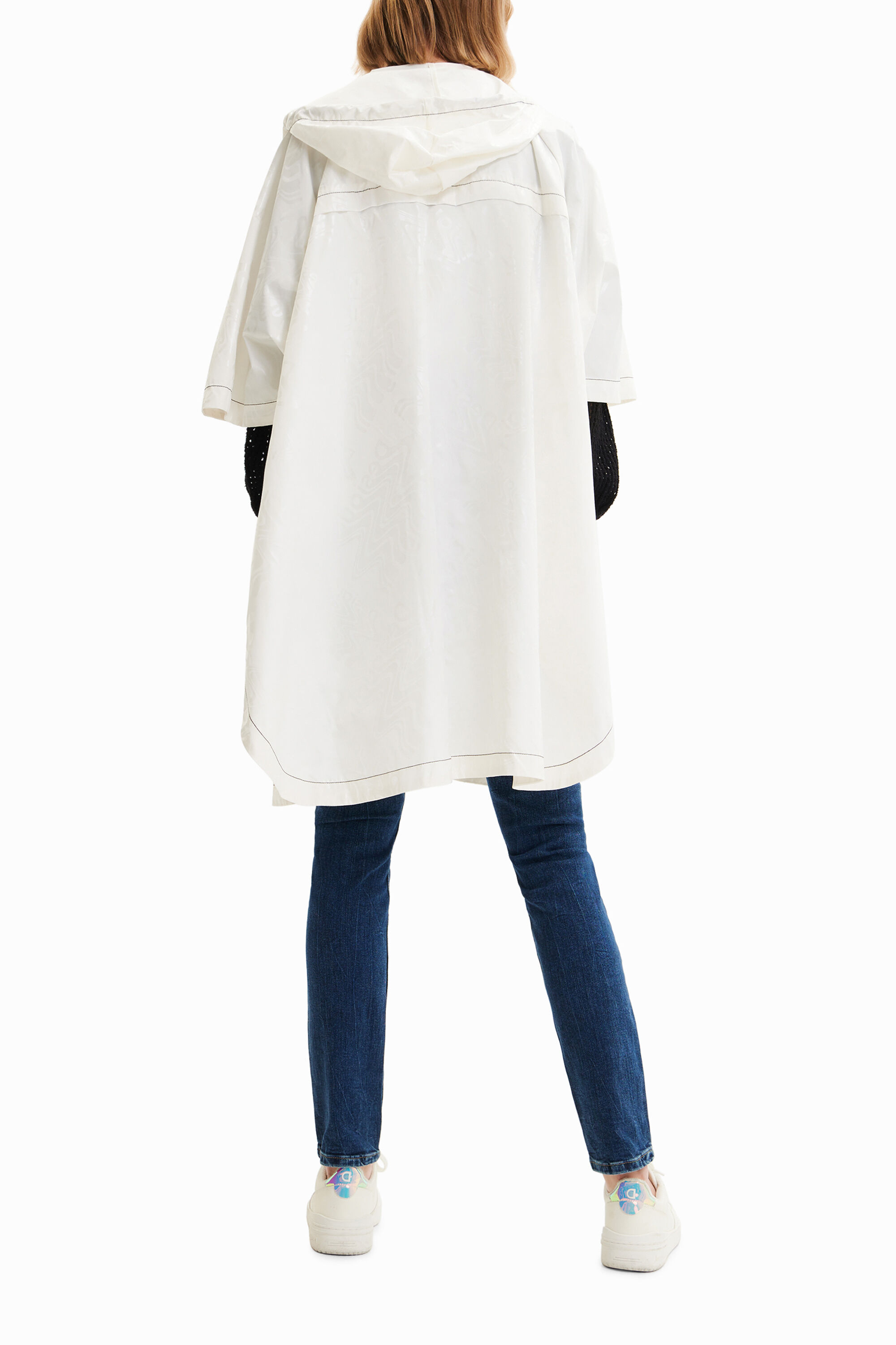 A lightweight oversize poncho-style raincoat with hood and storage pocket.