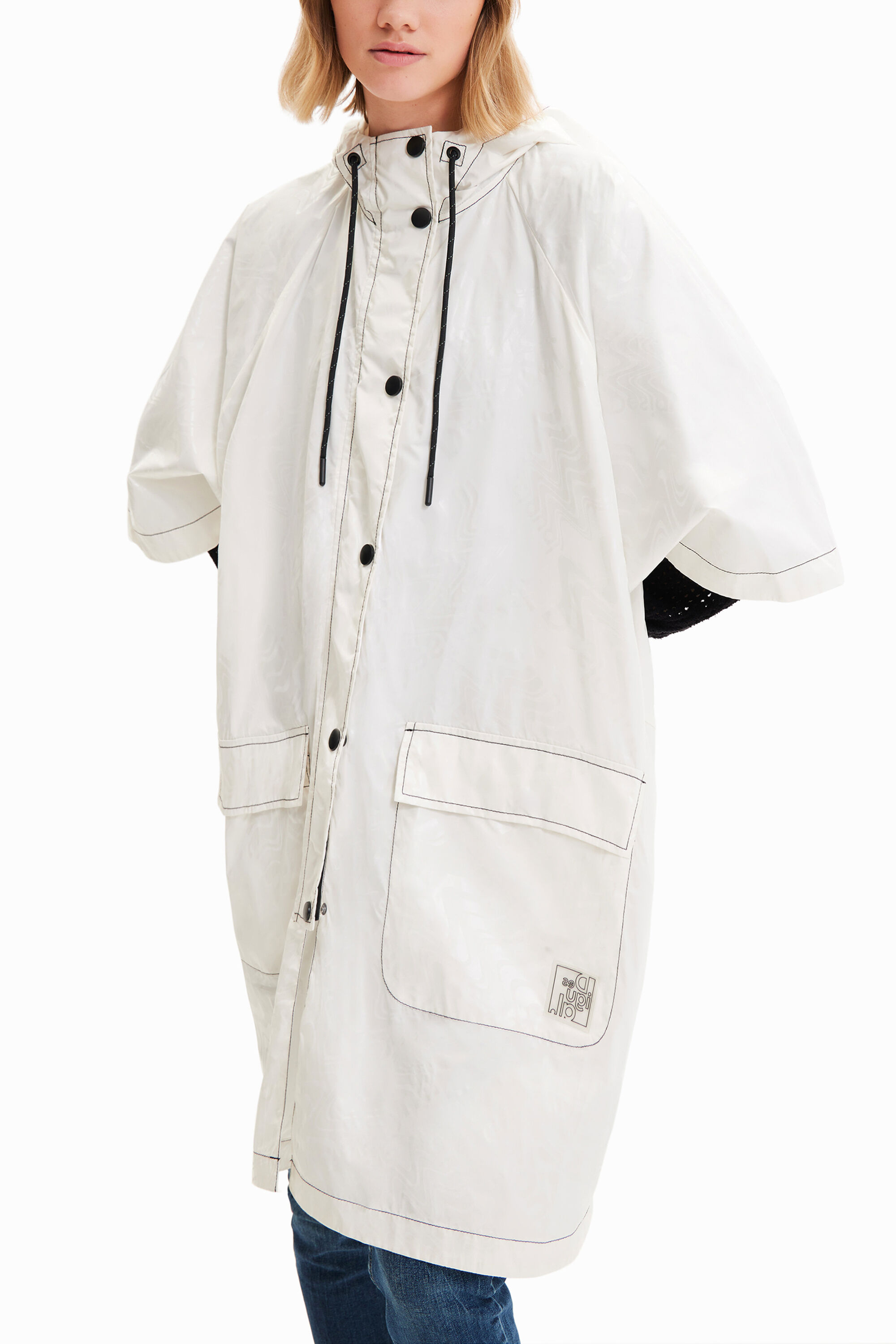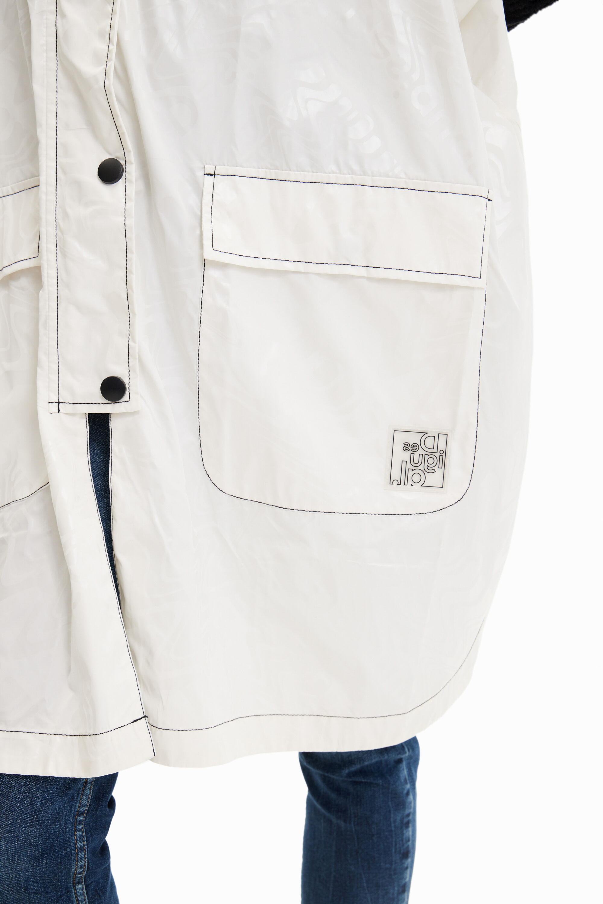 Featuring a tone-on-tone logo print.Fit: OversizeLength: To the kneeTone-on-tone, glossy-effect, distorted logomania printLined hood with drawstrings3/4 sleevesMaxi pockets with flapZip and buttoned flap closureTextured paper-effect fabricRounded hem with side openings