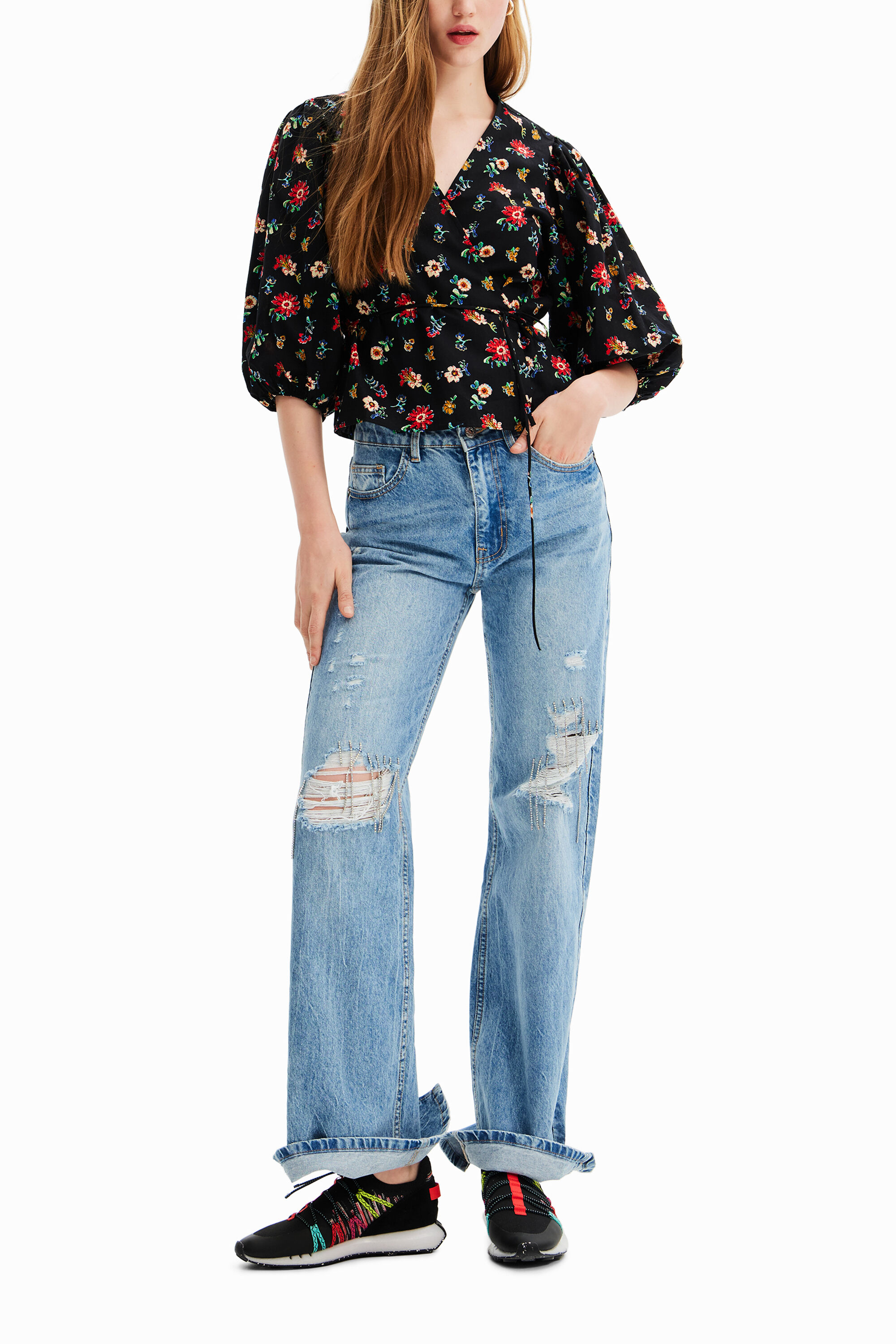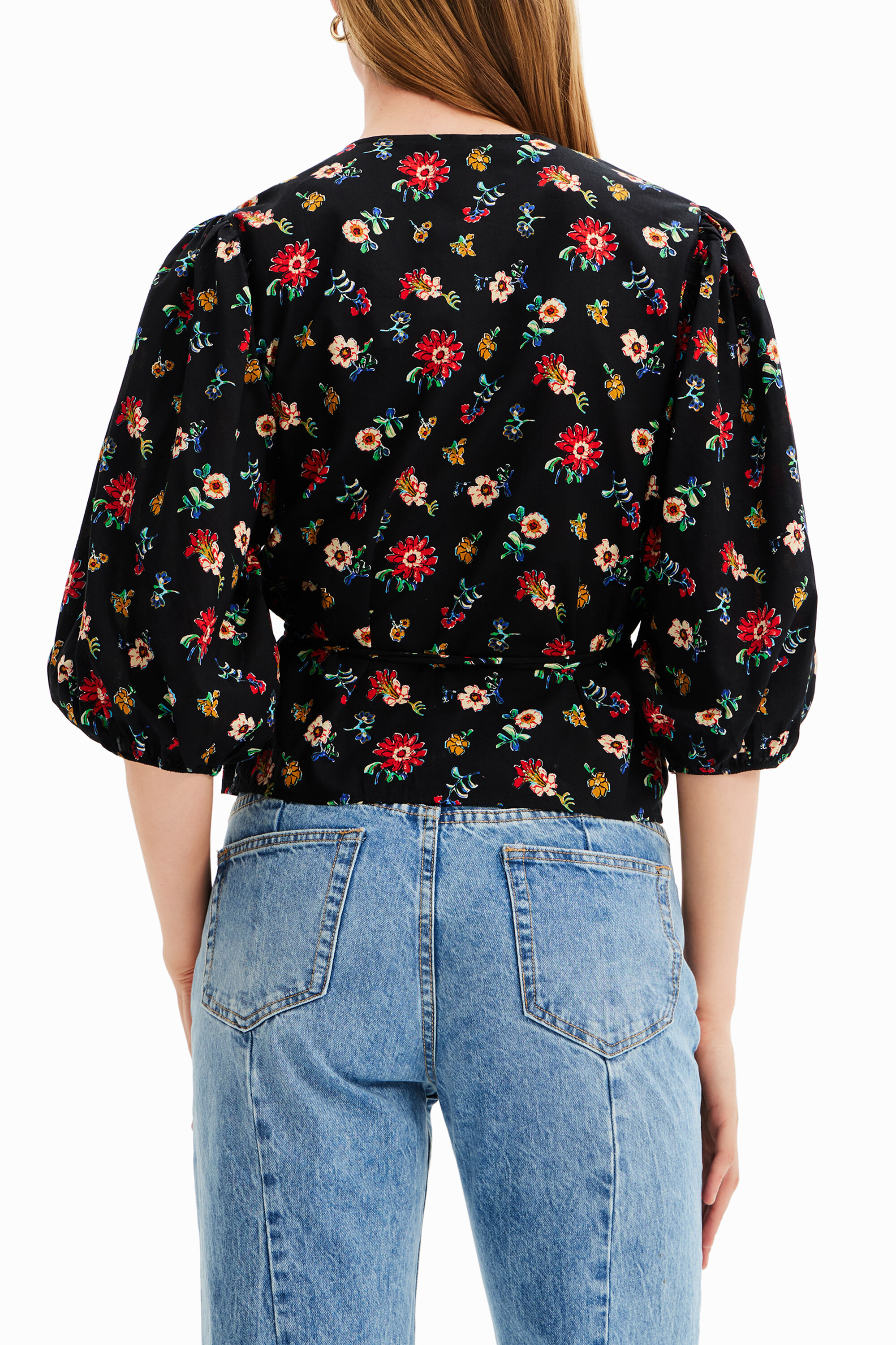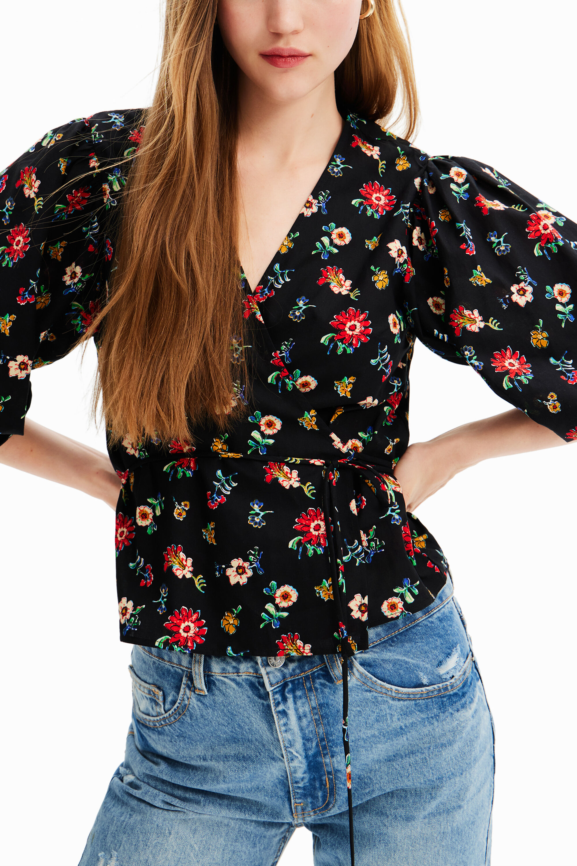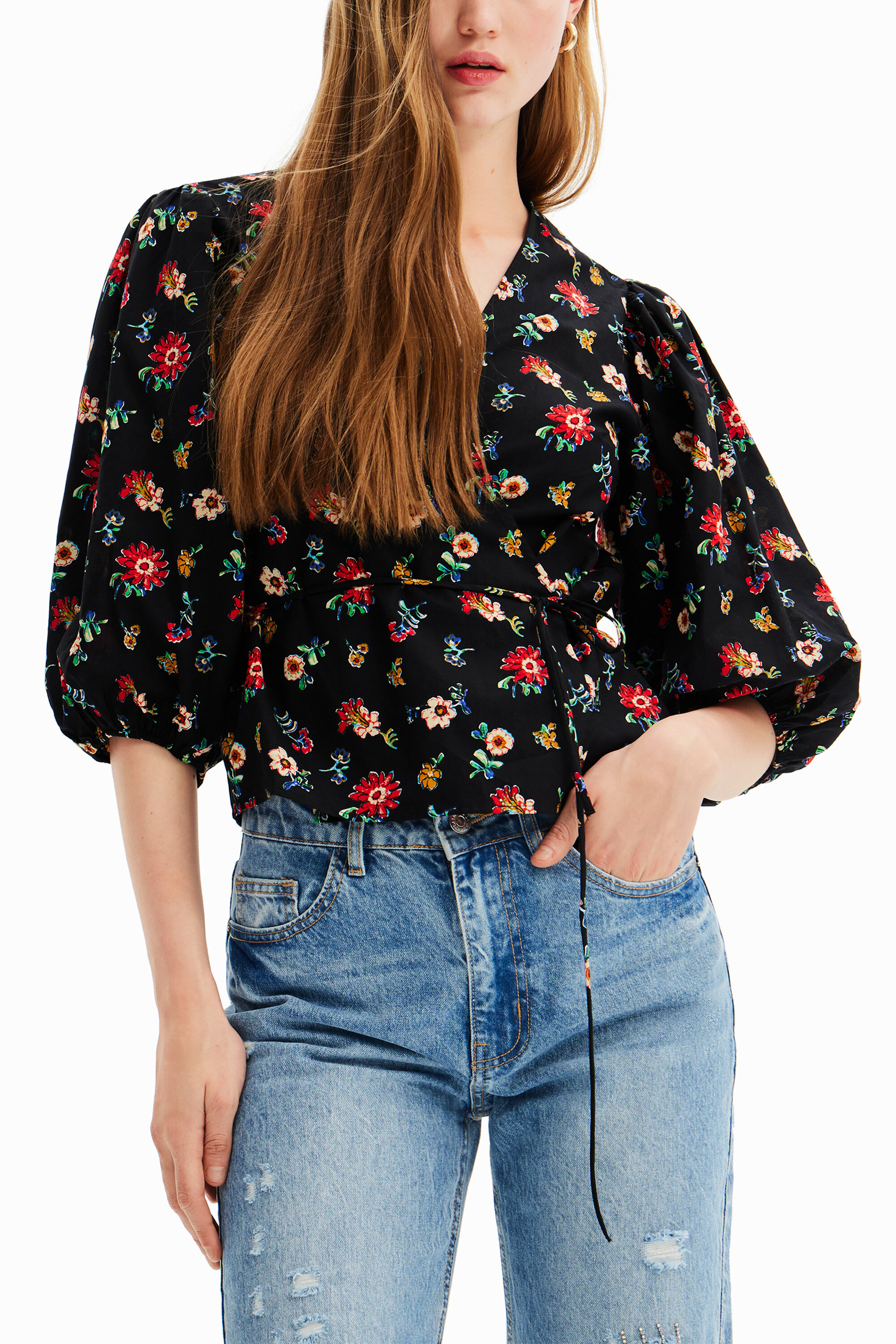 A wrap V-neck blouse with ties and 3/4 puff sleeves, in poplin with a floral print.Fit: RegularArty floral printWrap V-neck3/4 sleeves with elasticated hemAdjustable tie fastening around the bodyRuching detail on the shouldersBy buying cotton products from Desigual, you’re supporting our investment in Better Cotton.