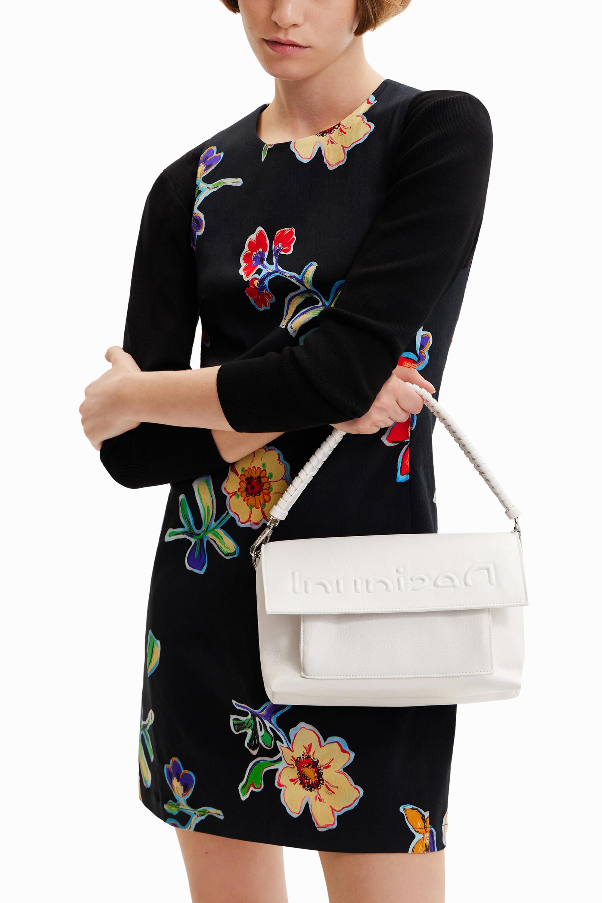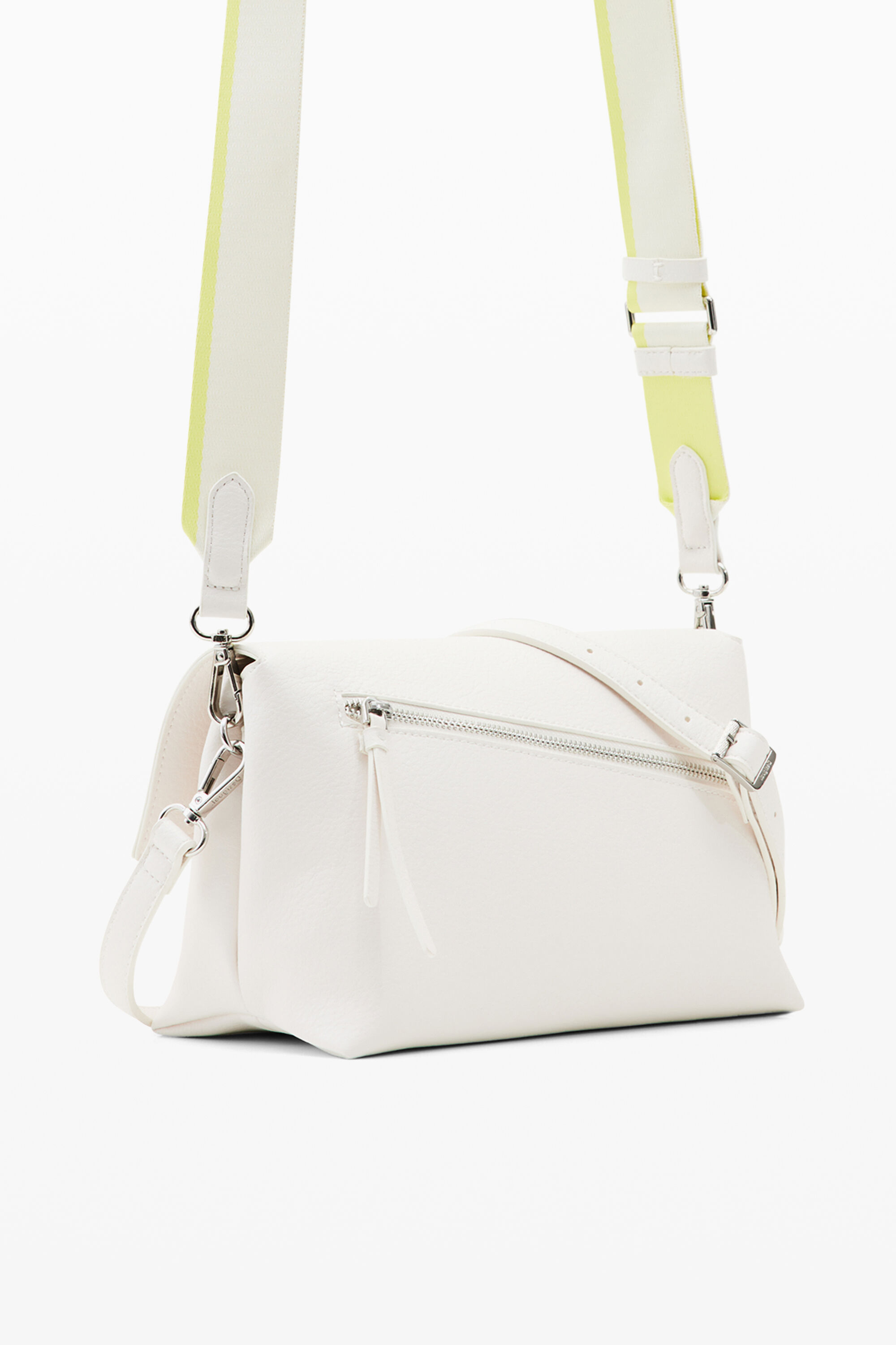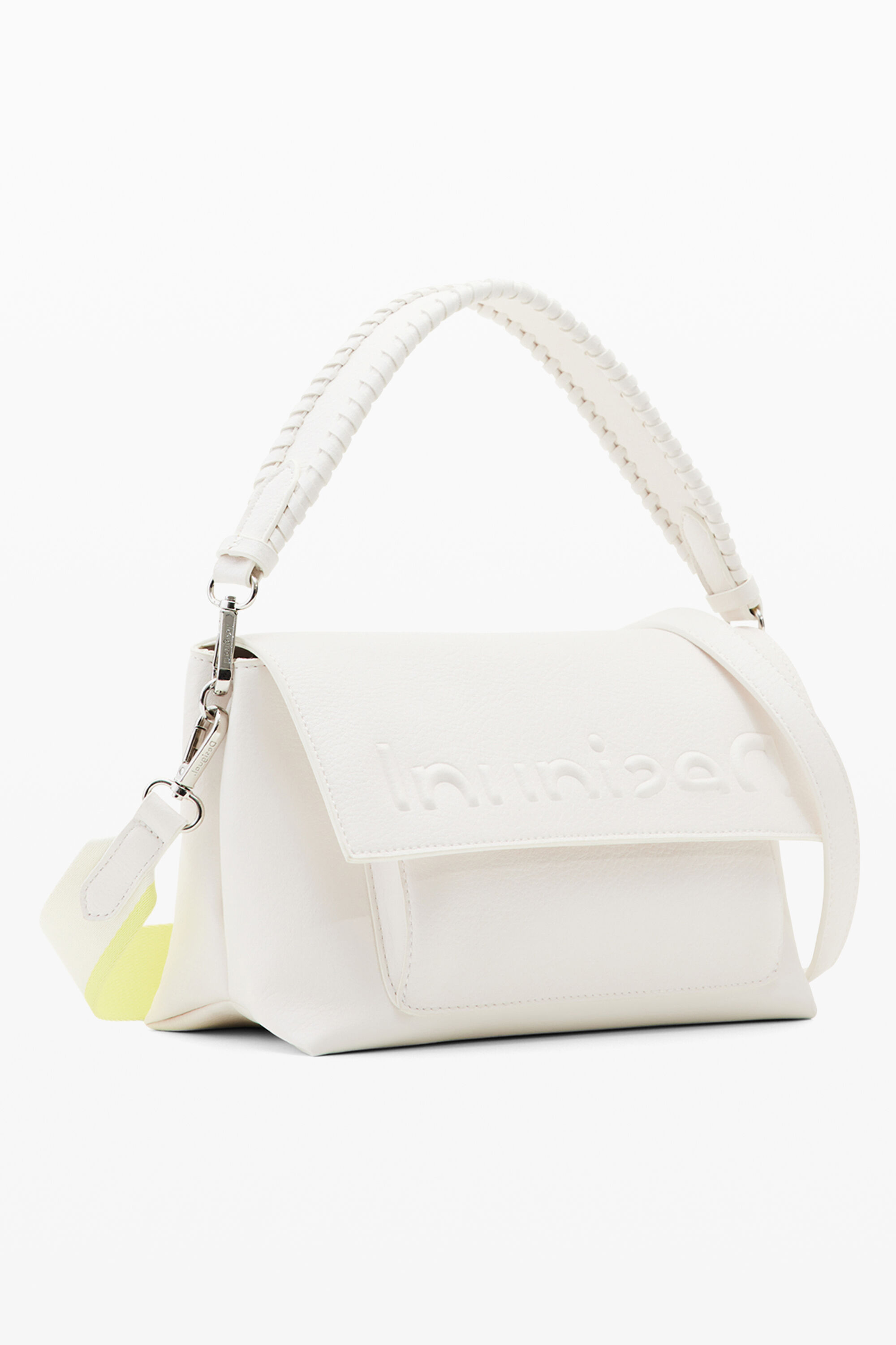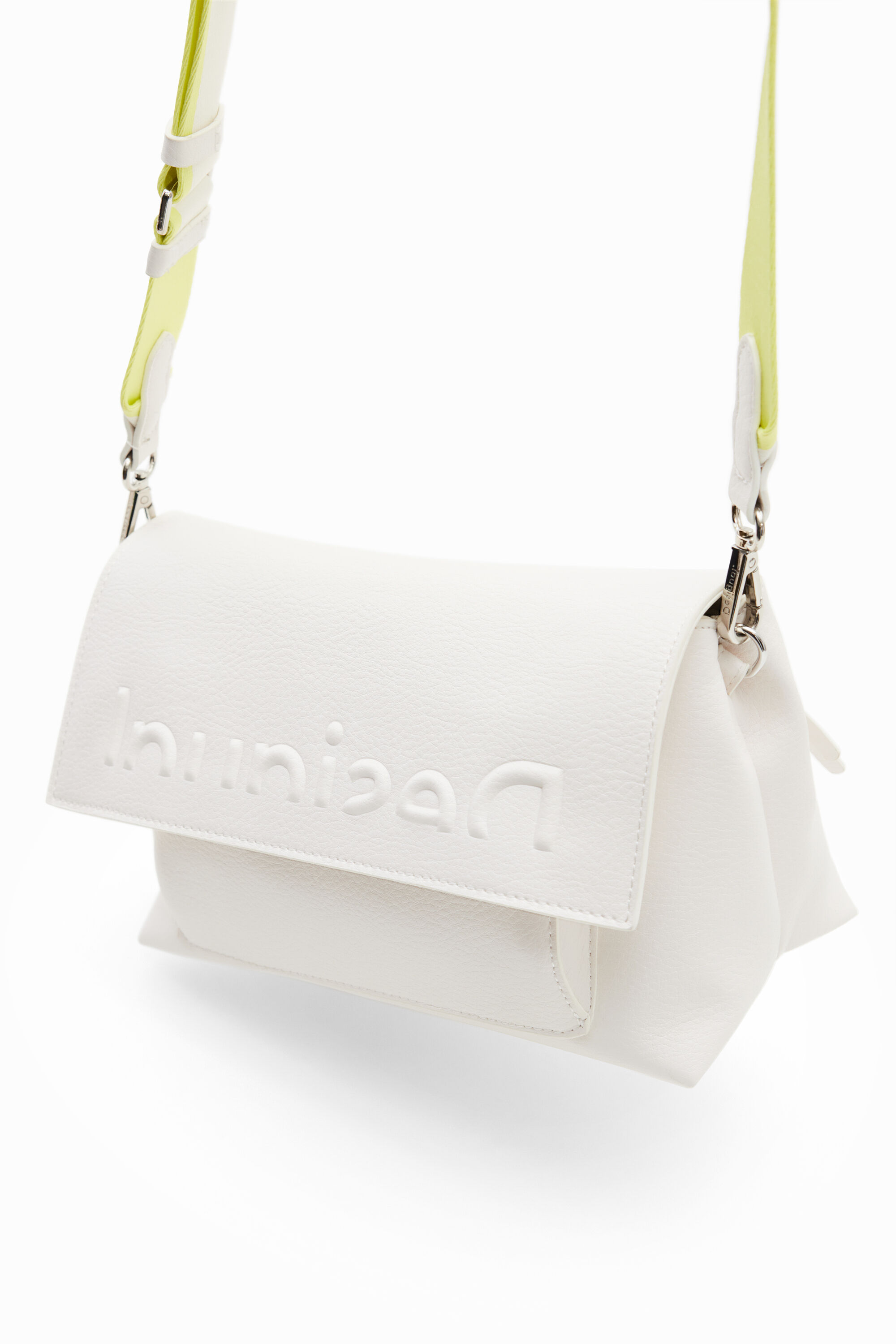 A crossbody bag in leather-effect fabric with an embossed half logo, a flap, and several straps, compartments and pockets.Plain colourMultiple inside and outside pocketsMagnetic flapTwo compartmentsThree strapsShort braided handle for carrying in the handTwo long, detachable straps for wearing across the bodyLeather-effect fabric with half logo on the flap25.5 x 12.6 x 15.8 cm