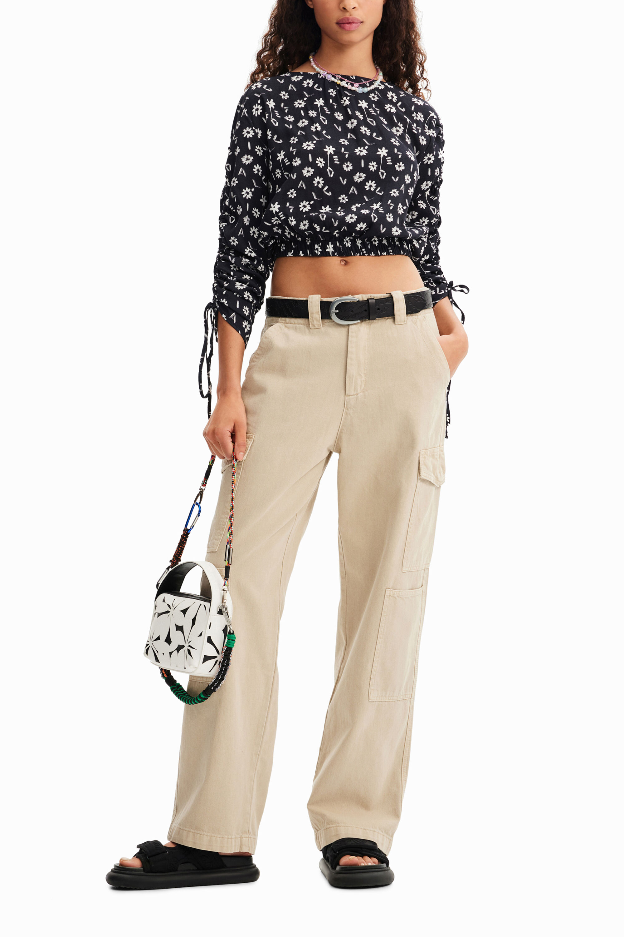 A short, long-sleeve blouse with adjustable gathering, elasticated hem and an opening on the back.