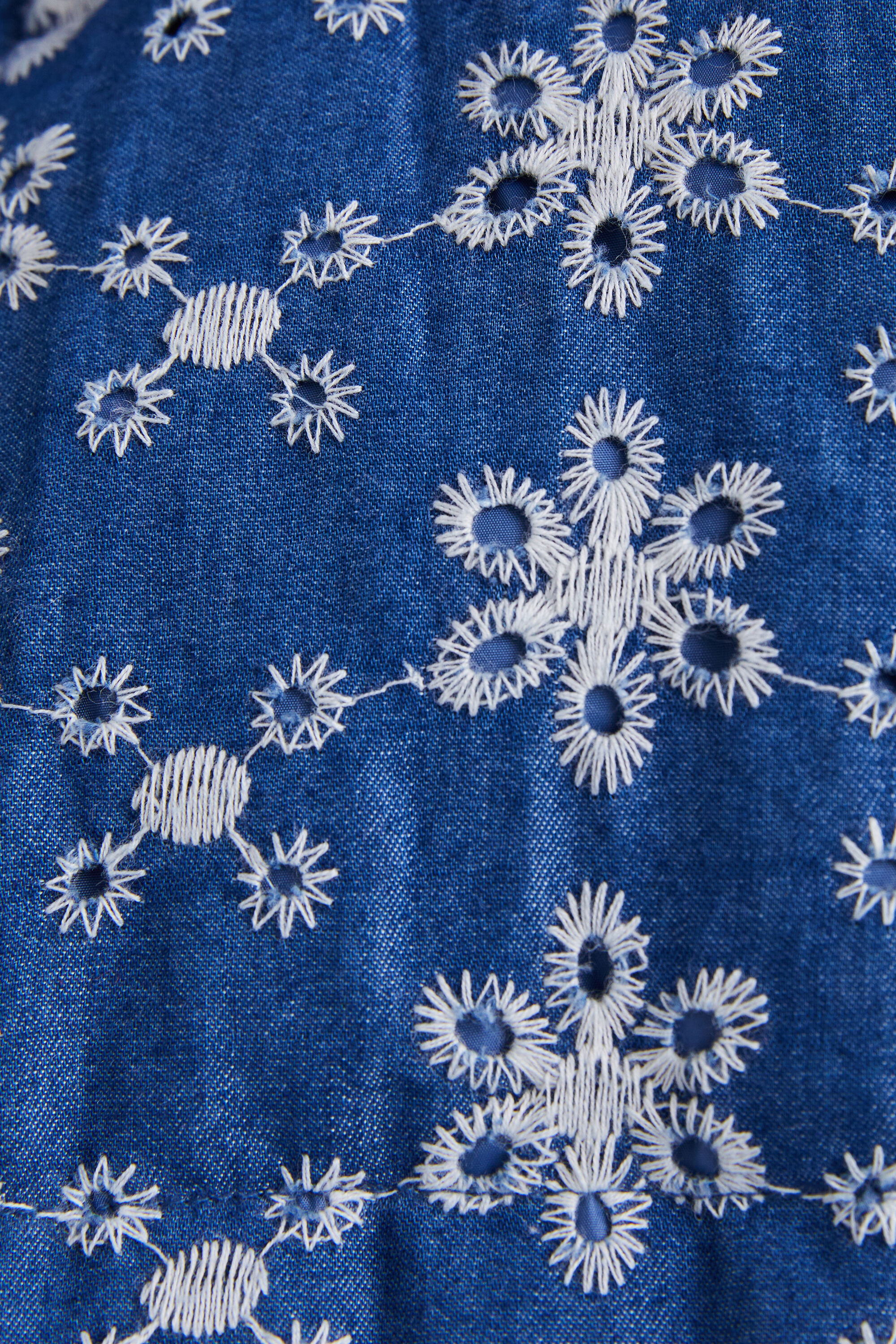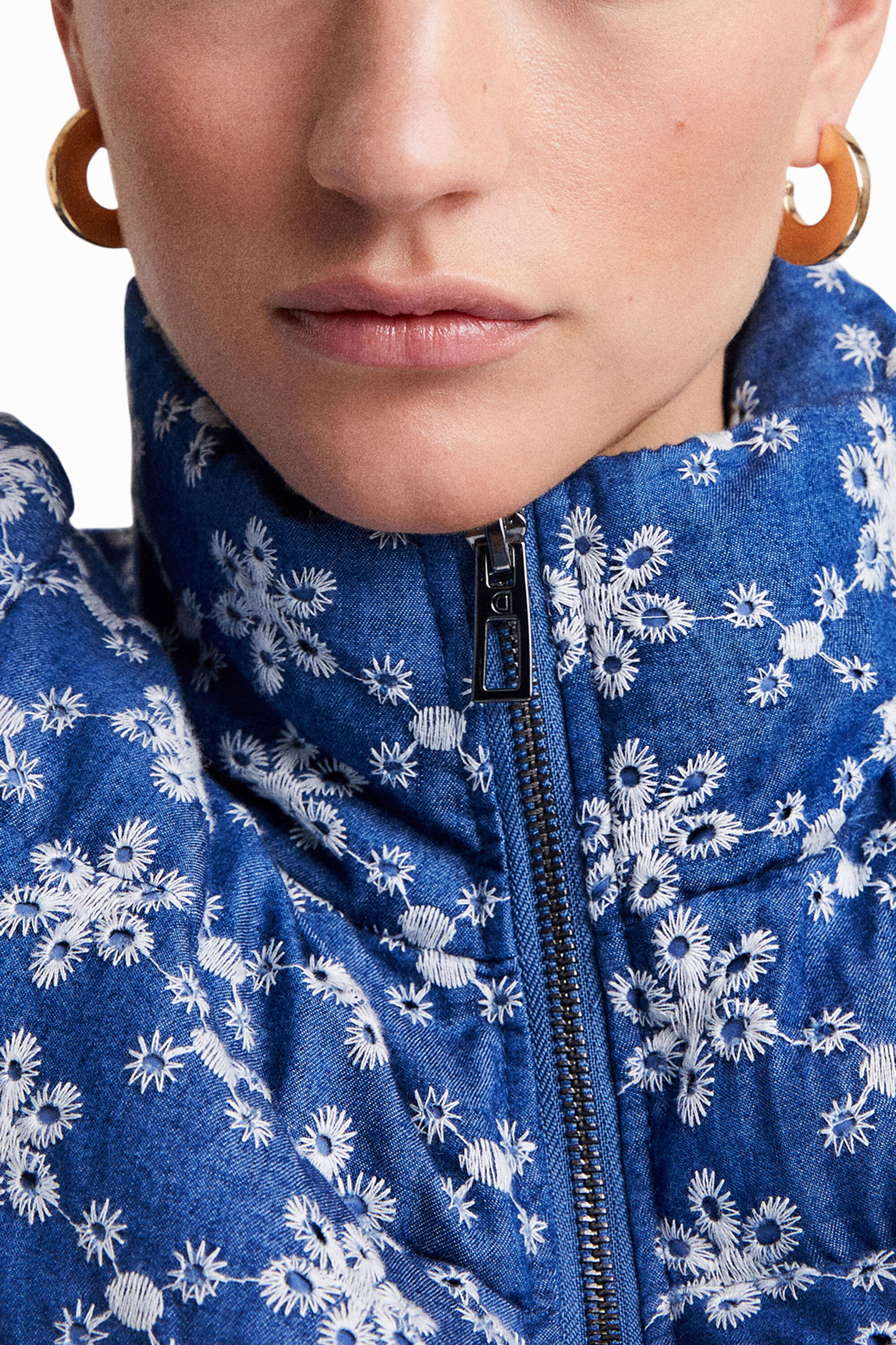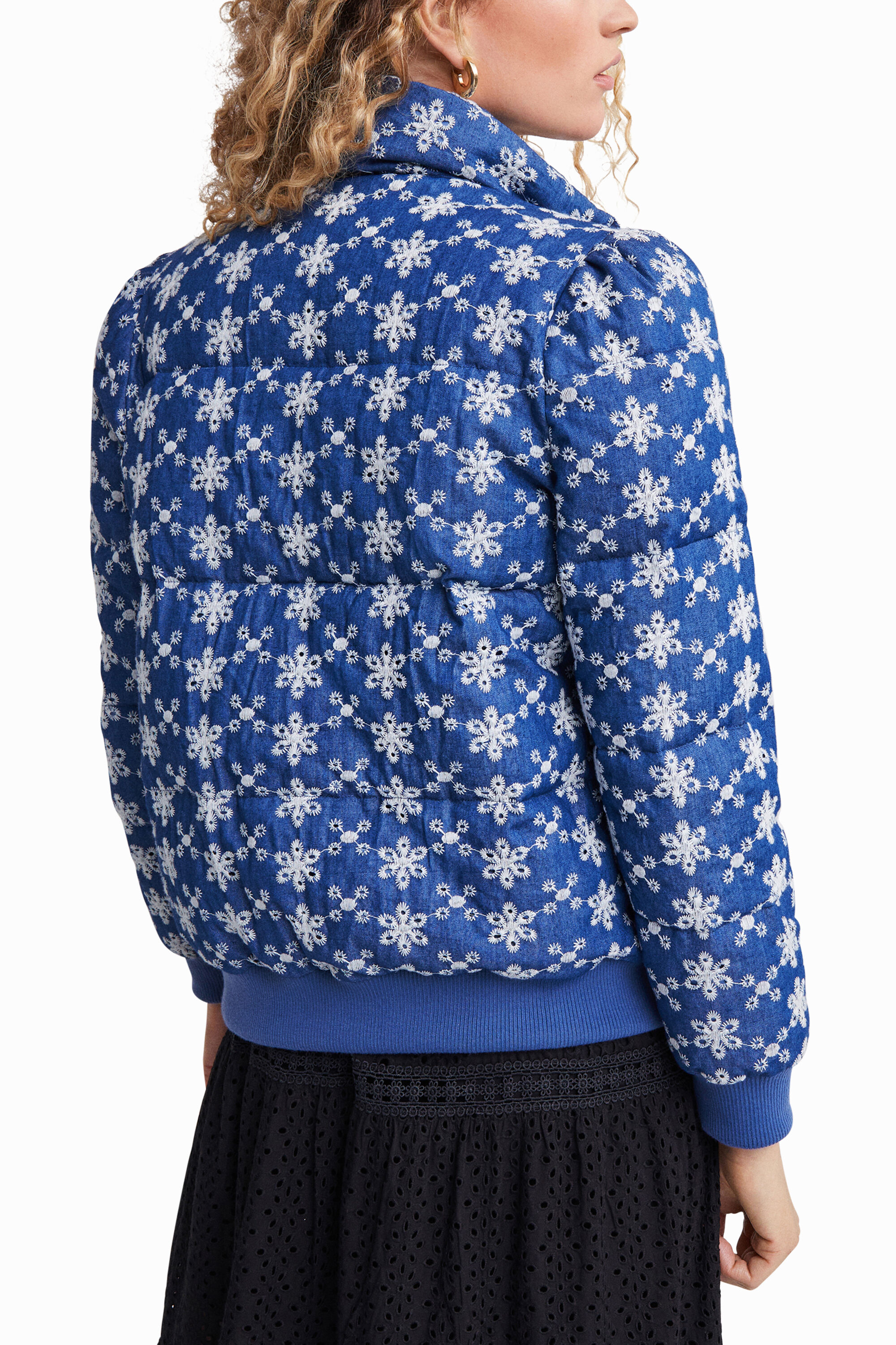 Extremely comfortable blue quilted jacket featuring a layer of Swiss embroidery white flowers.