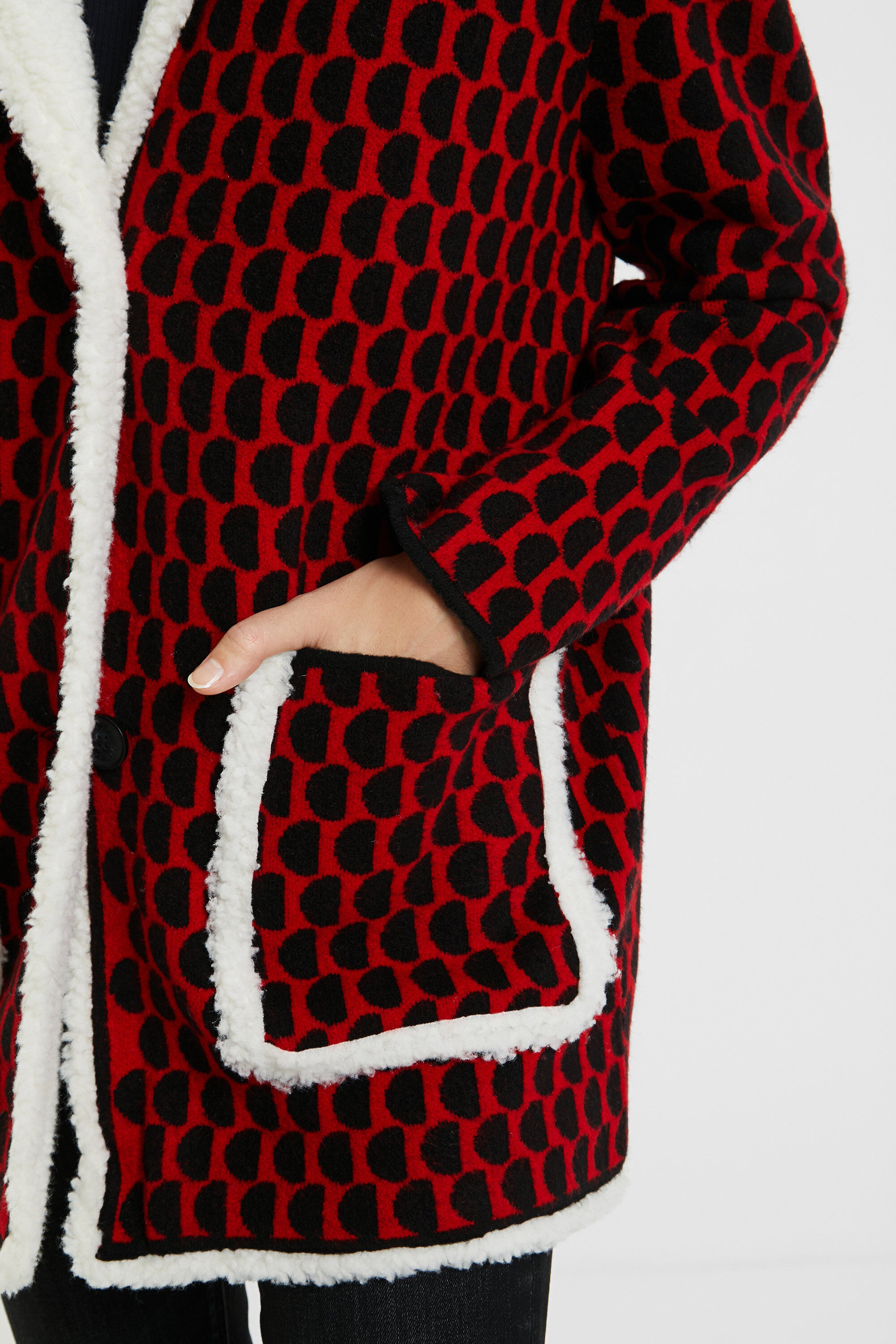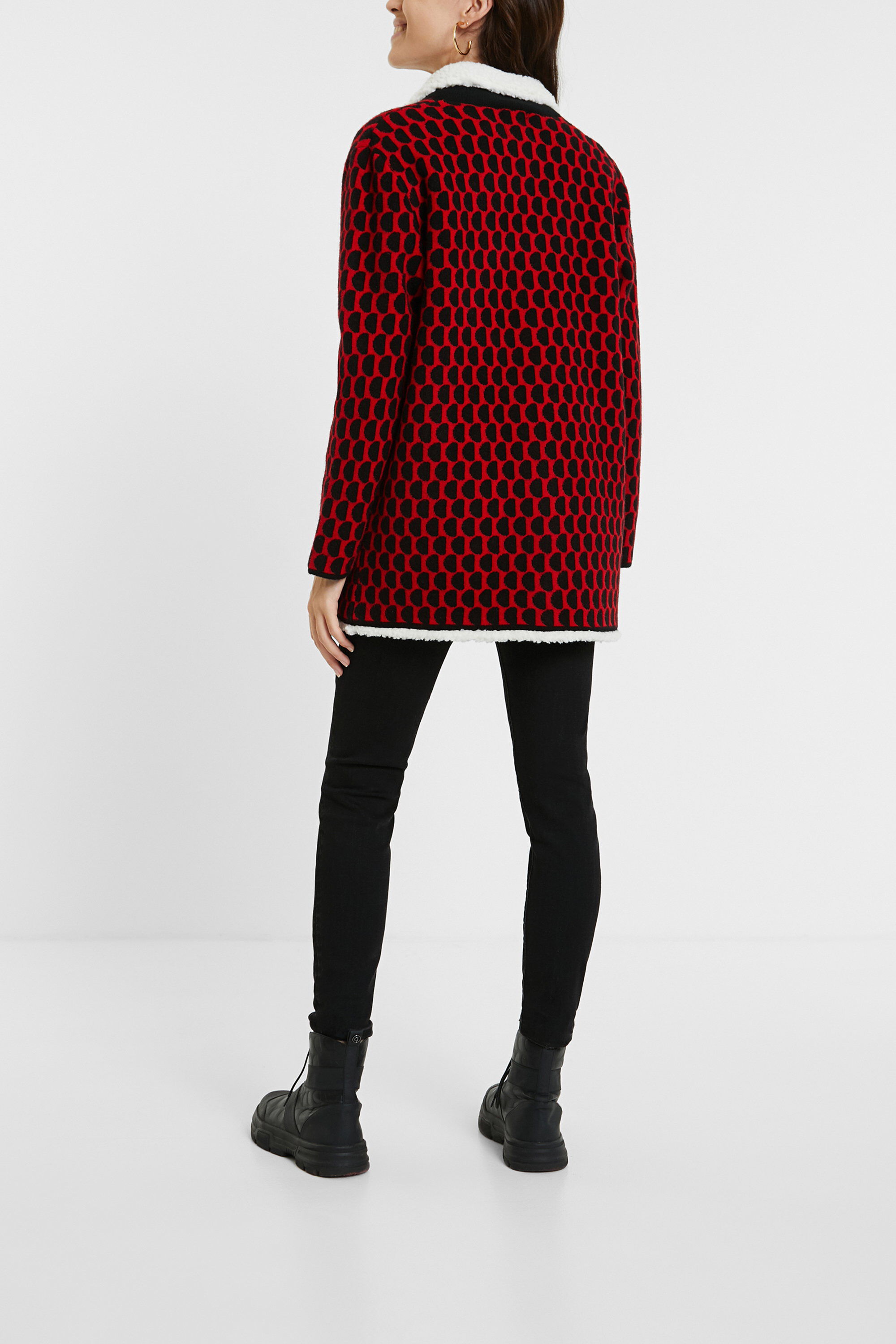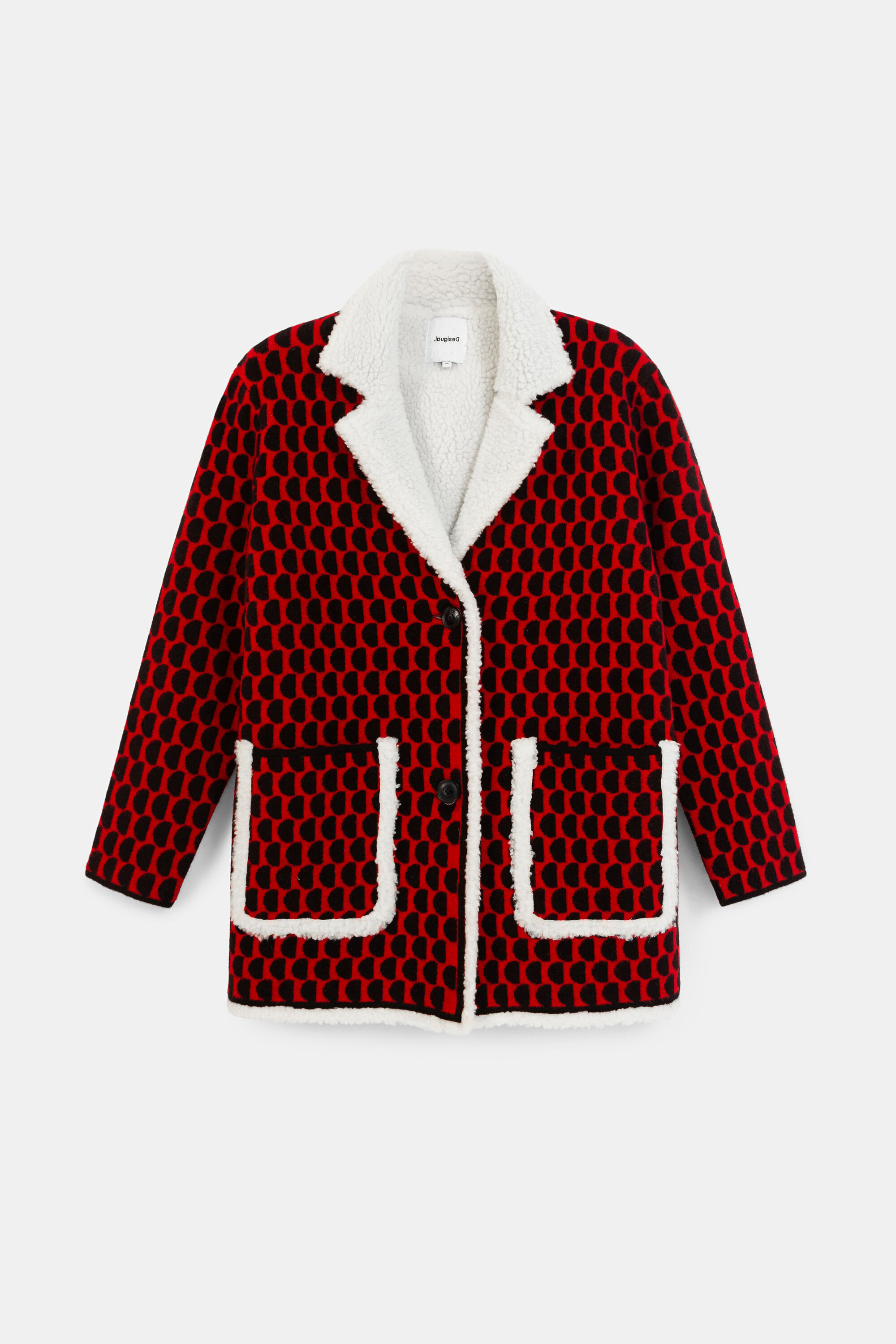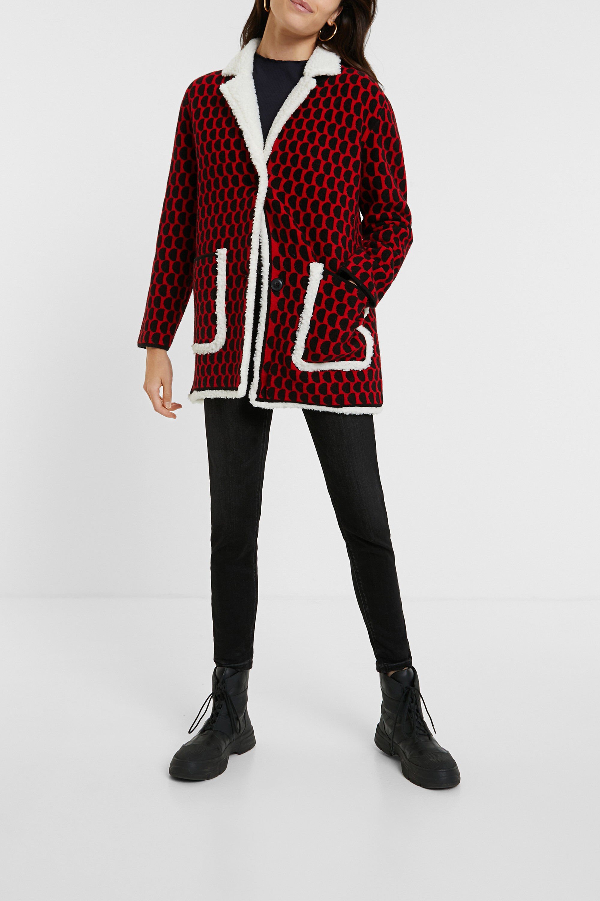 That exactly what this jacket is, with V-neck and lapels, displaying the Desigual monogram and mixing two fabrics that are as warm and pleasant as tricot (all over its body) and its fleece (in the inner lining, visible on neck and pockets).V-neck with lapelsButton fastenerTwo pocketsDesigual monogram in black on redInner lining of fleece visible on collar, waist and the edges of the pocketsLoose fitLong sleeve