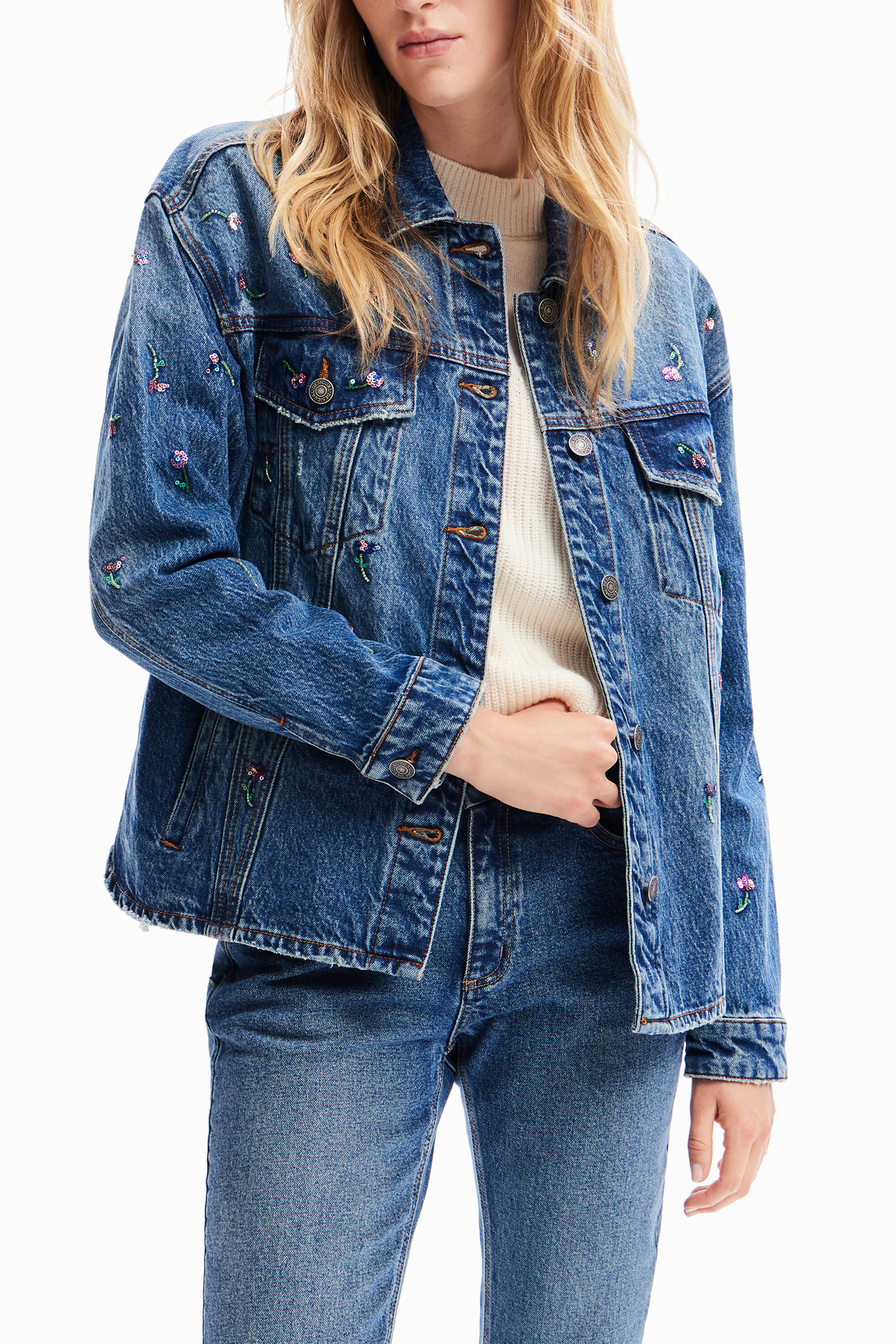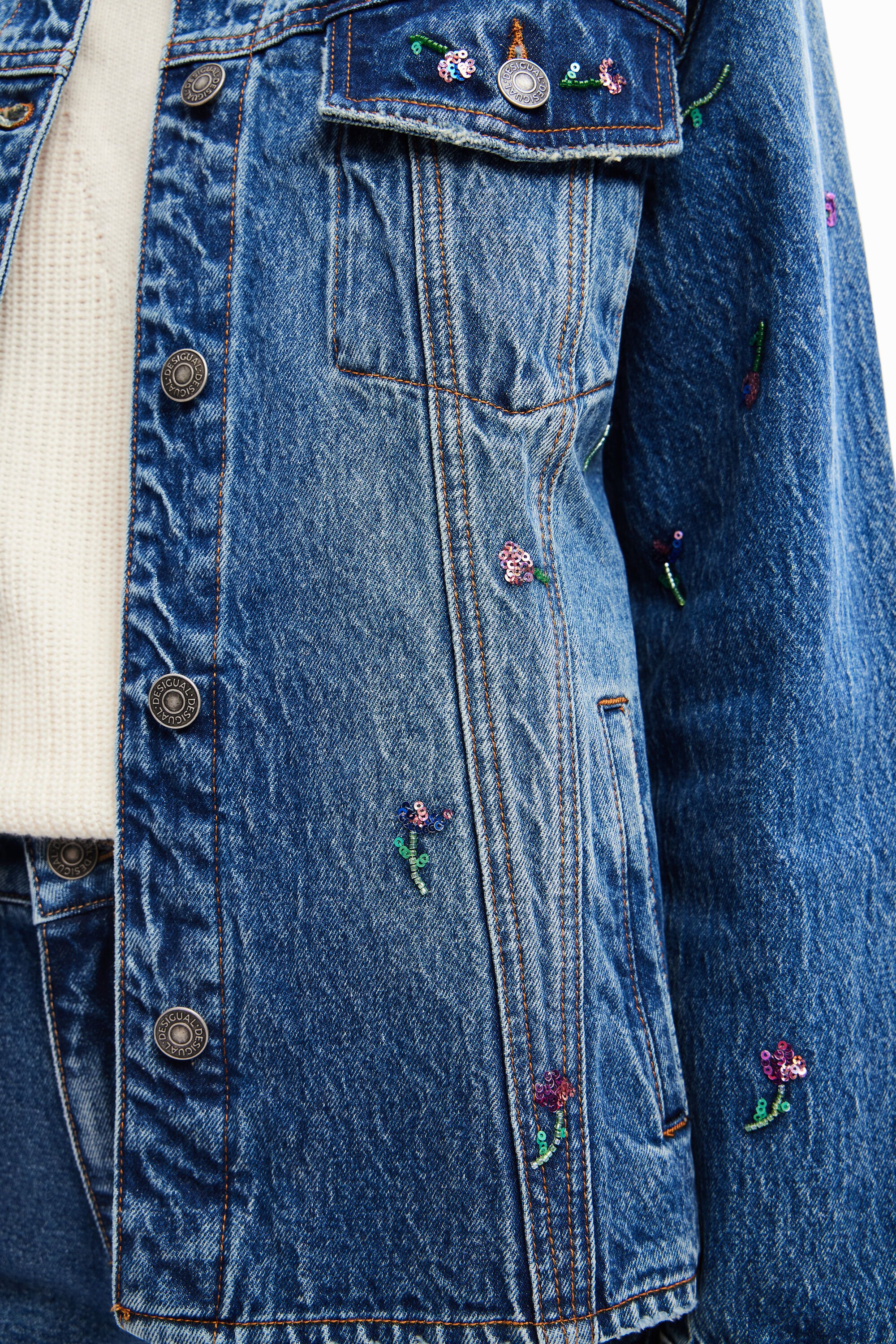 A denim trucker jacket in an overshirt style with a washed effect and flower appliquéing with beads and sequins.Fit: RegularEmbroidered flowers with sequins and beadsShirt collarLong sleevesFour pocketsButton fasteningDistressed detailsLonger rounded hem at the backBy buying cotton products from Desigual, you’re supporting our investment in Better Cotton.