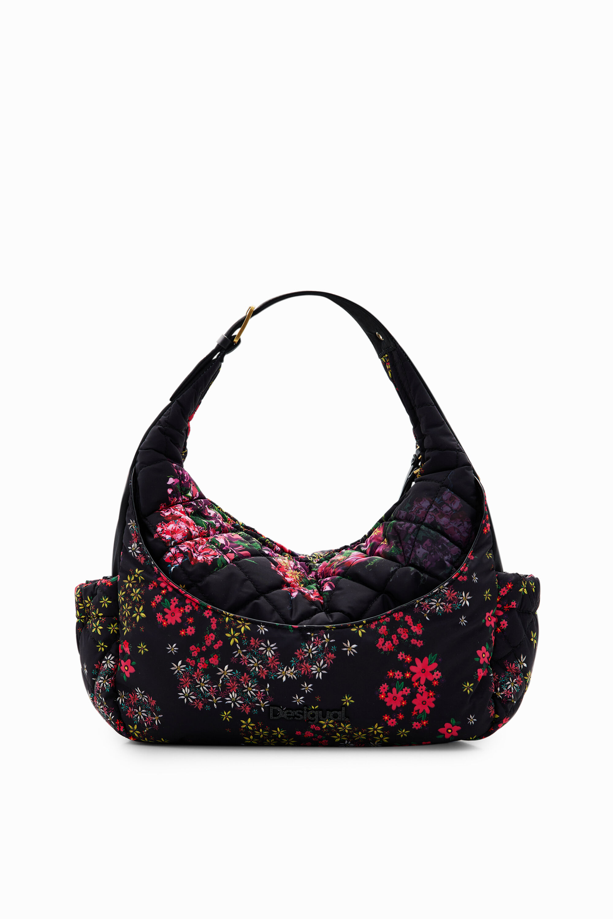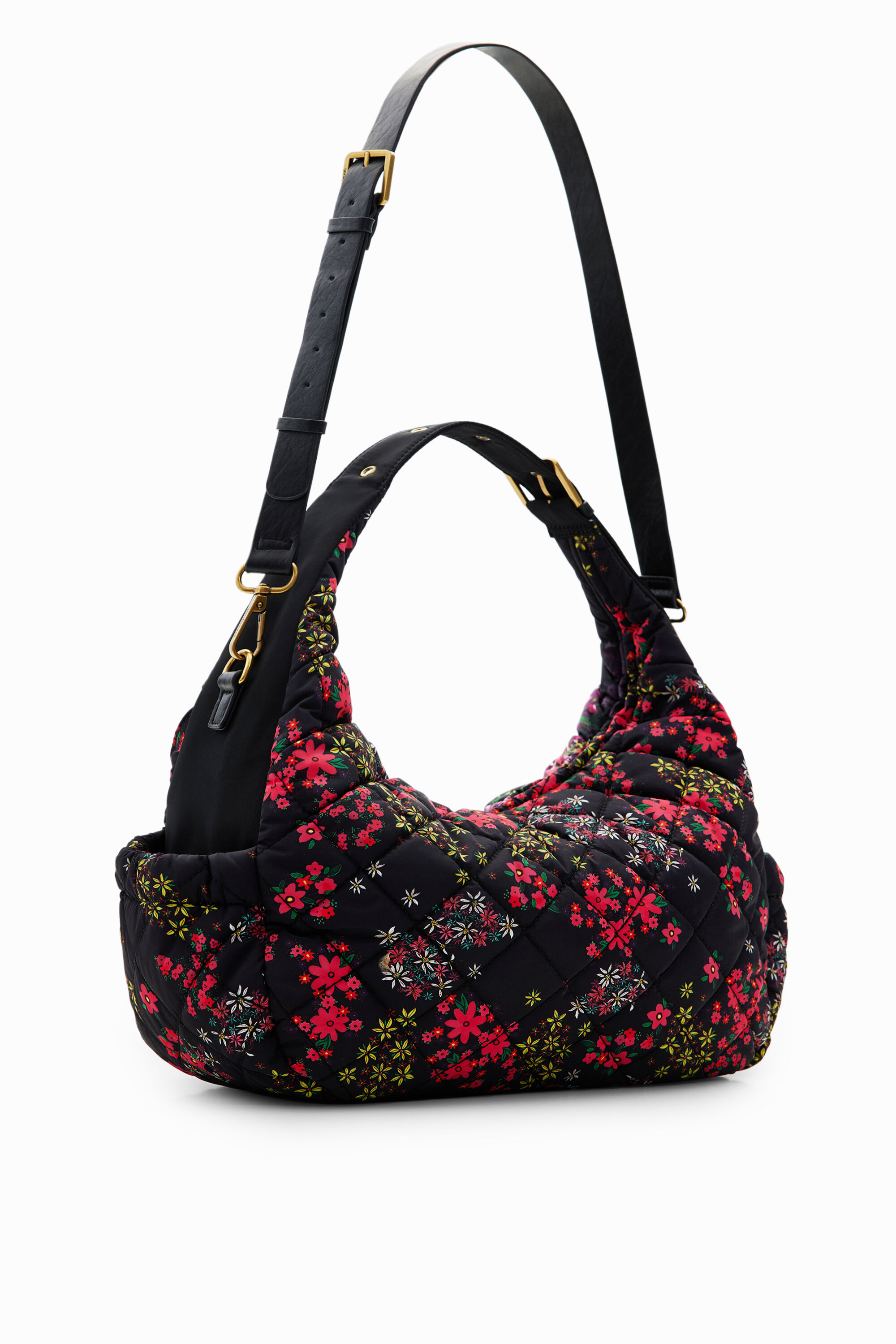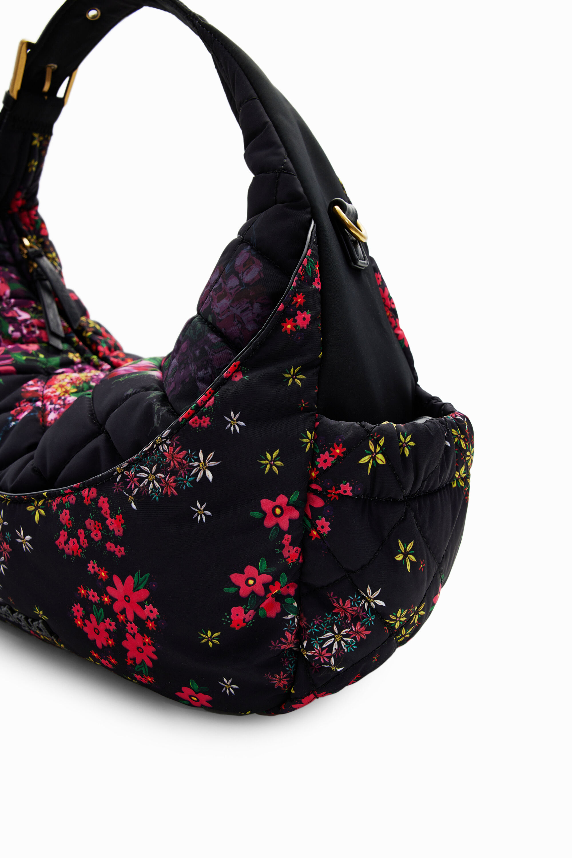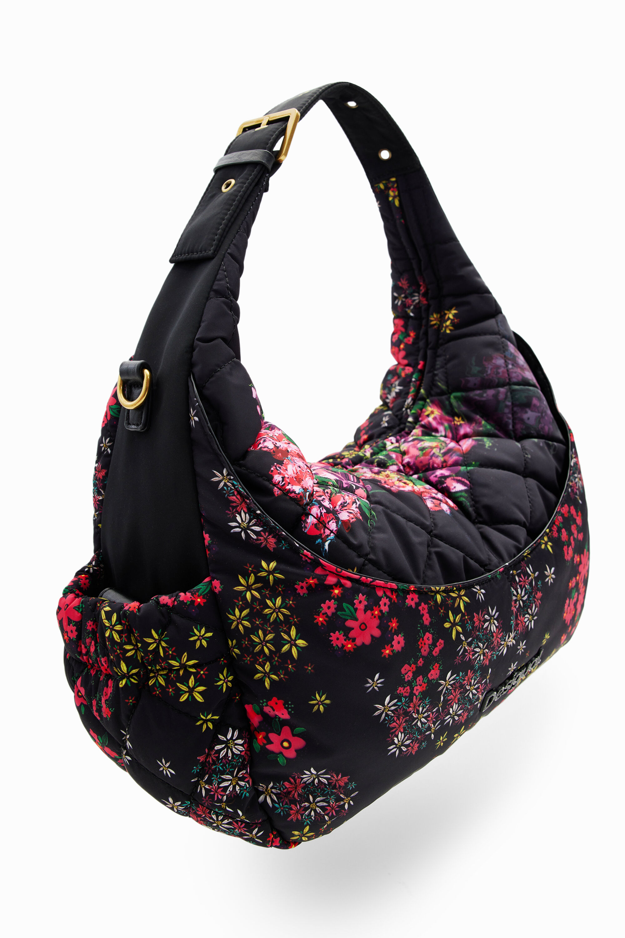 A large shoulder bag in lightweight padded nylon, with a contrasting print and several straps and pockets.Contrasting printMultiple inside and outside pocketsZip closureOne compartmentTwo strapsAdjustable fixed strap for carrying on the shoulderLong, detachable, adjustable crossbody strapRecycled polyester34 x 13.9 x 25 cm