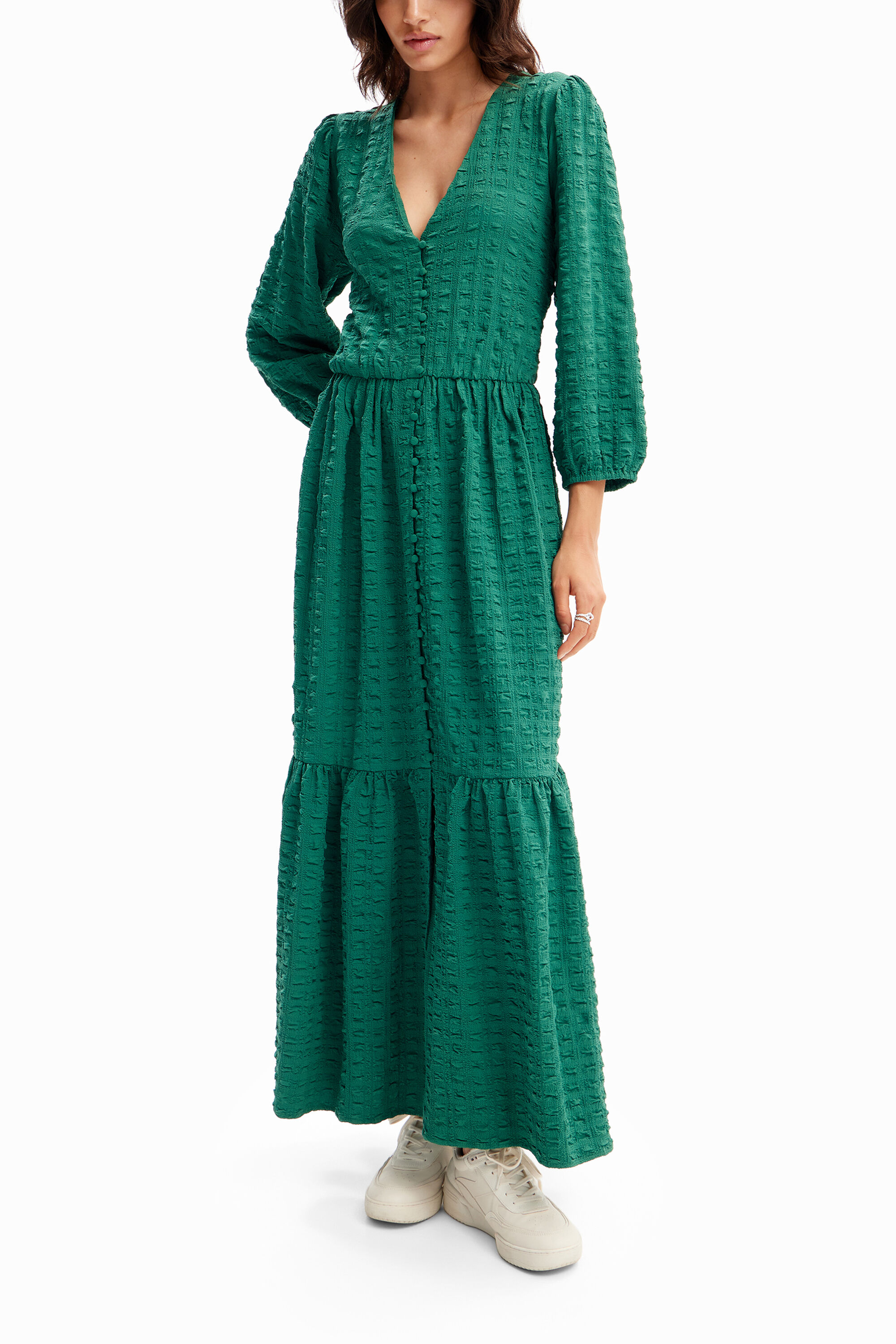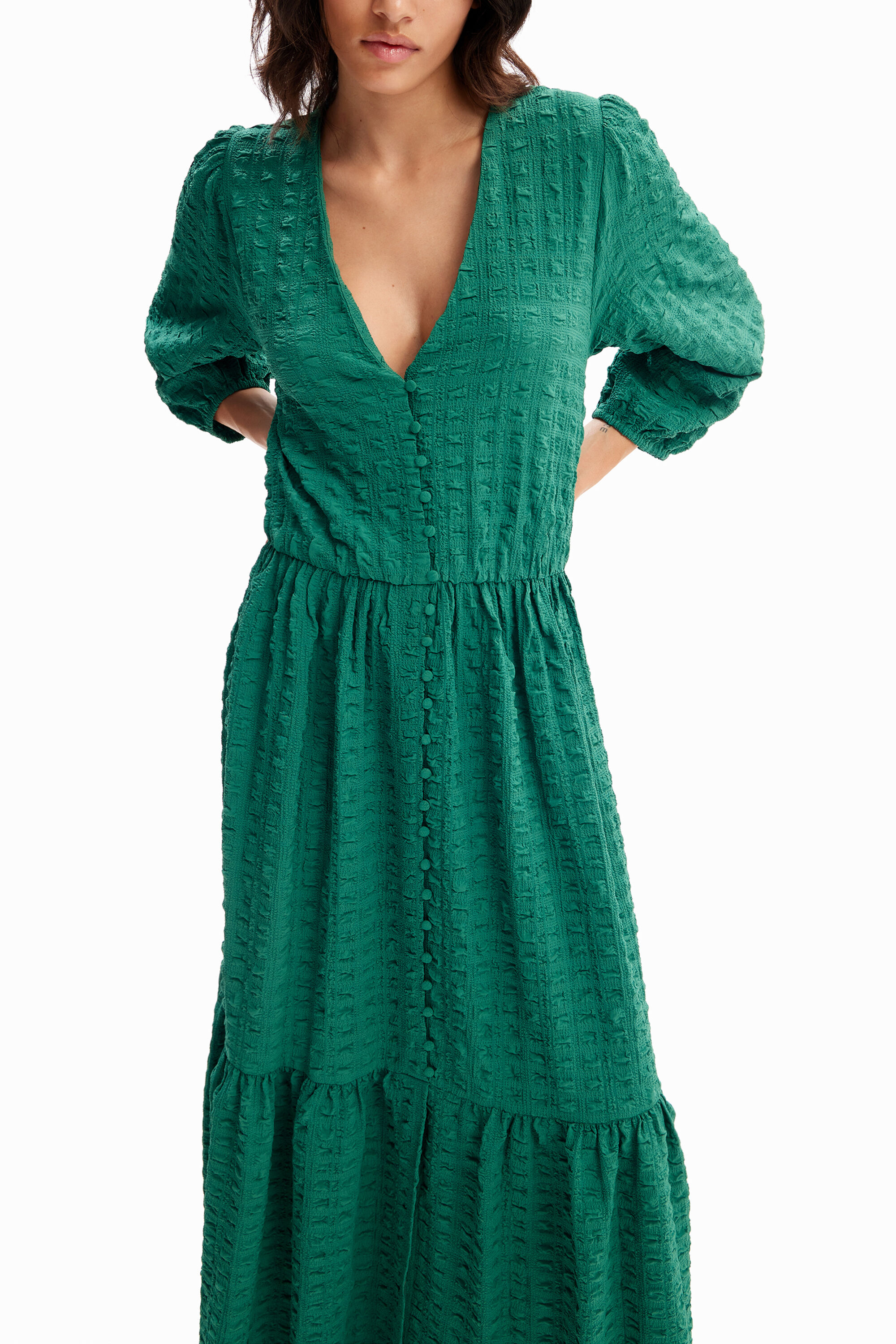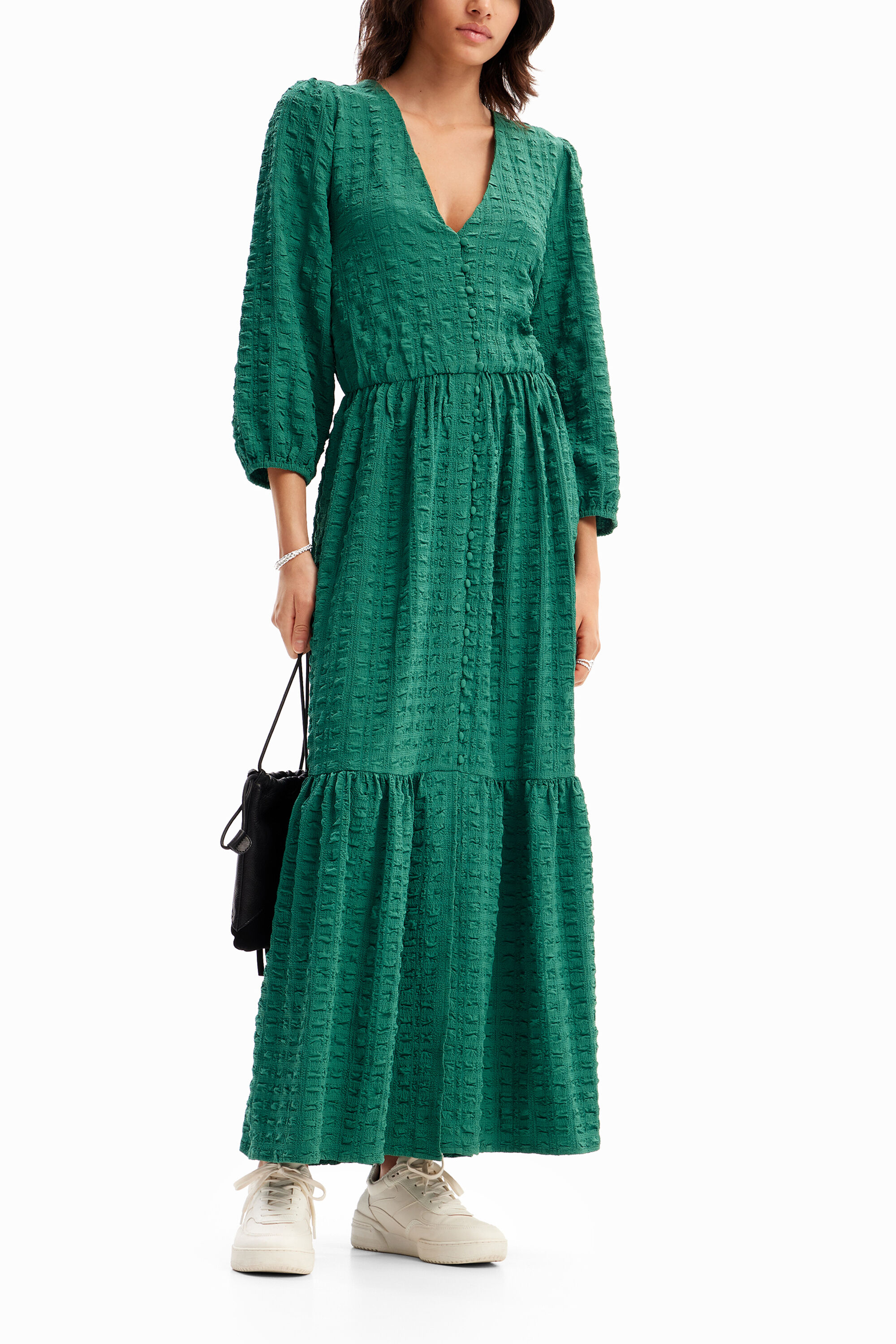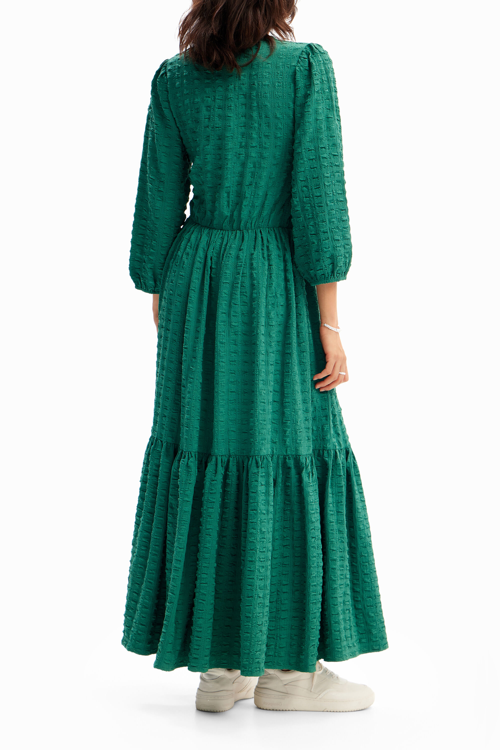 A shirt-style long dress with 3/4 puff sleeves and textured fabric.Fit: