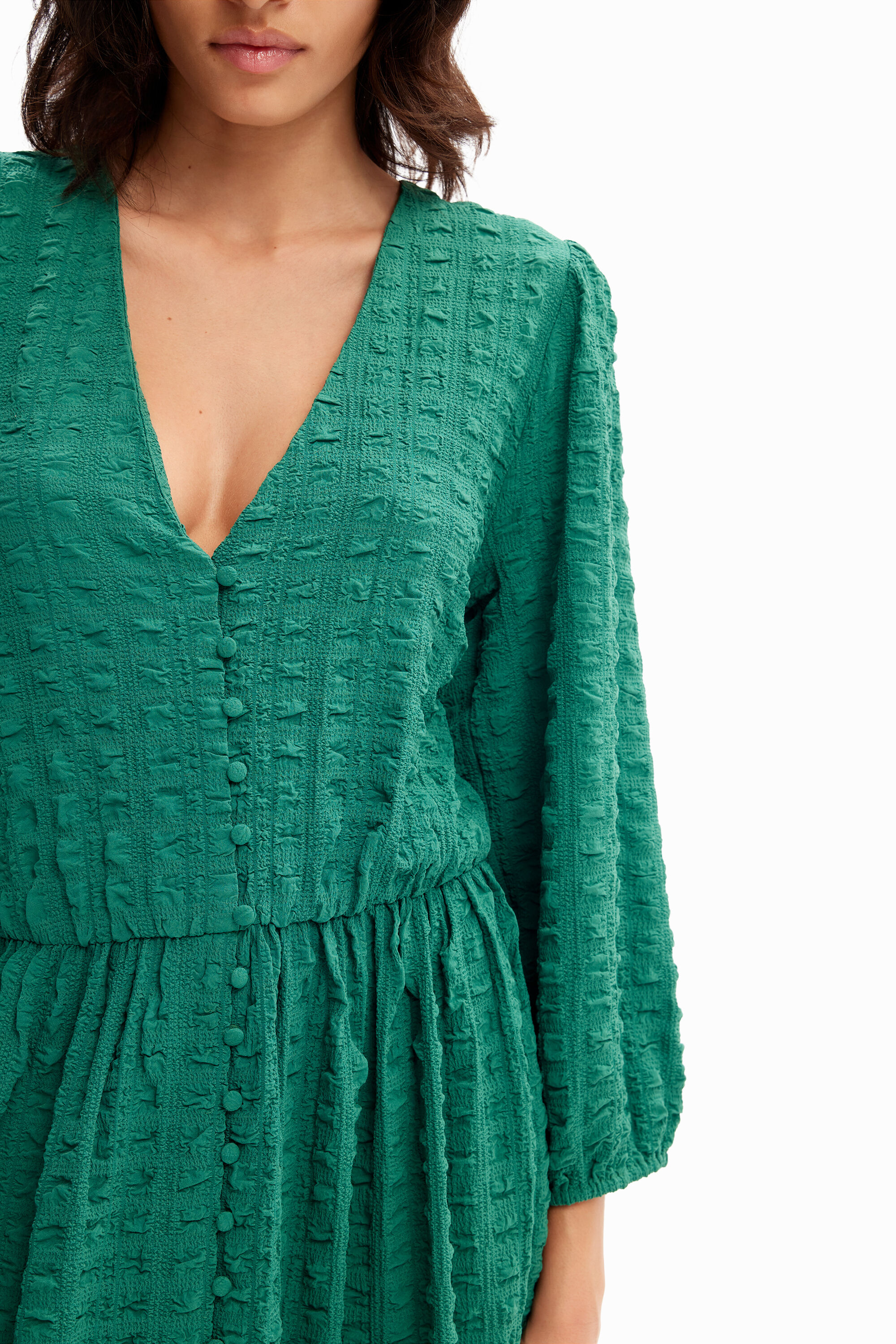 MaxiPlain colour with textureV-neck3/4 sleevesSlightly elasticated waistFront button fasteningSustainable fibres: