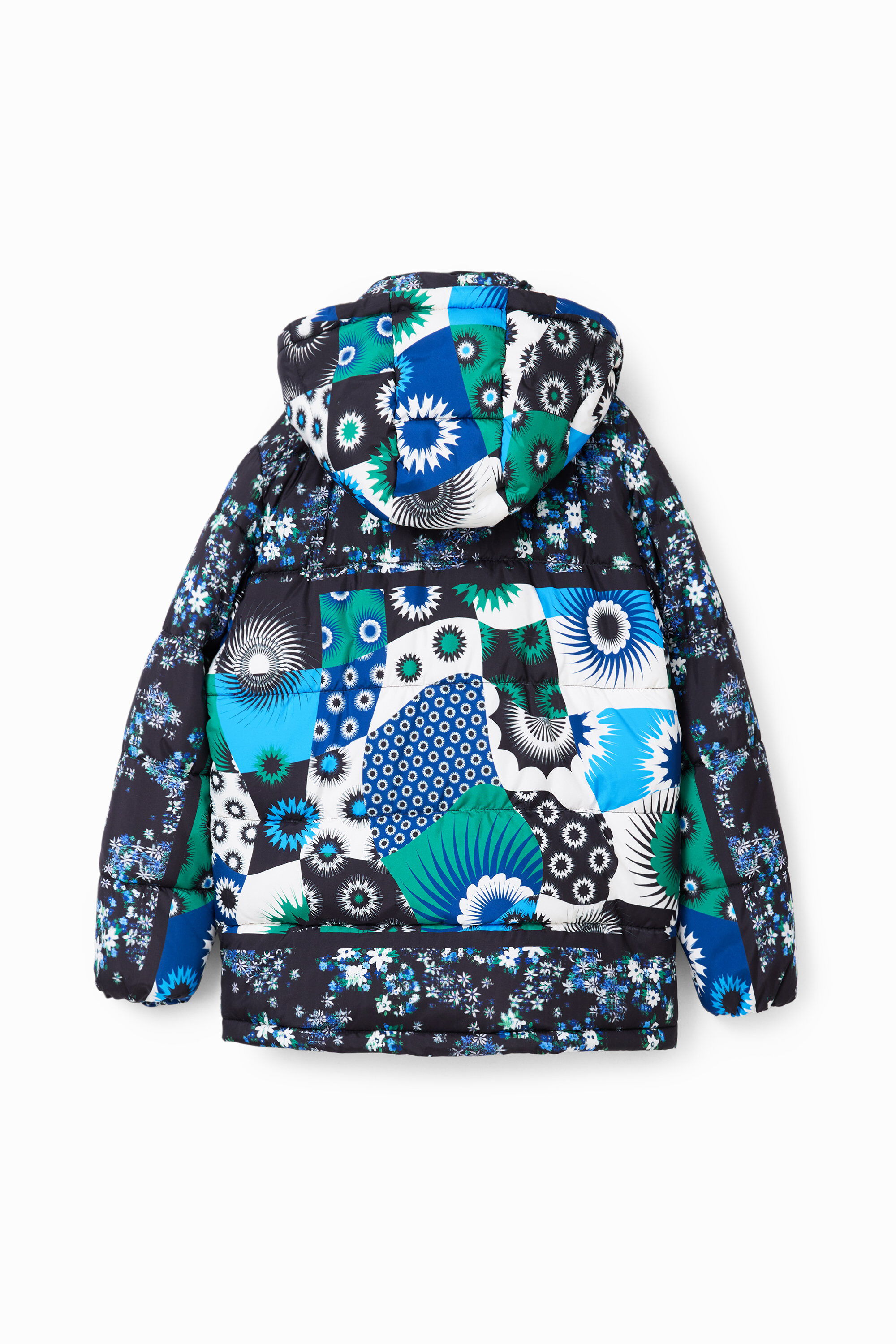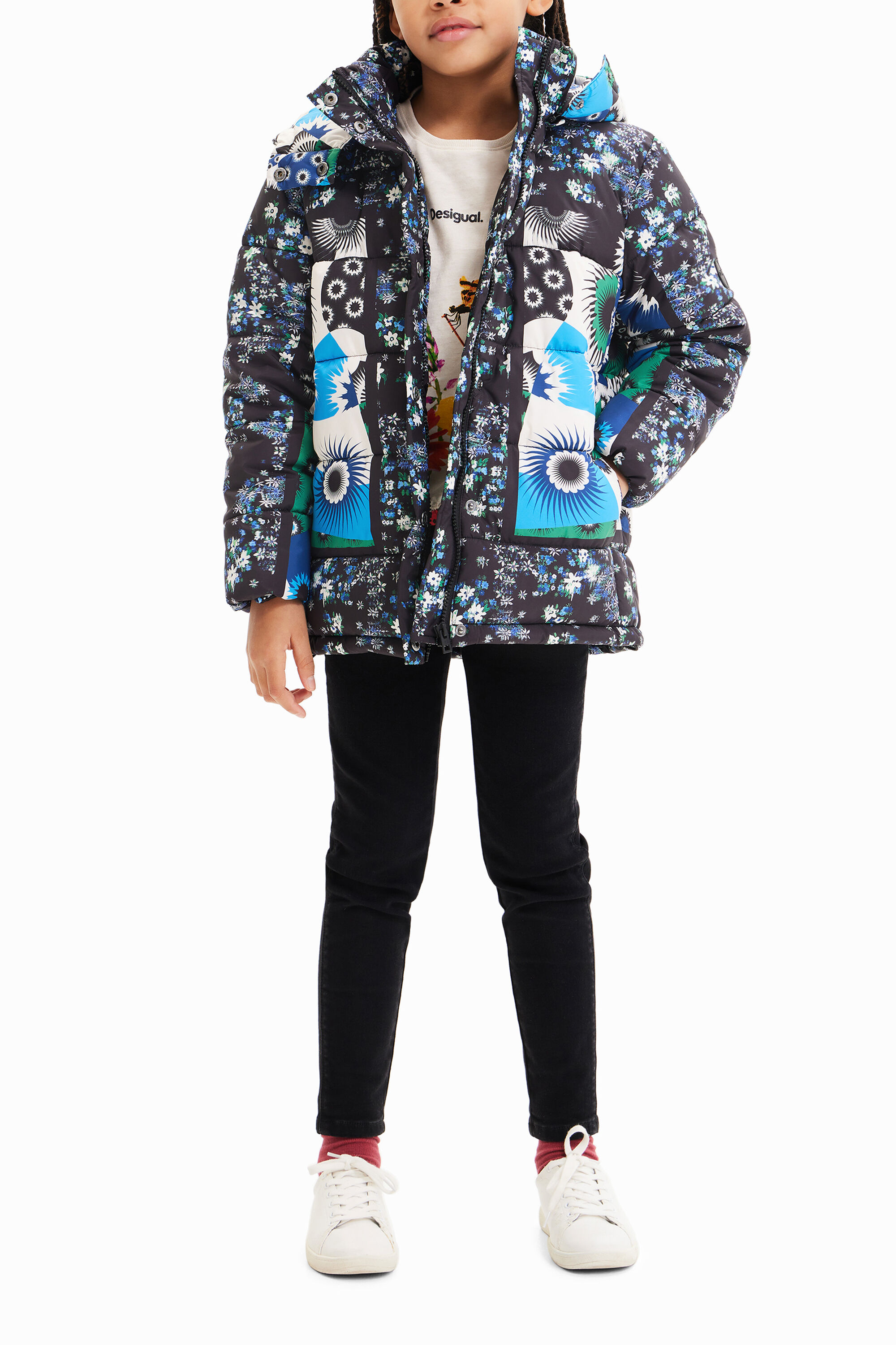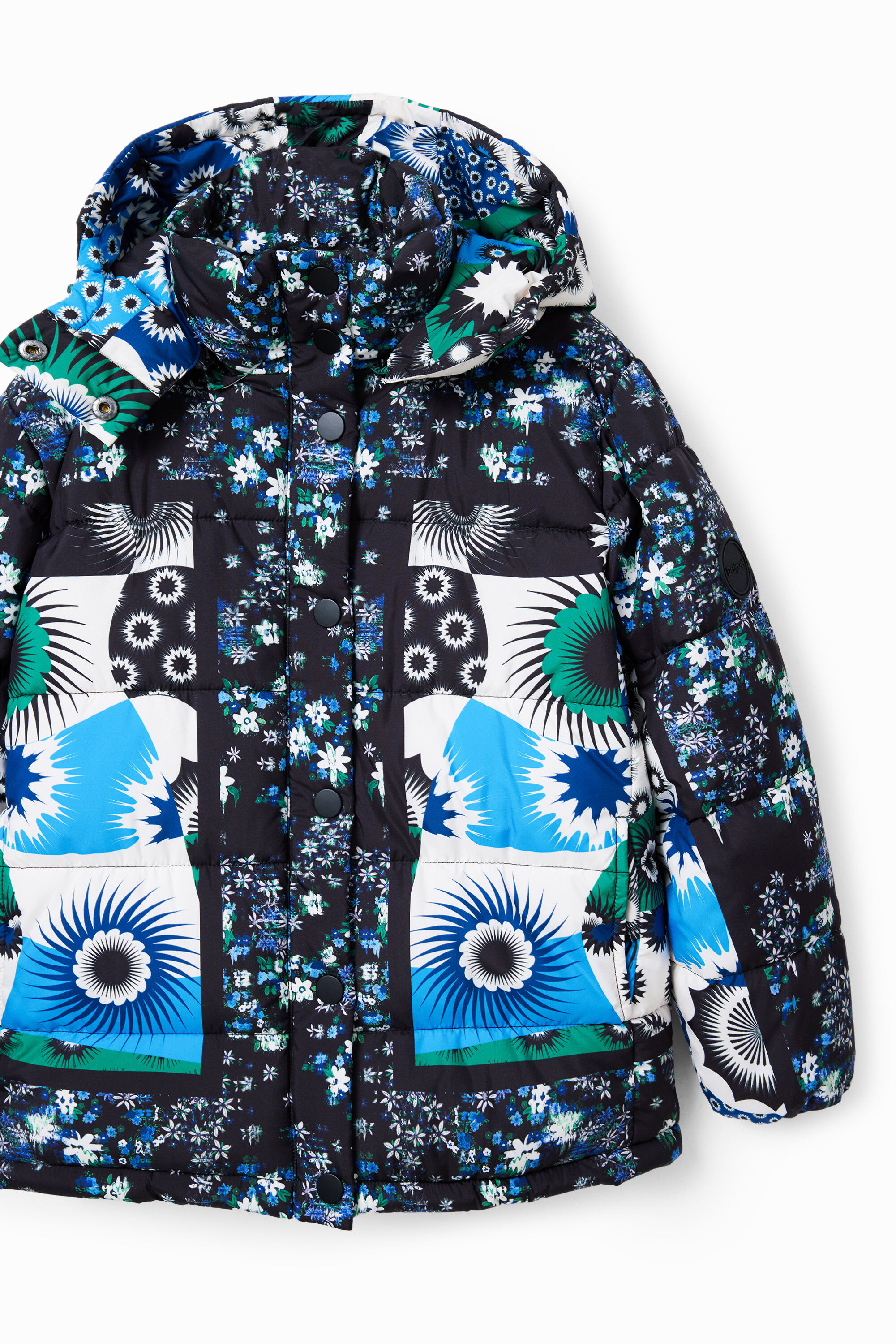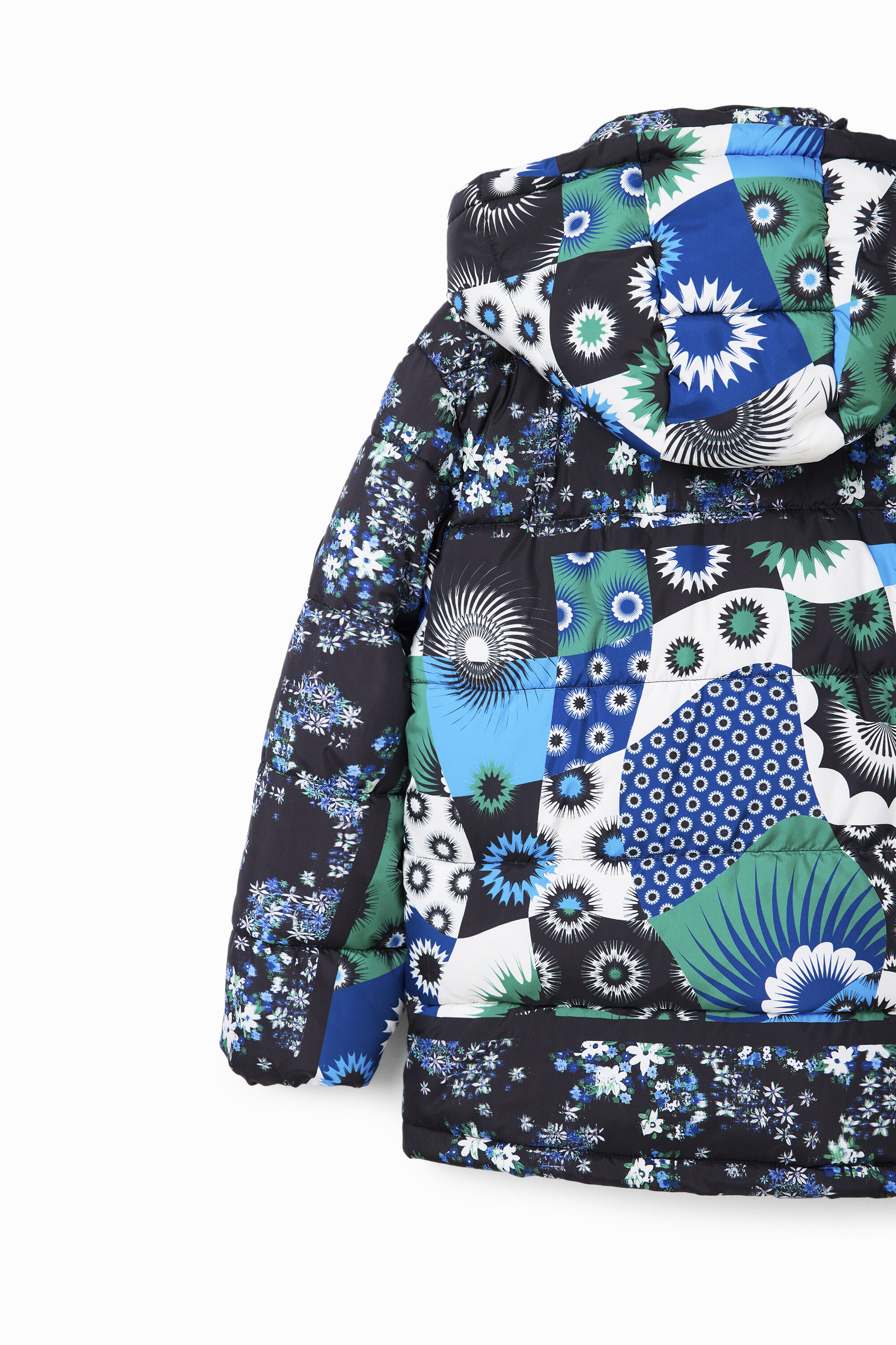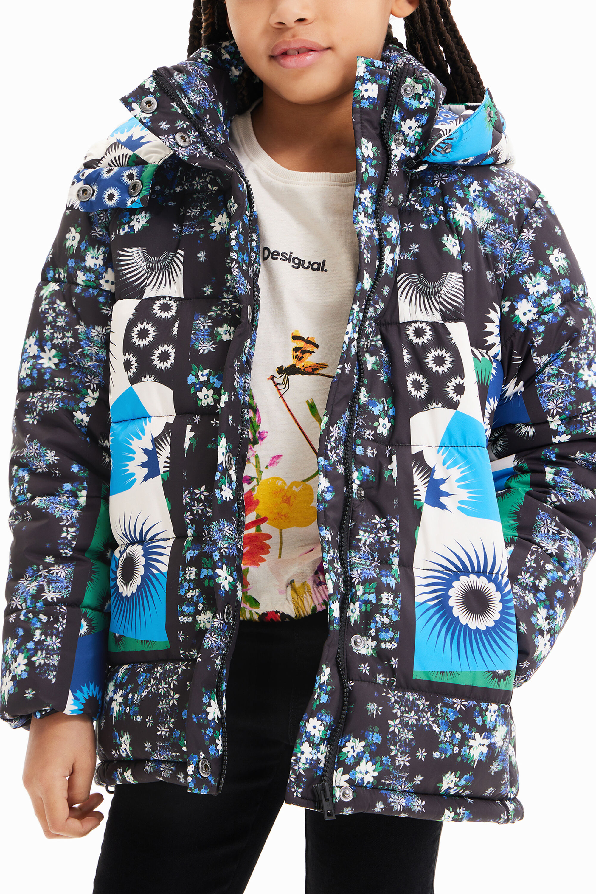 A padded jacket with a detachable hood, double zip and a patchwork print with floral and geometric motifs.Fit: RegularPatchwork print of small flowers and geometric motifsHigh neckDetachable hood with zipLong sleeves with elasticAdjustable drawstrings on the hemTwo pocketsZip and snap button fasteningMini me version: jacket also available in the Woman collectionWater repellentSustainable fibres: Recycled polyester