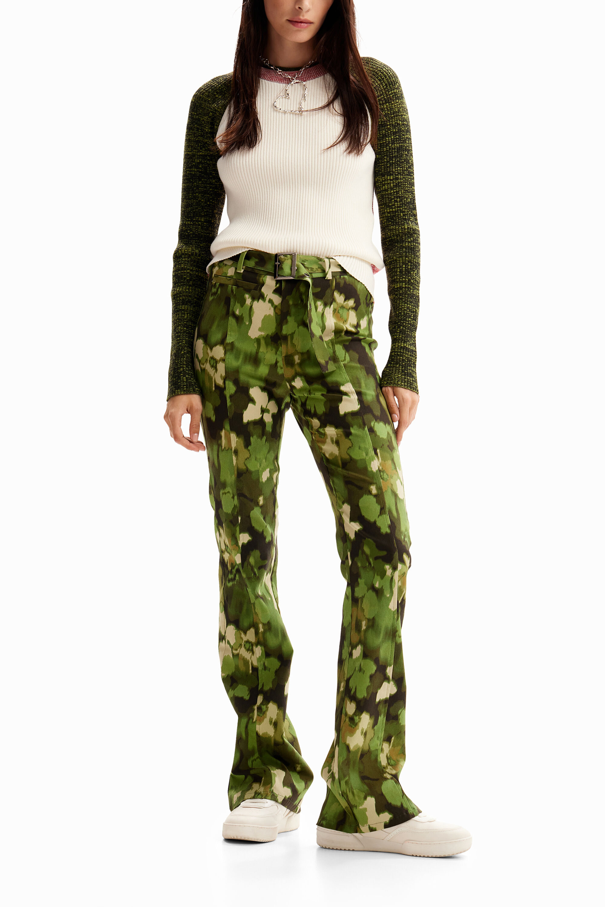 Fitted trousers in stretch fabric, flared from the knee with central seams, a belt and a floral camouflage print.Fit: FlareLength: StandardCamouflage-style floral printHigh waistSix pocketsHook and eye, inside button and zip closureRemovable belt with buckle