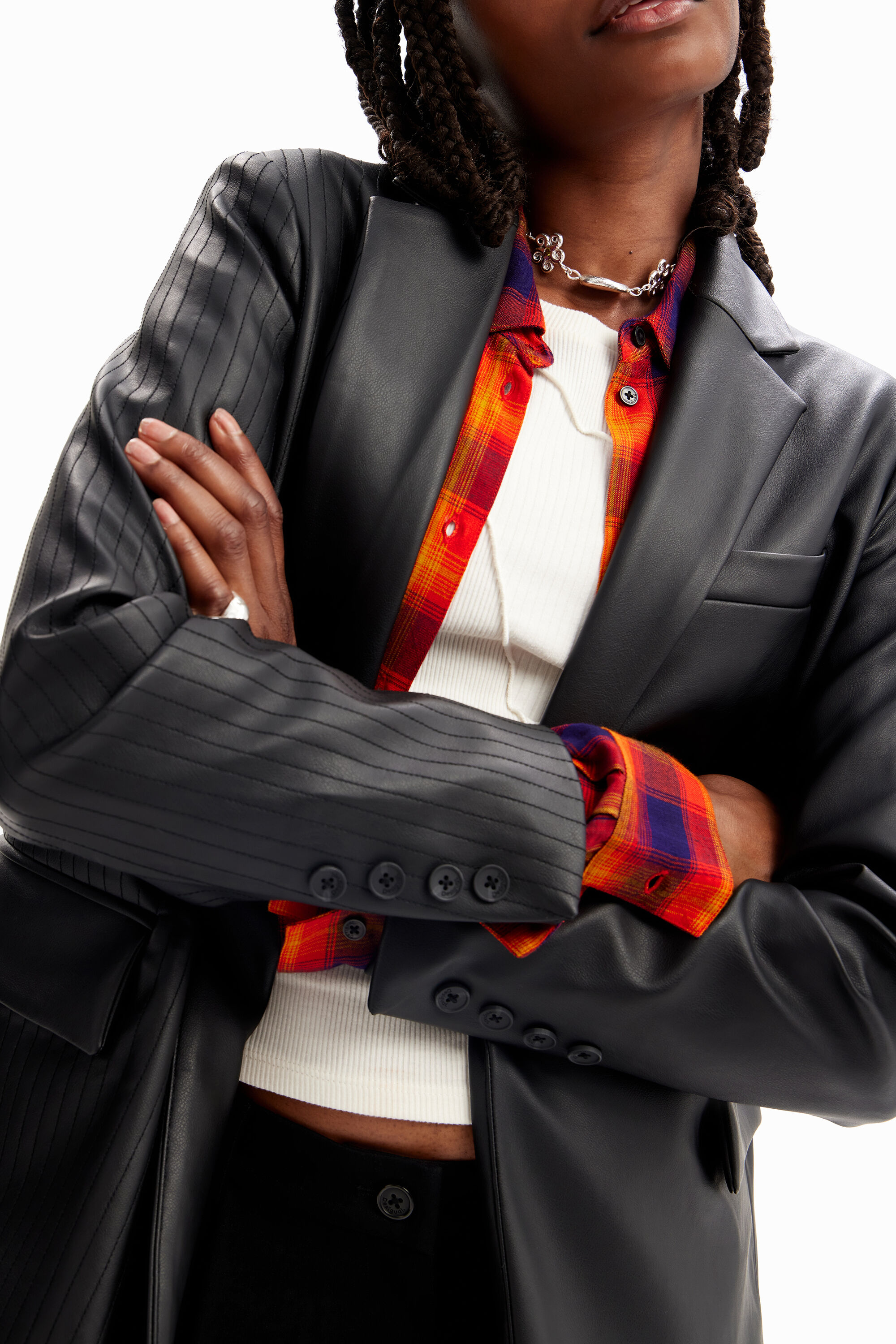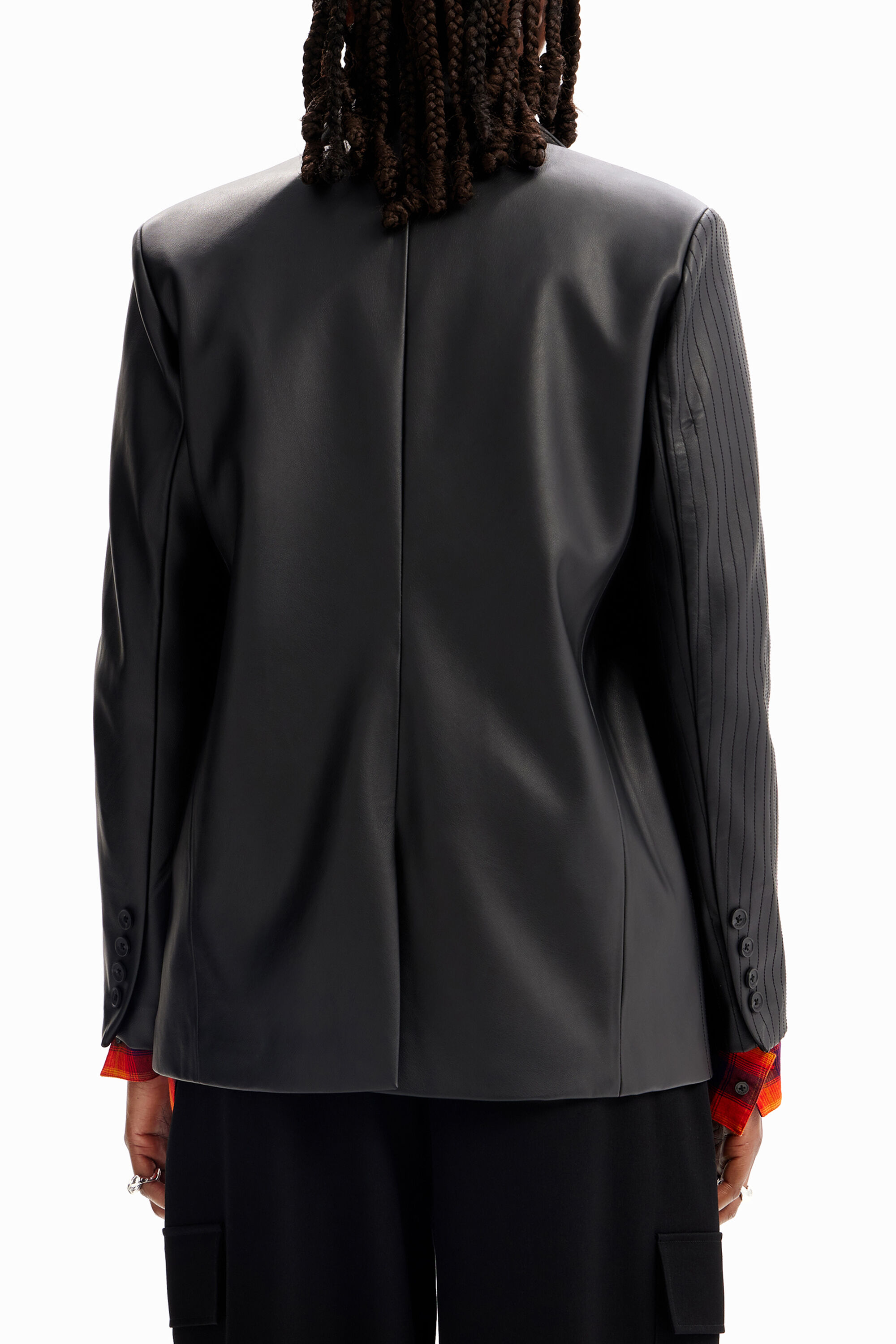A straight-cut blazer in leather-effect fabric with tone-on-tone stitching on one half.