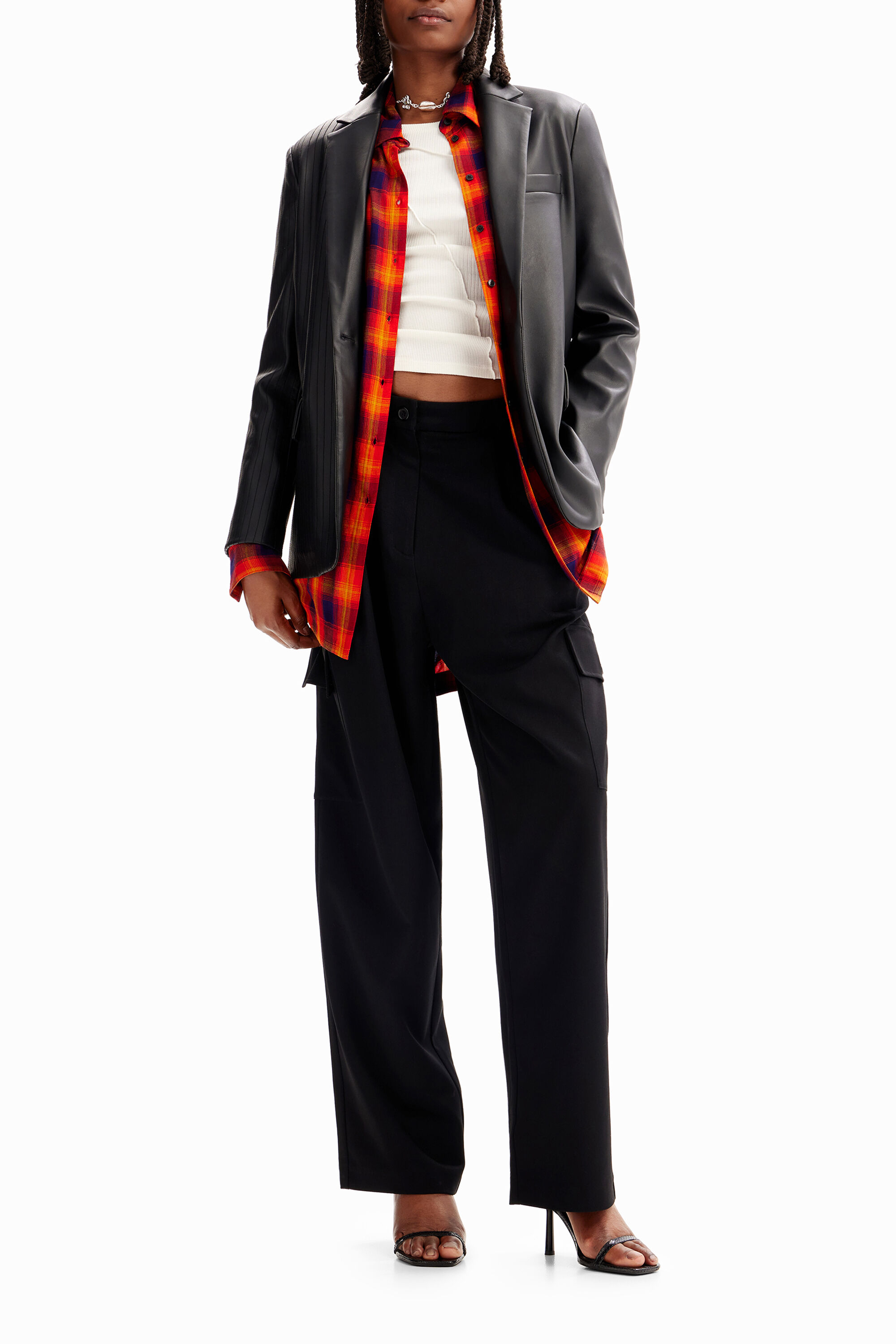 Featuring a lapel collar, shoulder pads and pockets.Fit: RegularPlain colour with tone-on-tone vertical stitchingLapel collarLong sleeves with decorative buttonsTwo pocketsButton fasteningRear slit on the hemLeather-effect fabric
