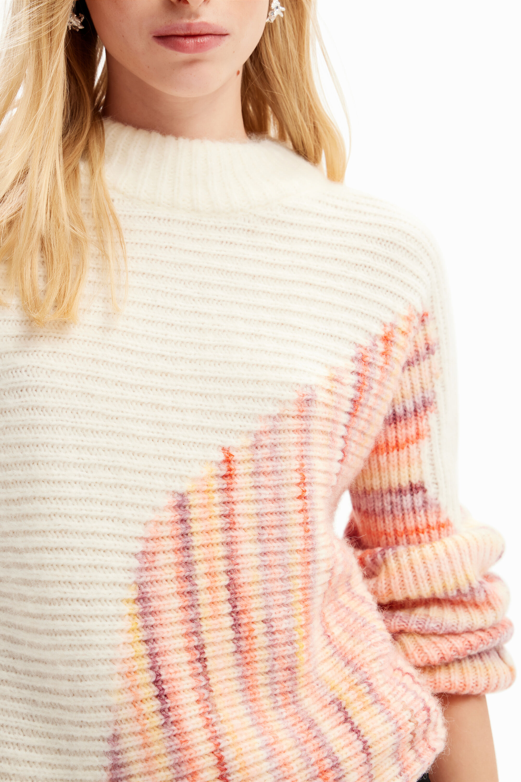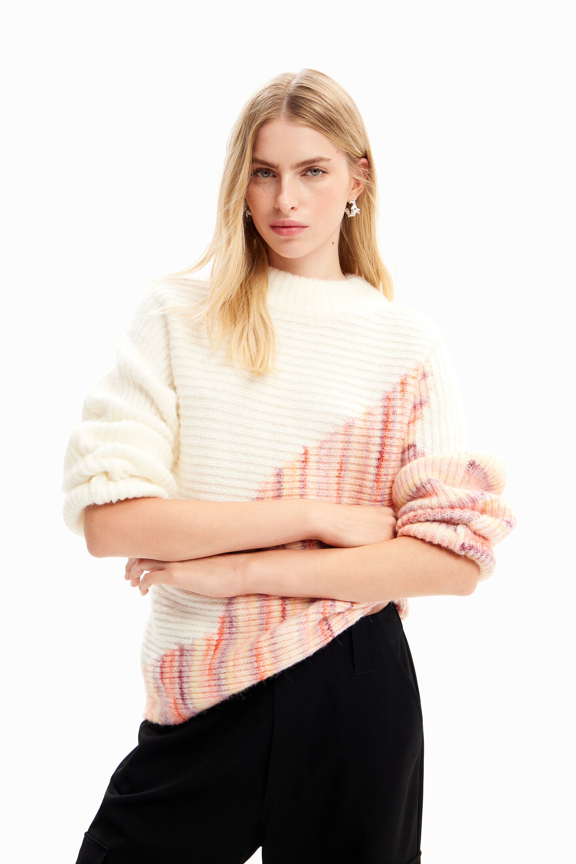 A pullover with long puff sleeves in chunky ribbed knit with an asymmetric design: