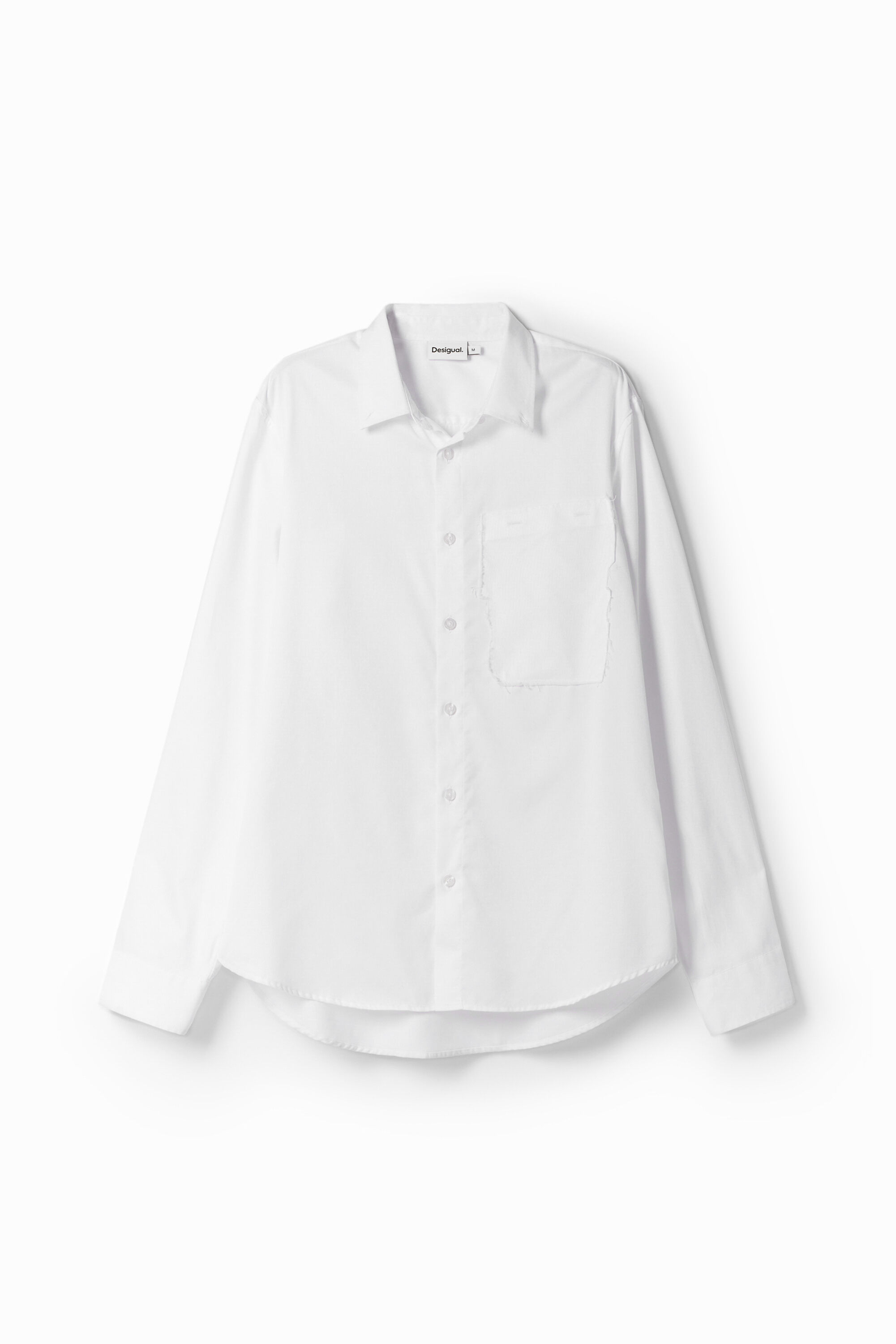 Long-sleeved plain poplin shirt with texture and Oxford fabric, front pocket, and frayed shirt piece effect patch on the back.Fit: