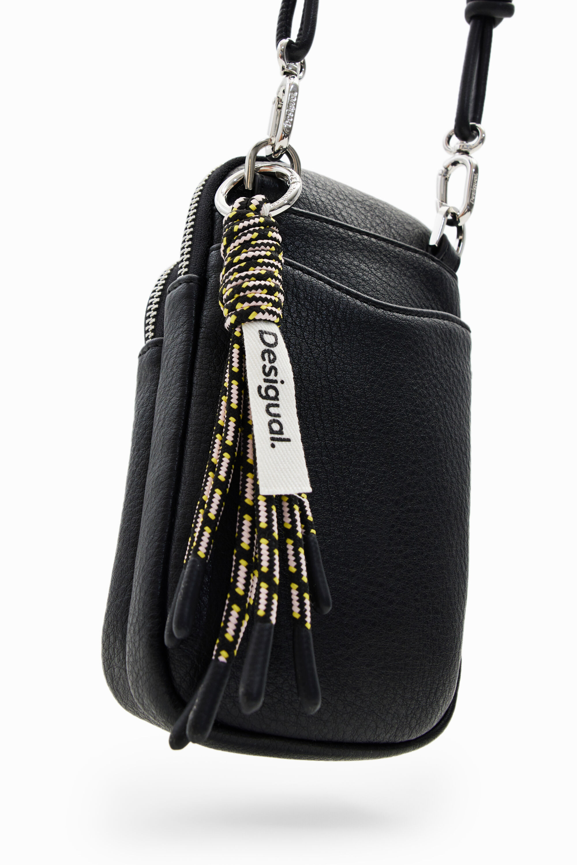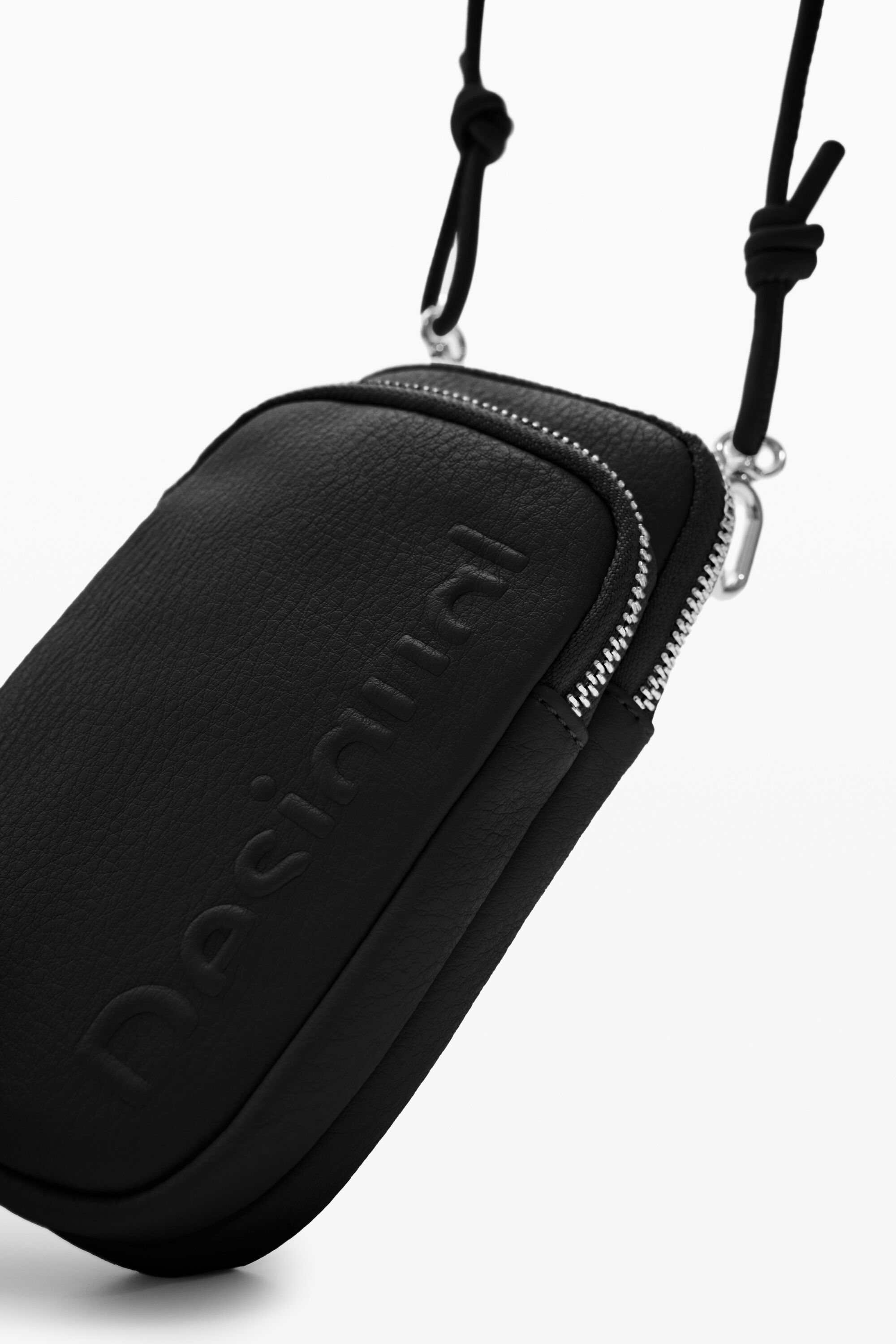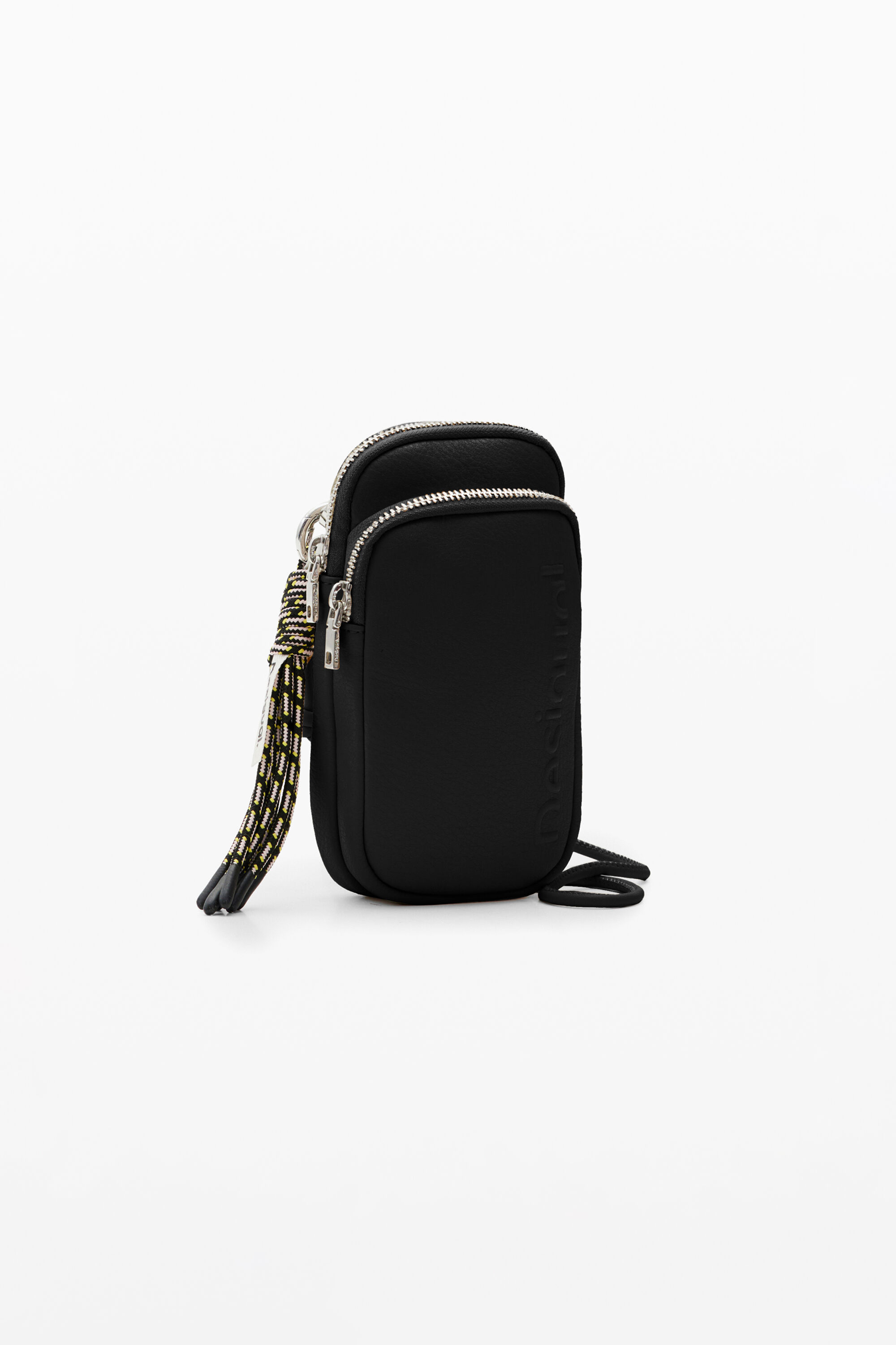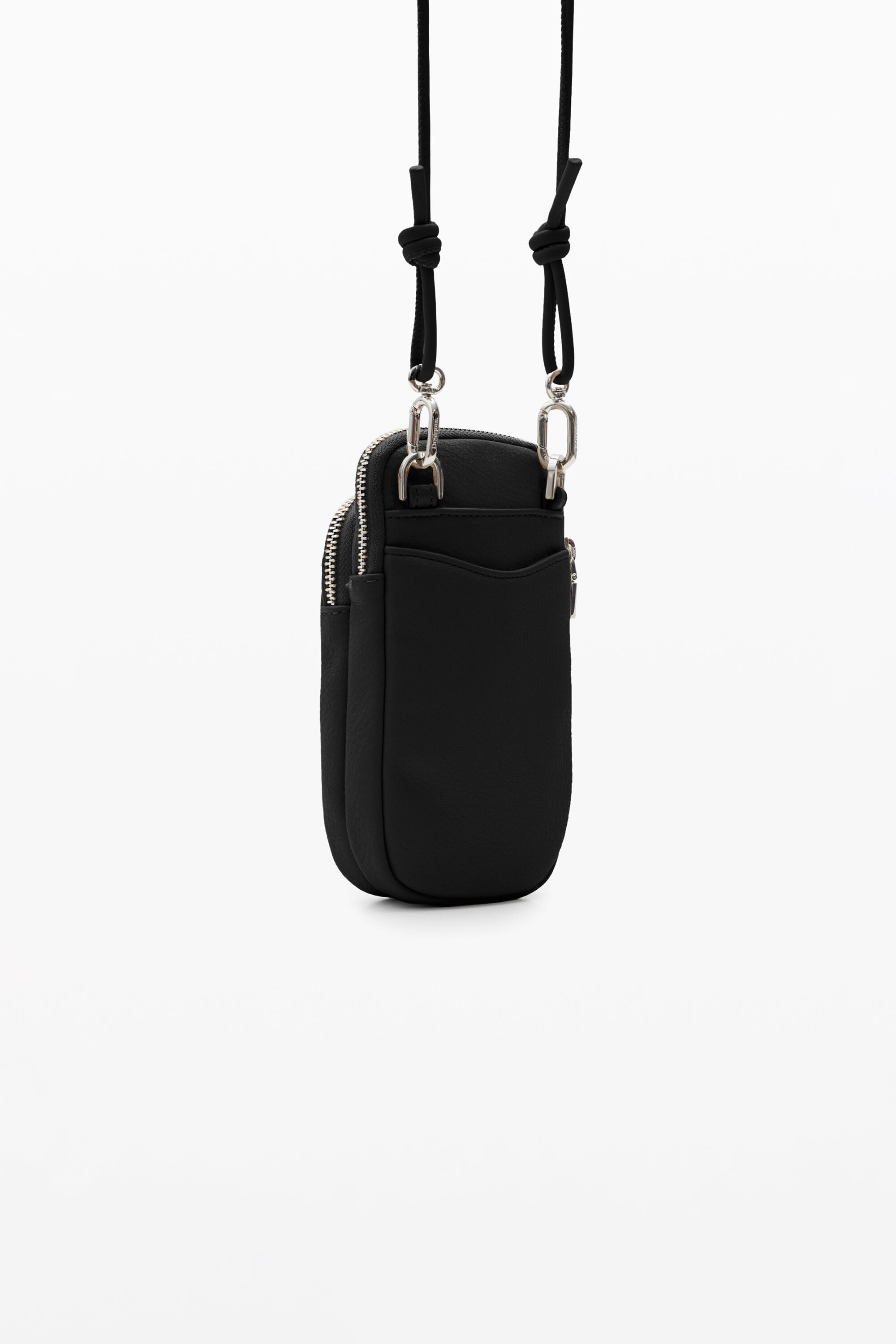 A leather-effect smartphone pouch with a strap, zip closure and several pockets.Plain colourMultiple inside and outside pocketsZip closureLong, adjustable, detachable strapDetachable keyring with cordsEmbossed half logo10.5 x 4 x 18.5 cm