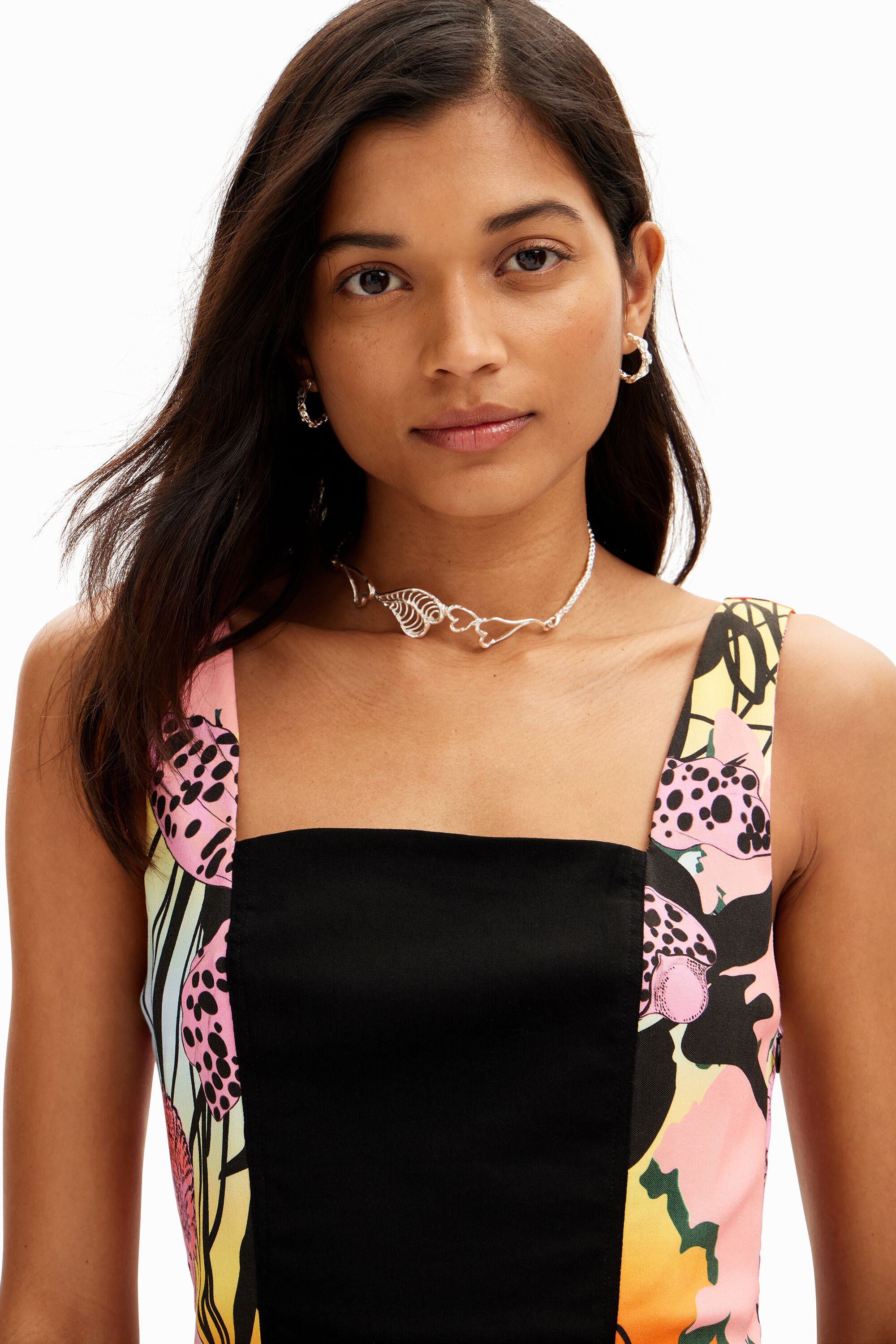 MiniPlain colour and multicolour orchid print Square neckWide strapsHidden side zip closureStretch fabricLining on the top part