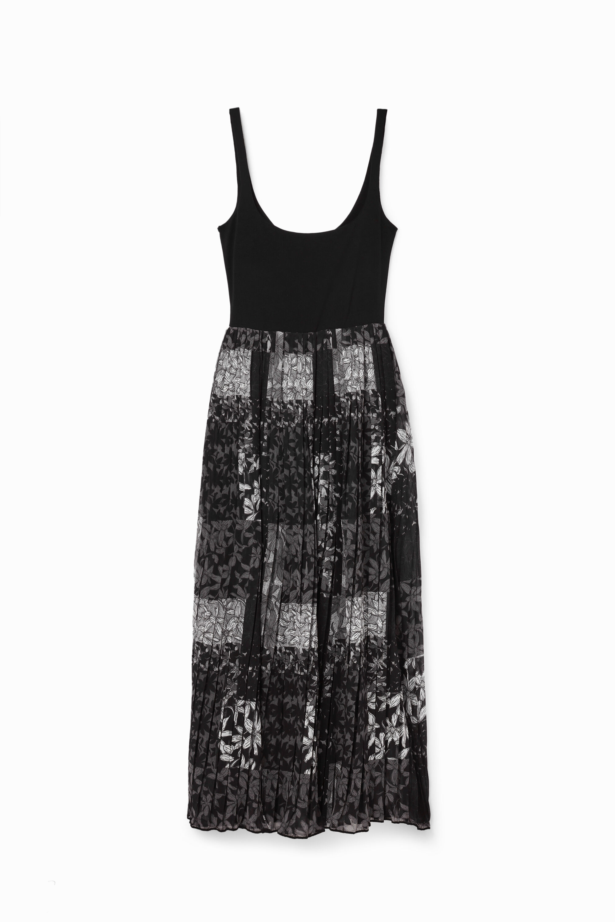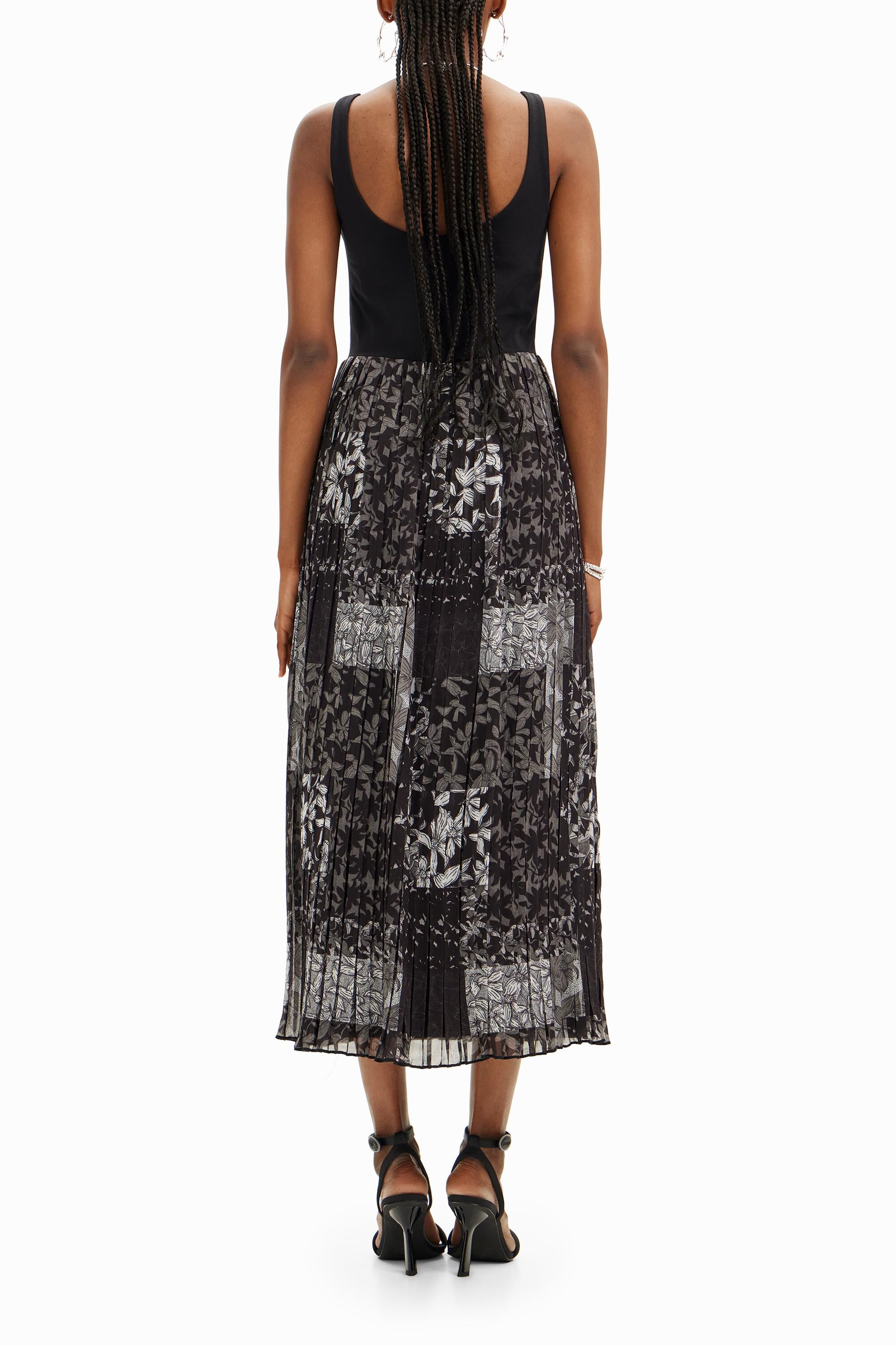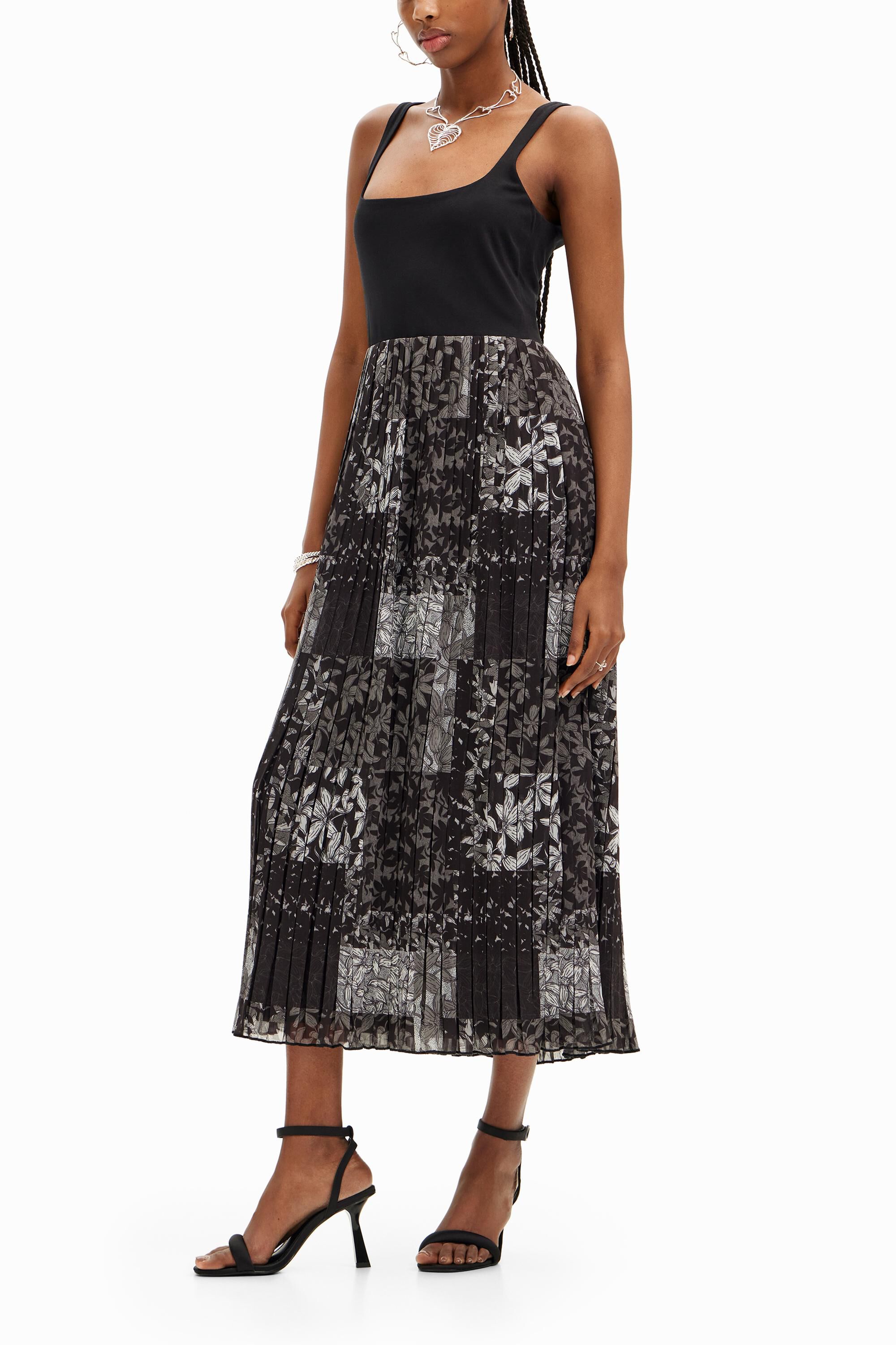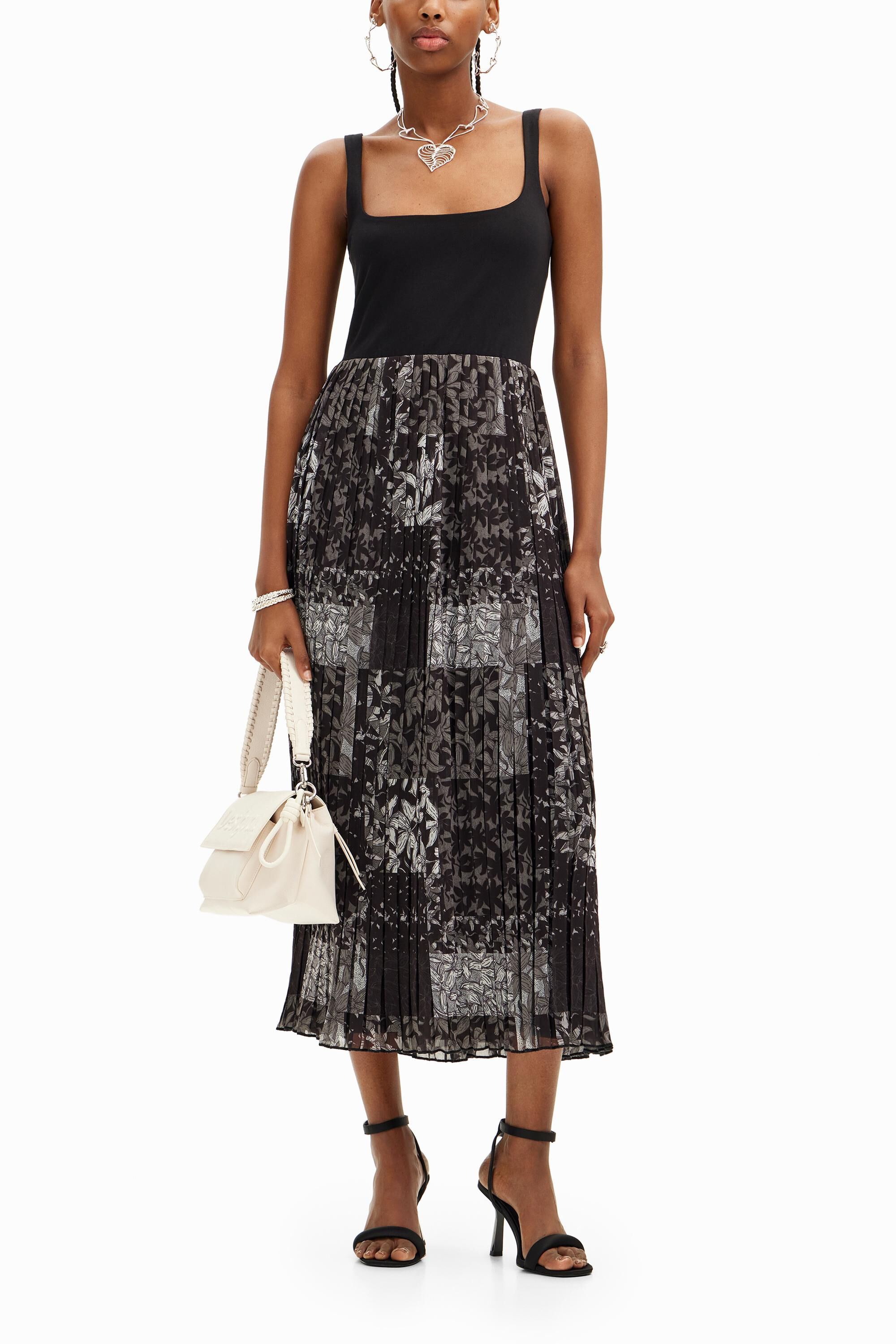 MidiPlain colour and floral patchwork-effect printSquare neckStraps No fasteningWide pleated skirt with lining