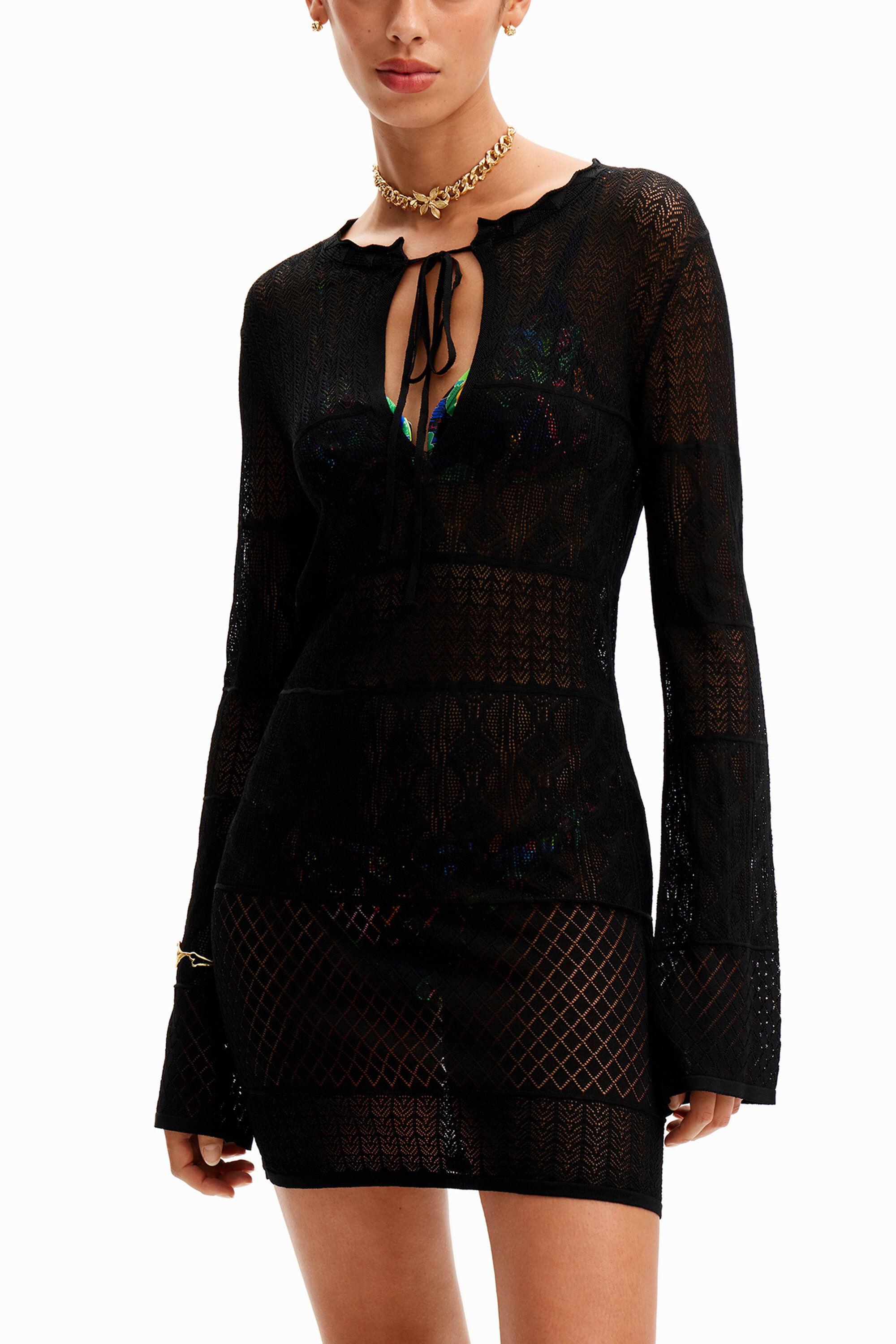 A short tunic-style dress that ties at the neck with long sleeves and knit fabric with openwork.Fit: RegularLength: ShortPlain knit with geometric motif openworkV-neck with tiesSubtly flared extra-long sleevesNo fasteningNeck with wavy edgeSheer stretch knit fabric