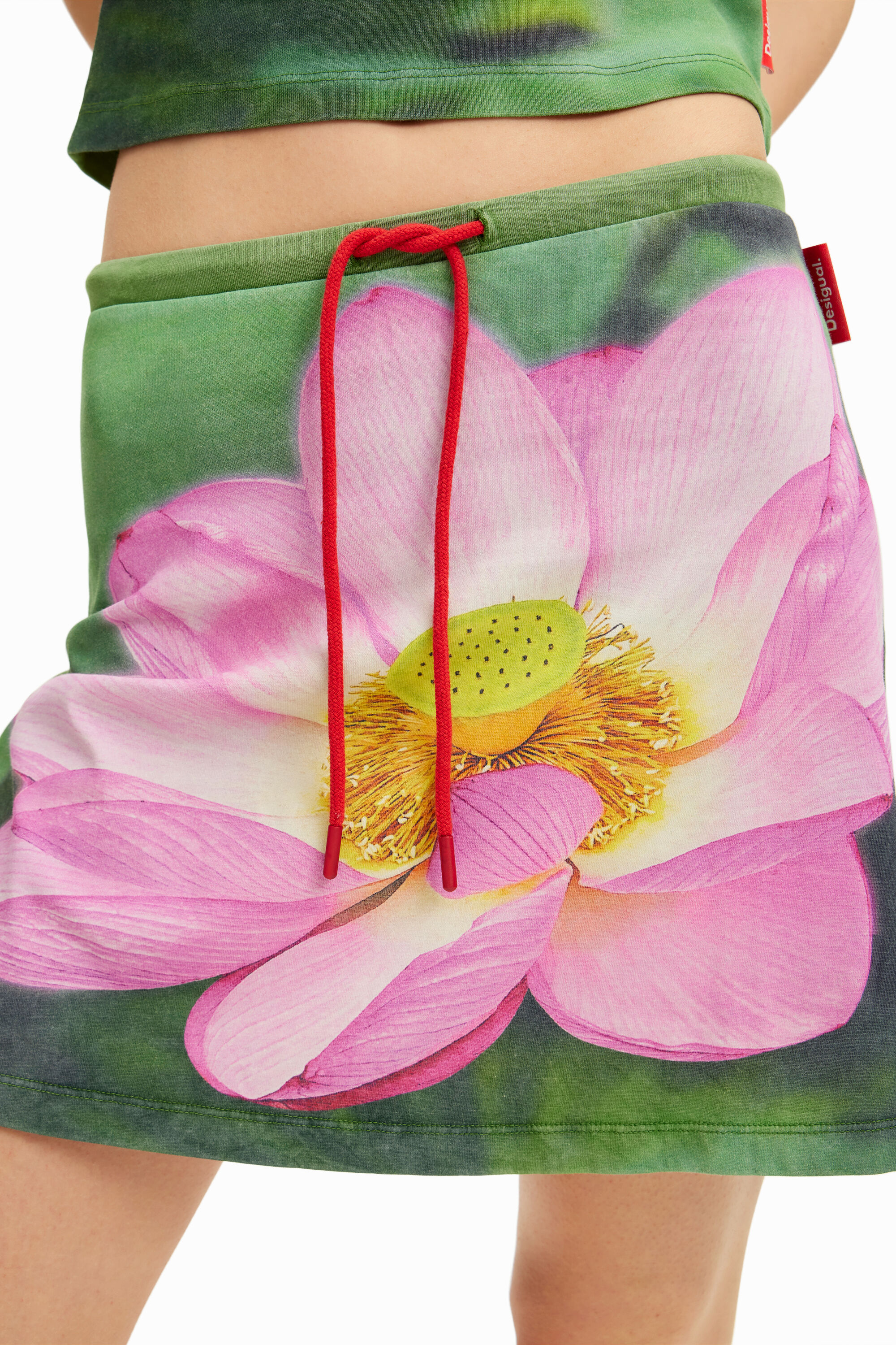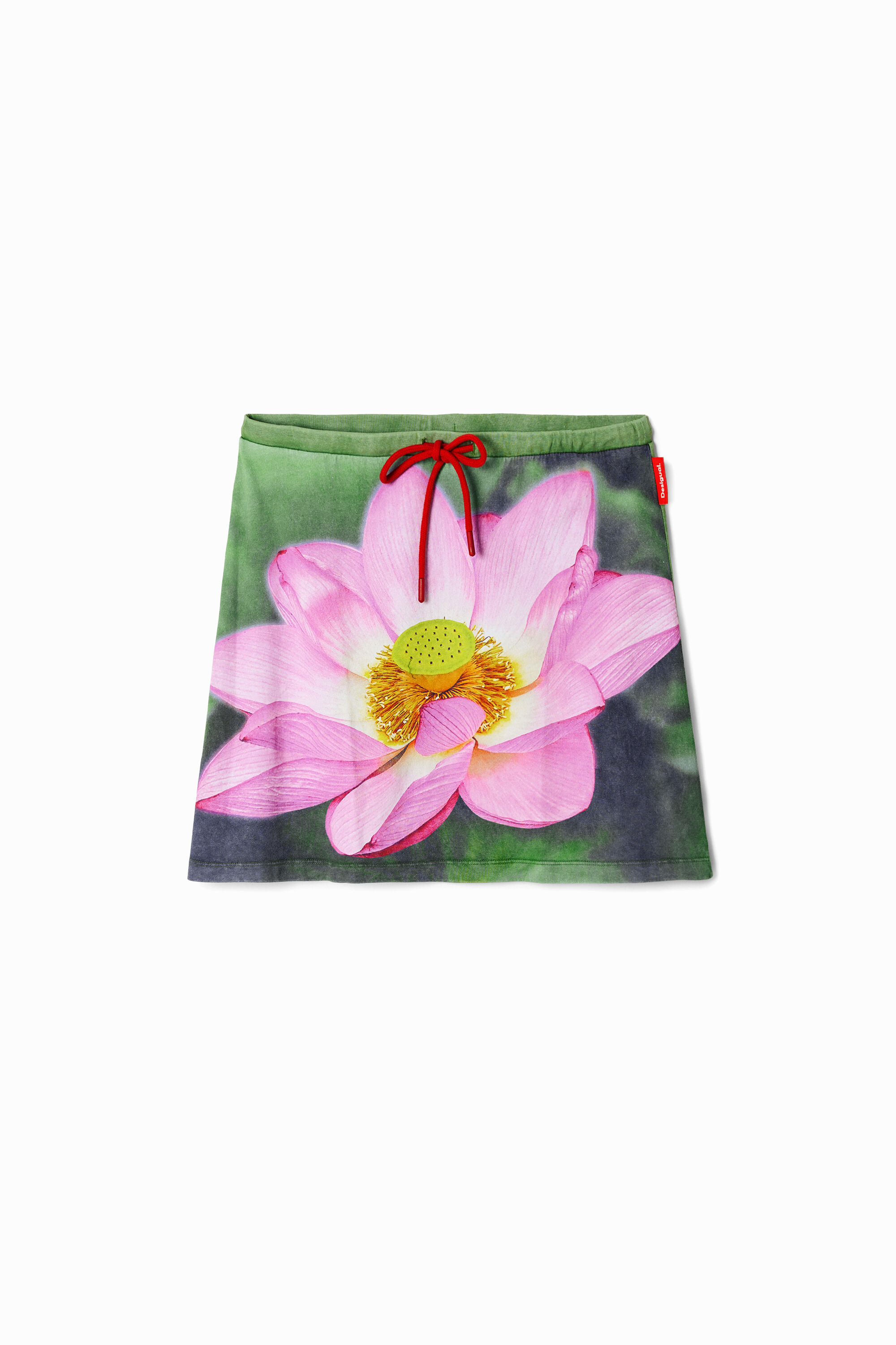 Adjustable stretch mini skirt with lotus flower print on the front.