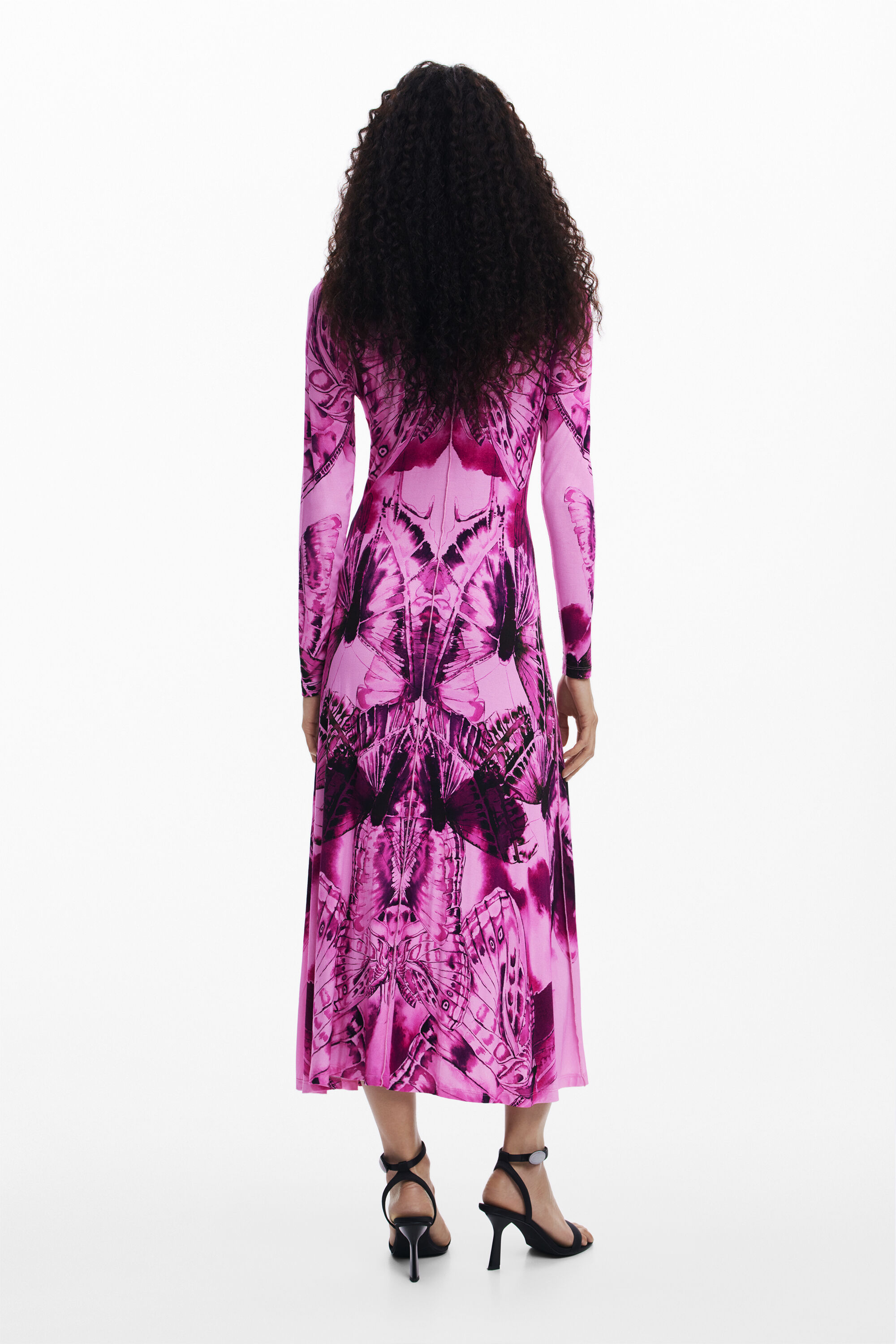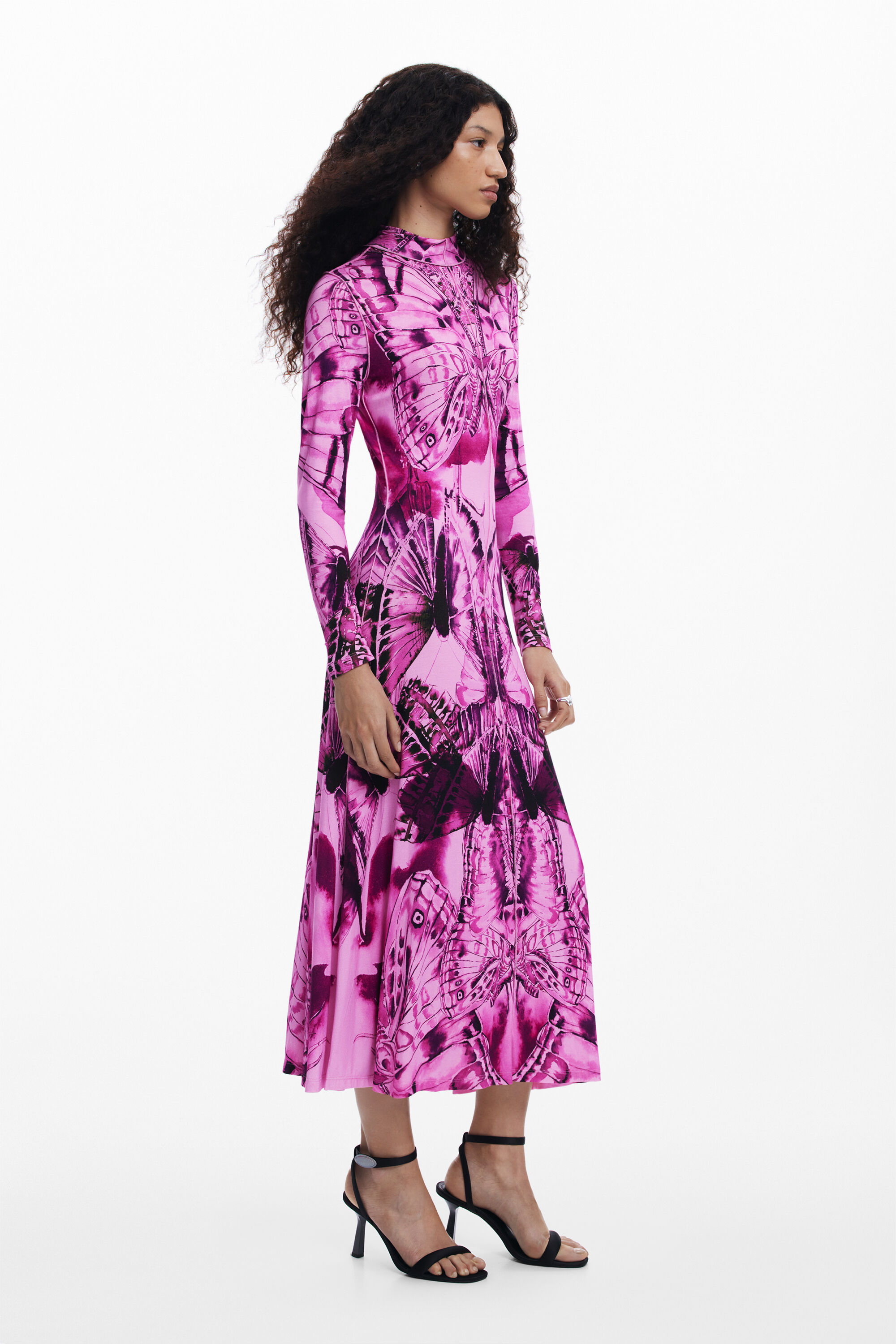 Fitted midi dress with long sleeves and Turtleneck with butterfly printFit: