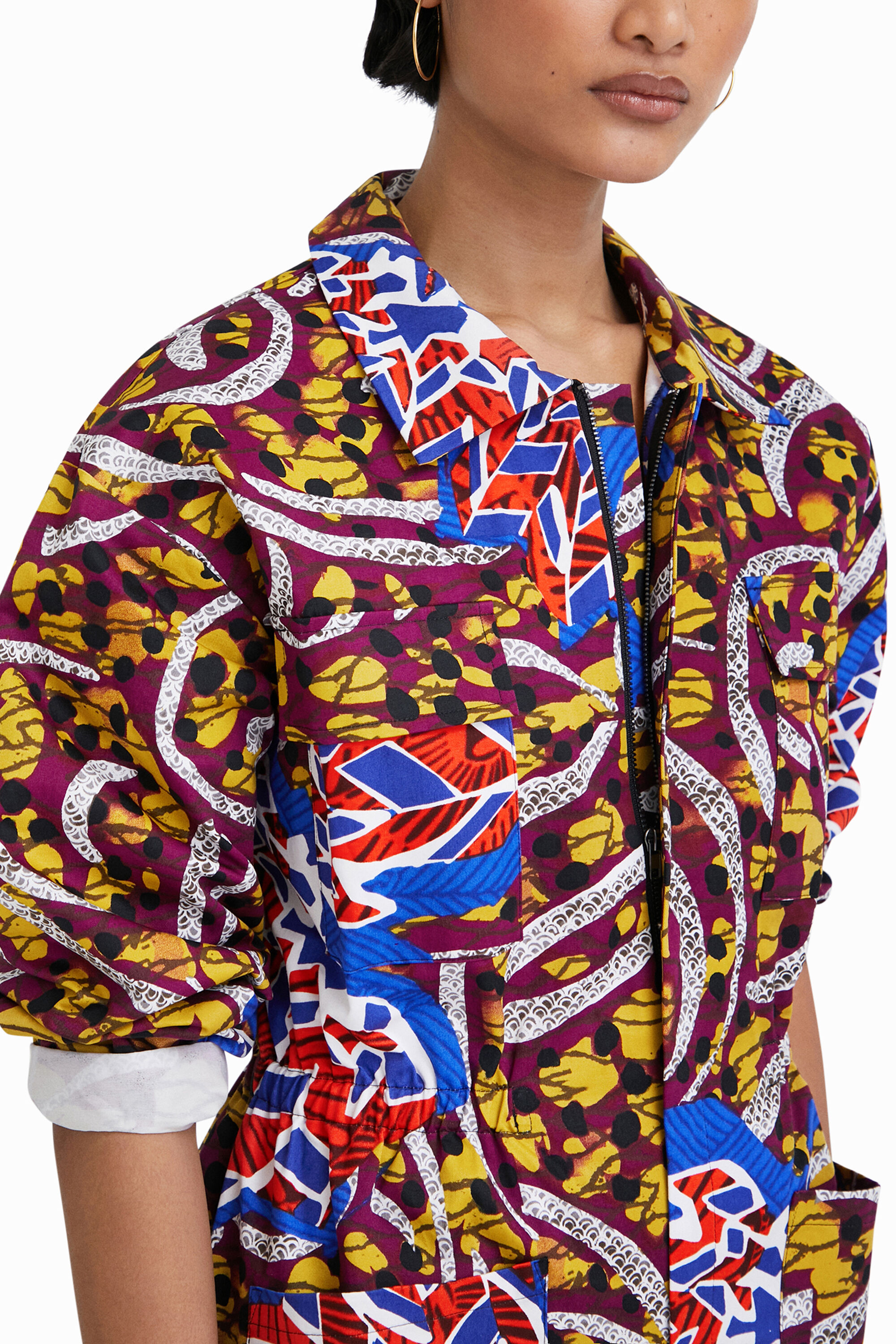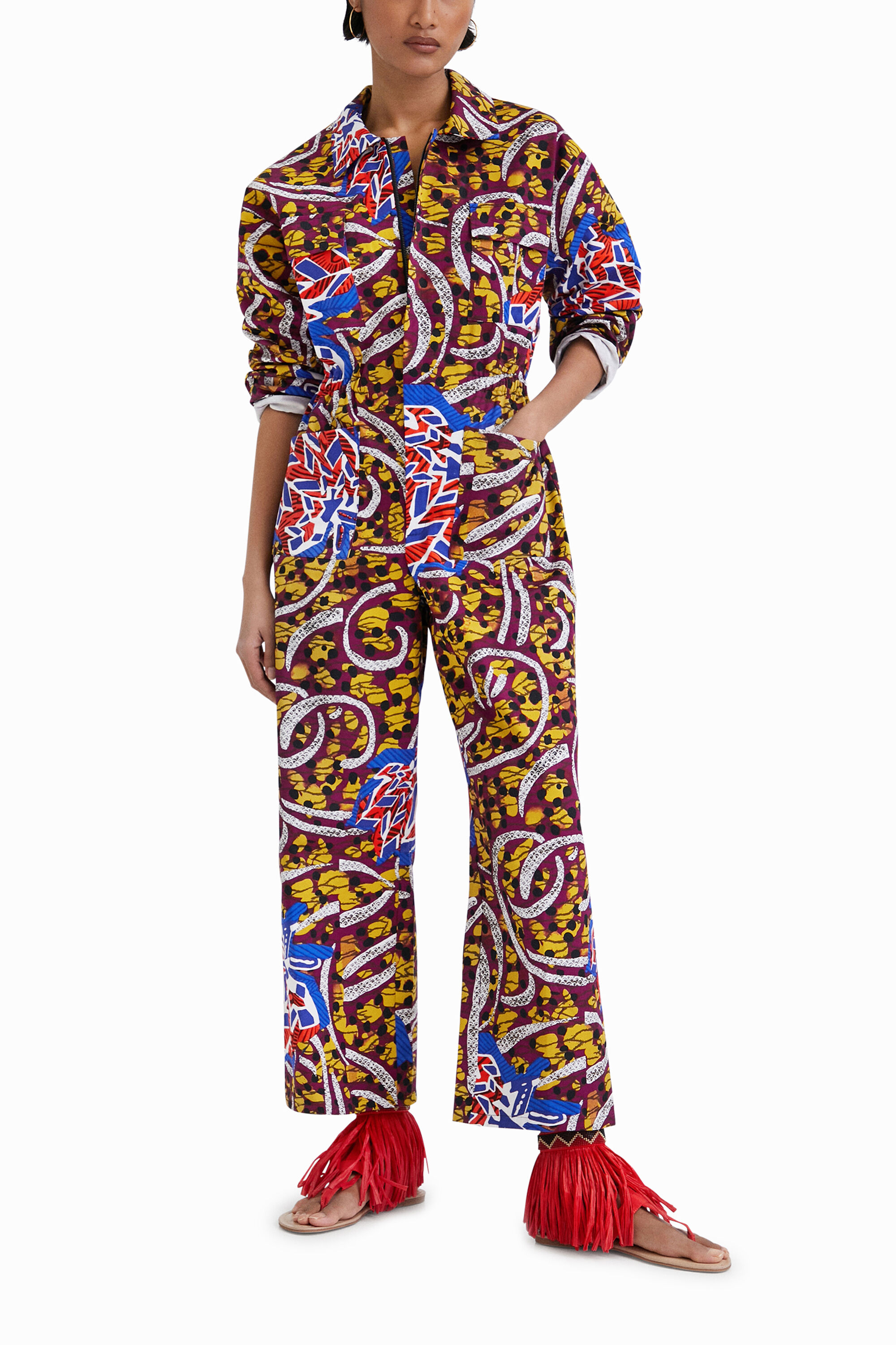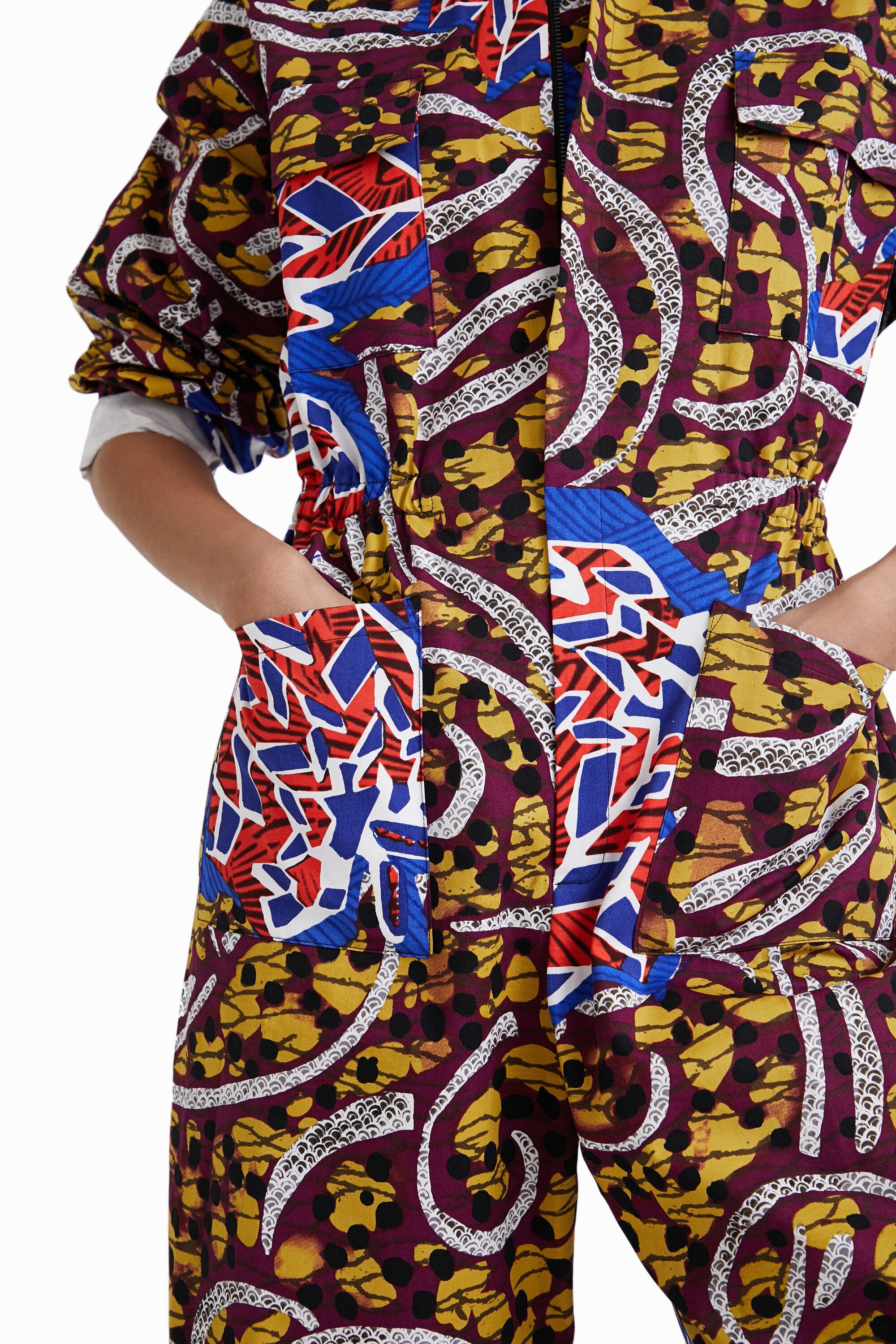This worker-style jumpsuit designed by Stella Jean is unique thanks to its distinctive ethnic wax print, while also being very comfortable and made from cotton.Shirt collarFront zip closureFour front pocketsOriginal ethnic-inspired wax printHidden zip closureWe are a proud member of the Better Cotton Initiative.