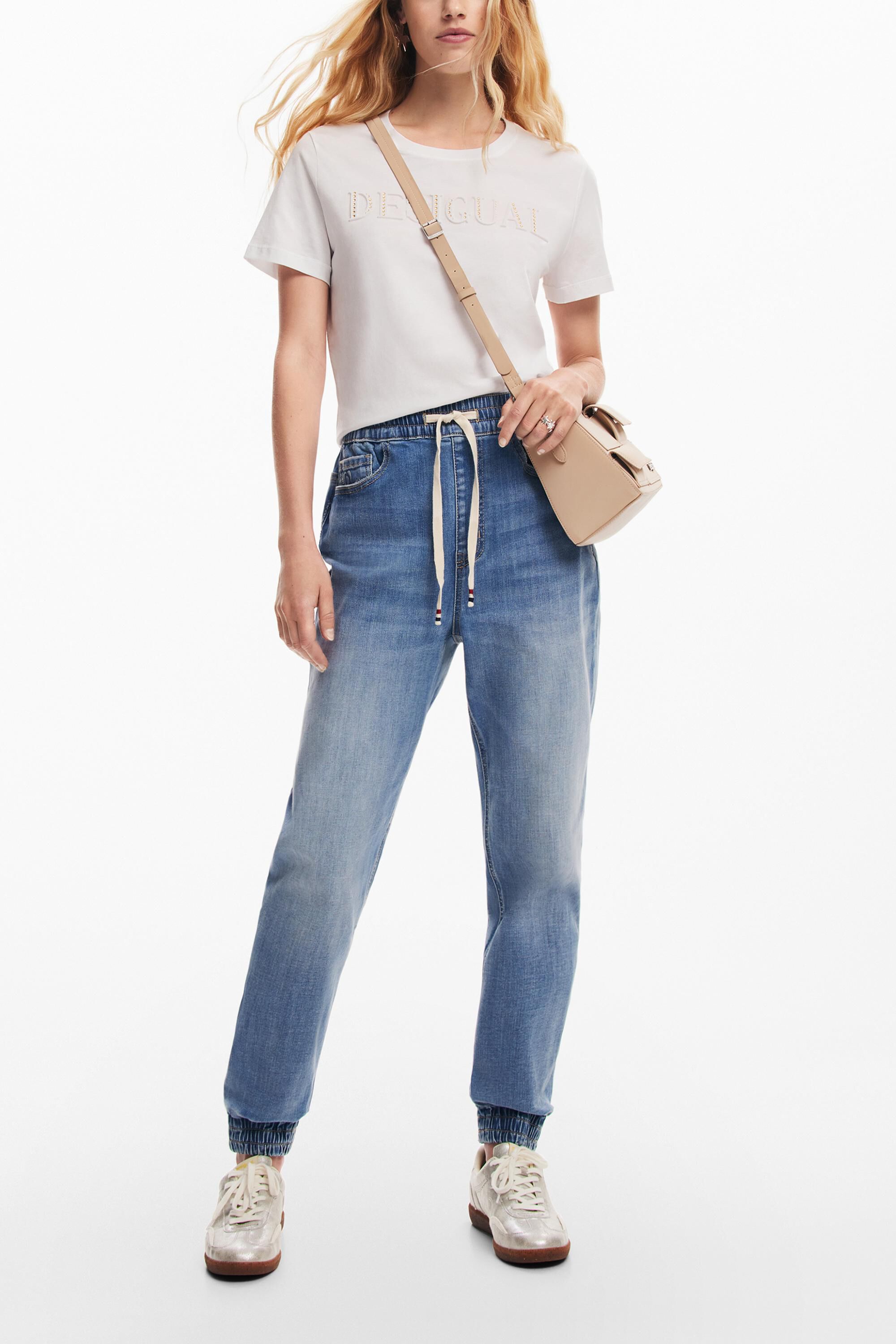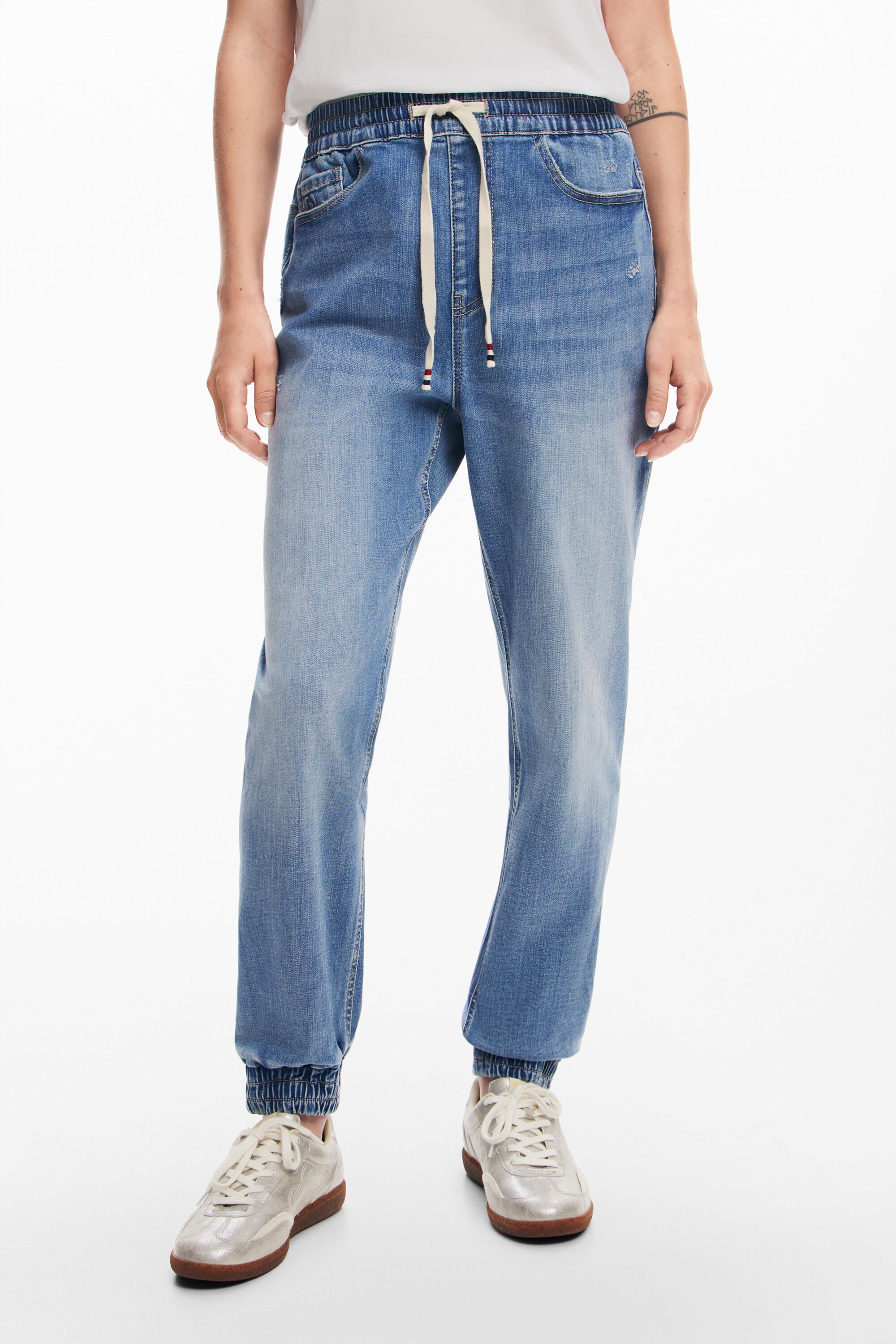Denim jogger pants with button and zipper closureFit: JoggerLength: CroppedSolid colorAdjustable elastic waistband with drawstringWhen you buy cotton products from Desigual, you are supporting our investment in Better Cotton.
