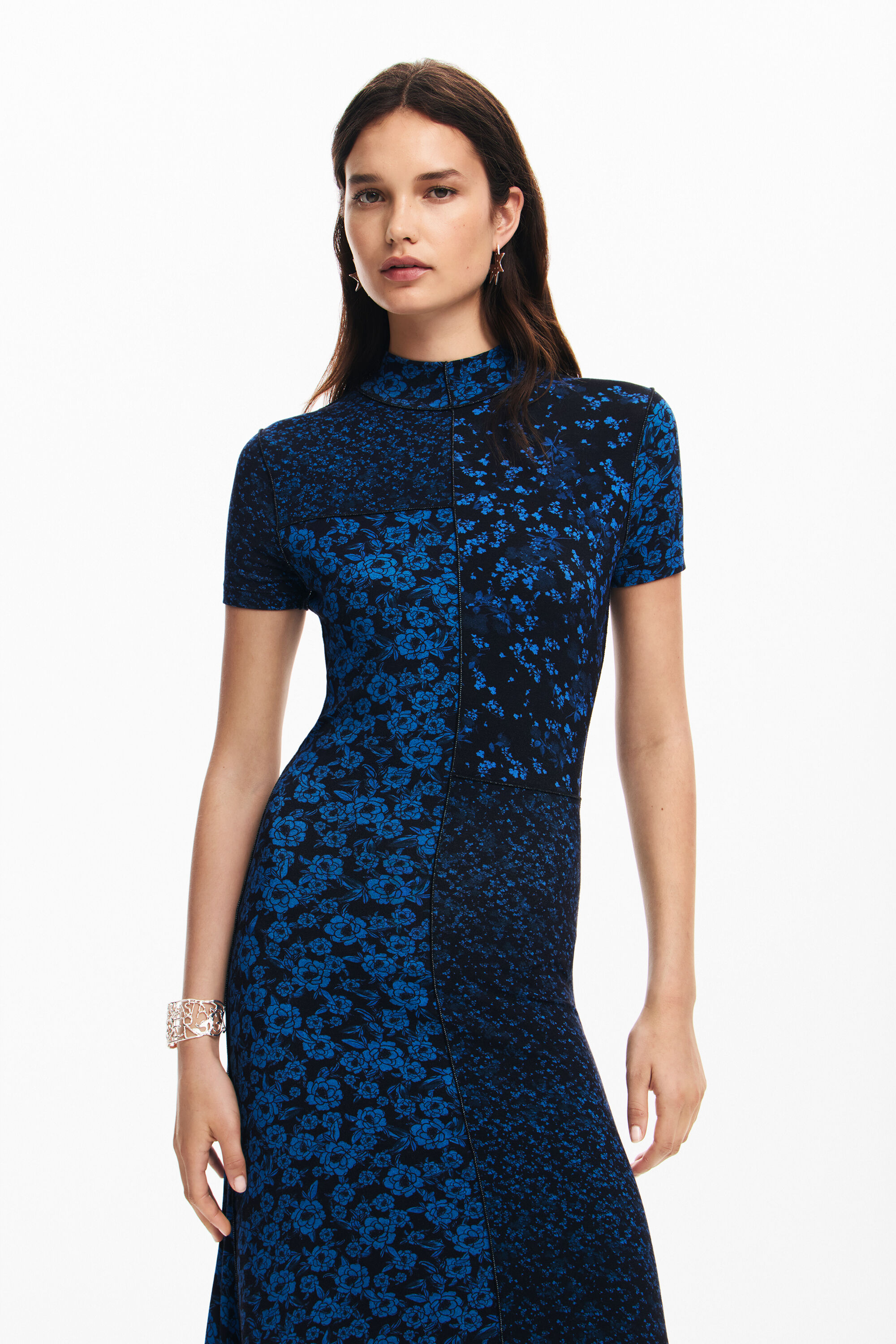 Midi dress with short sleeves, high neck, and floral printFit: