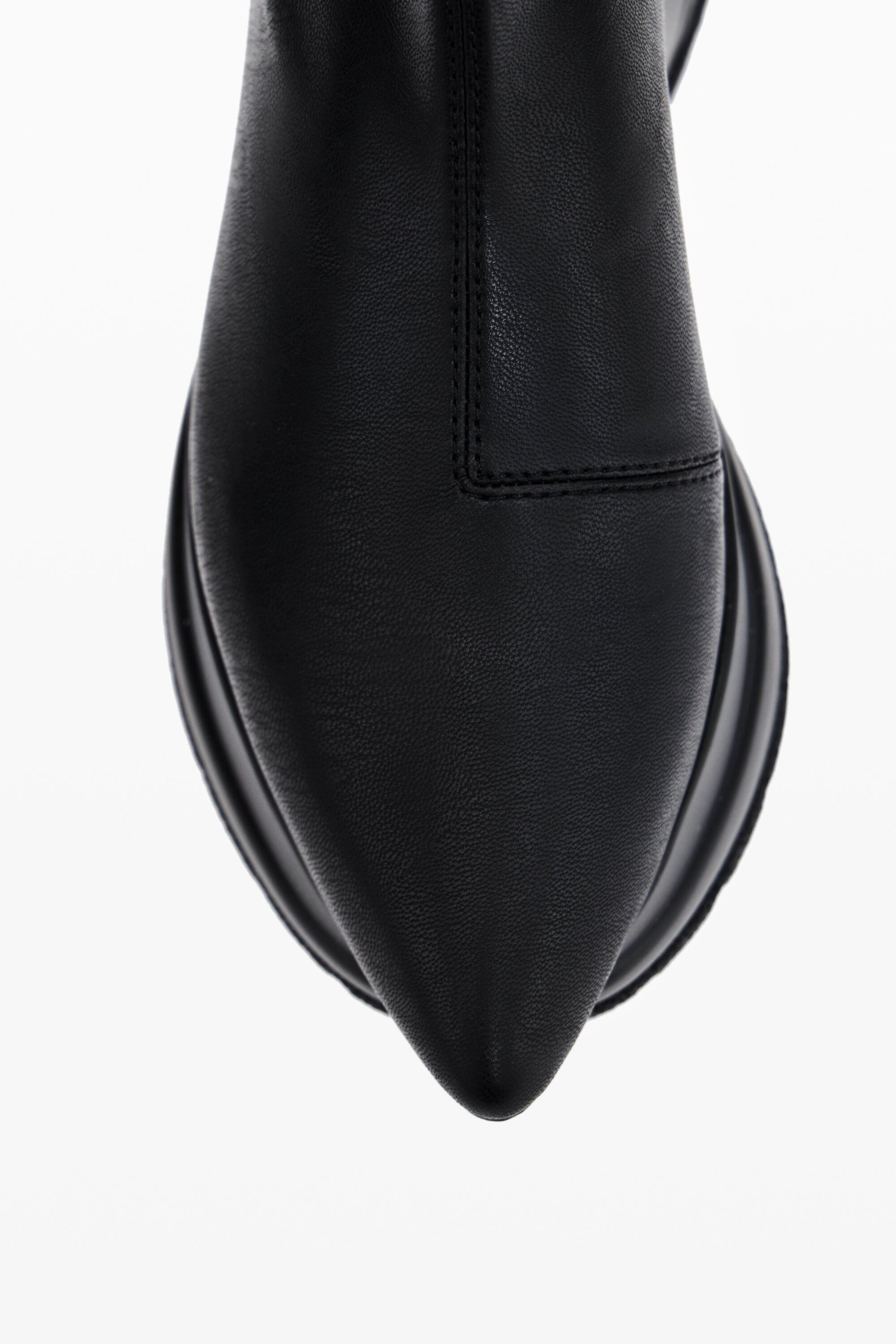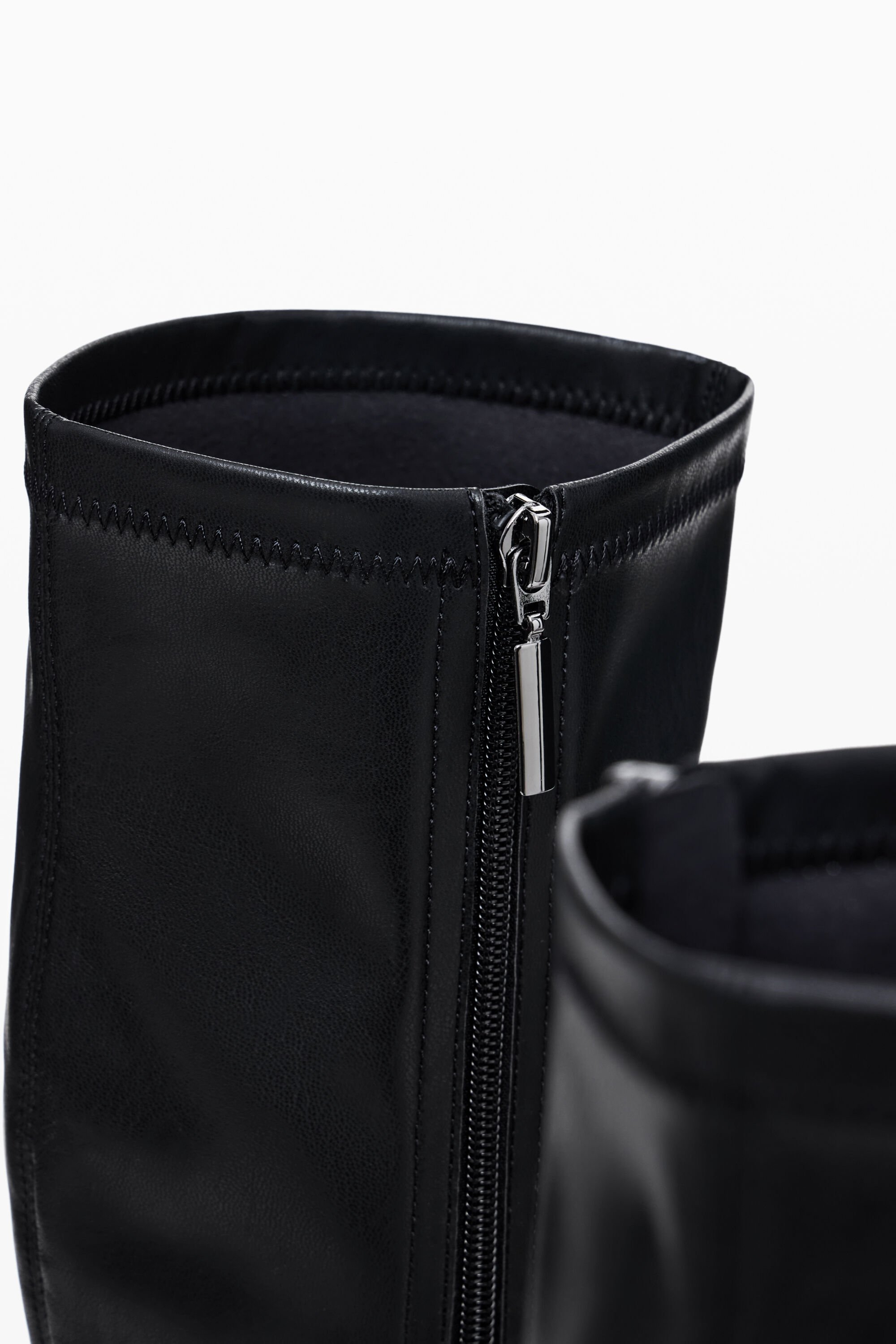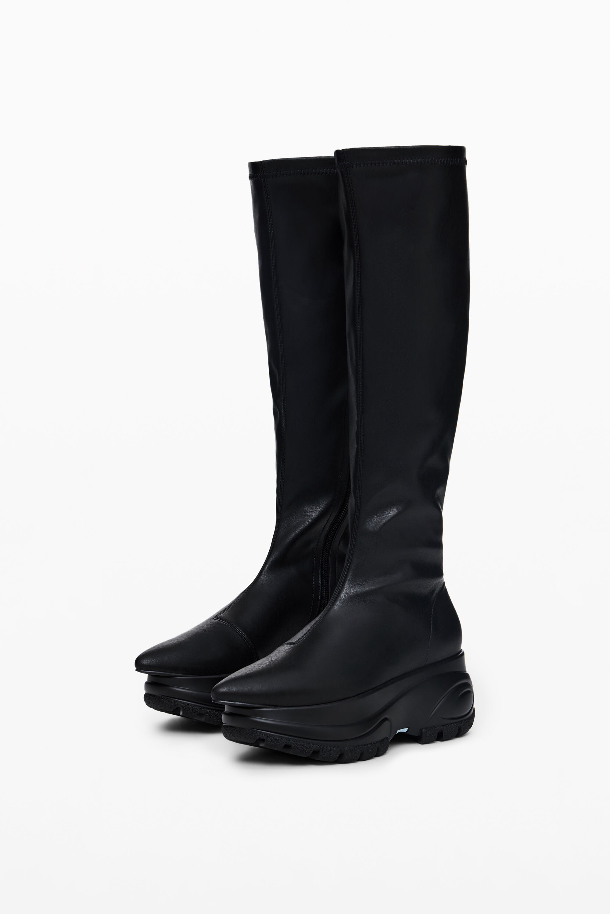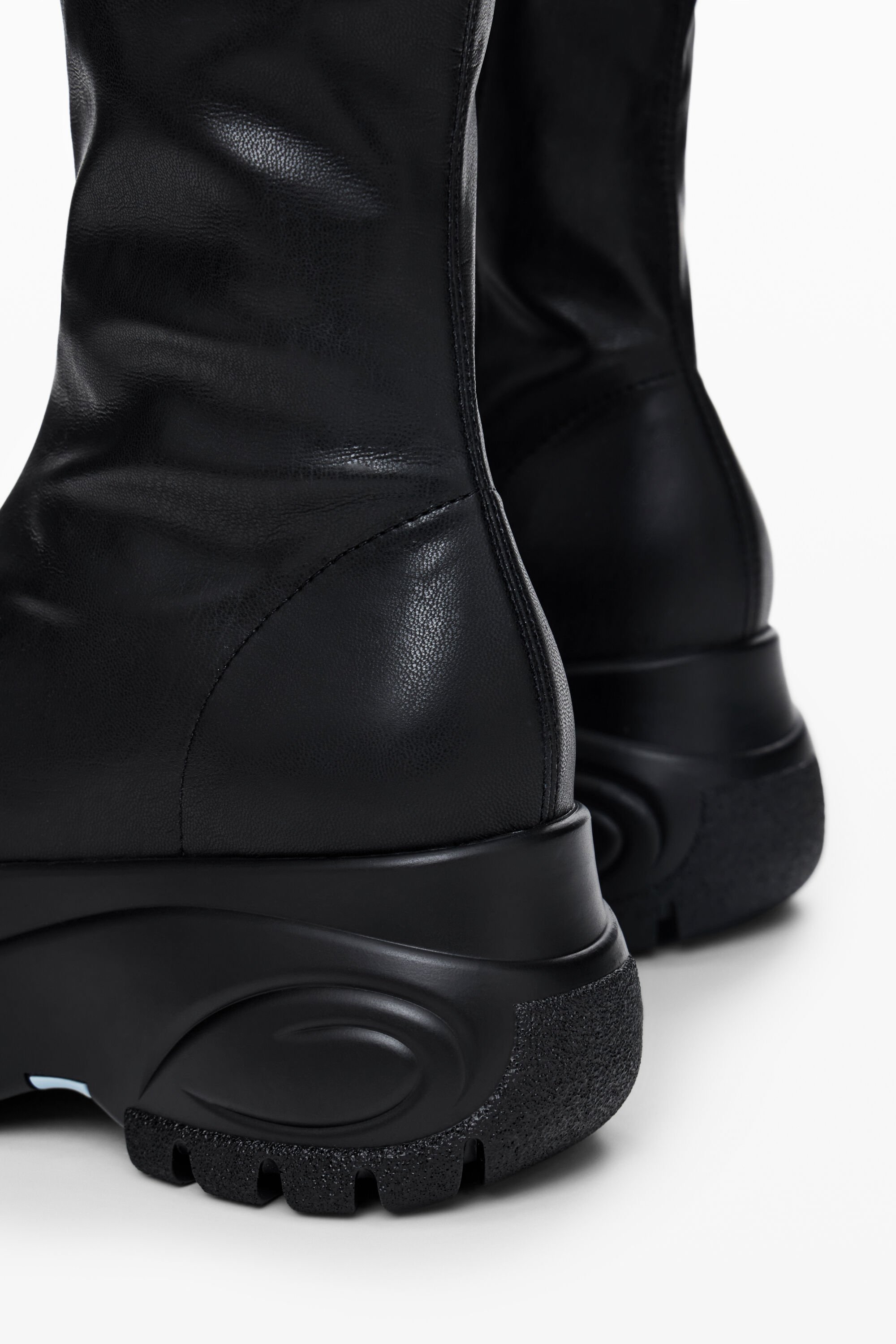 High fitted faux leather boot with round toe and trucker sole designed by Alphonse MaitrepierreFit: