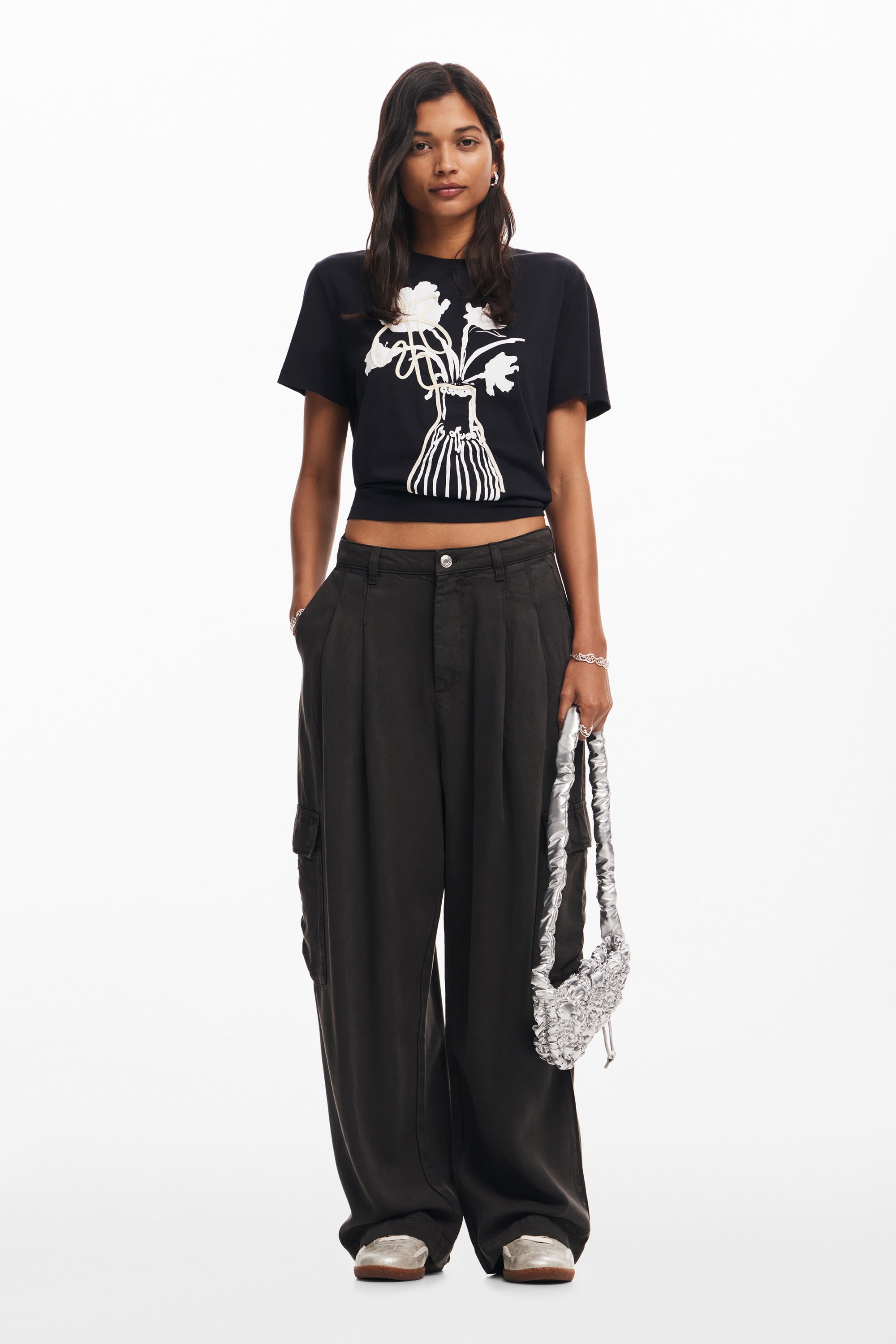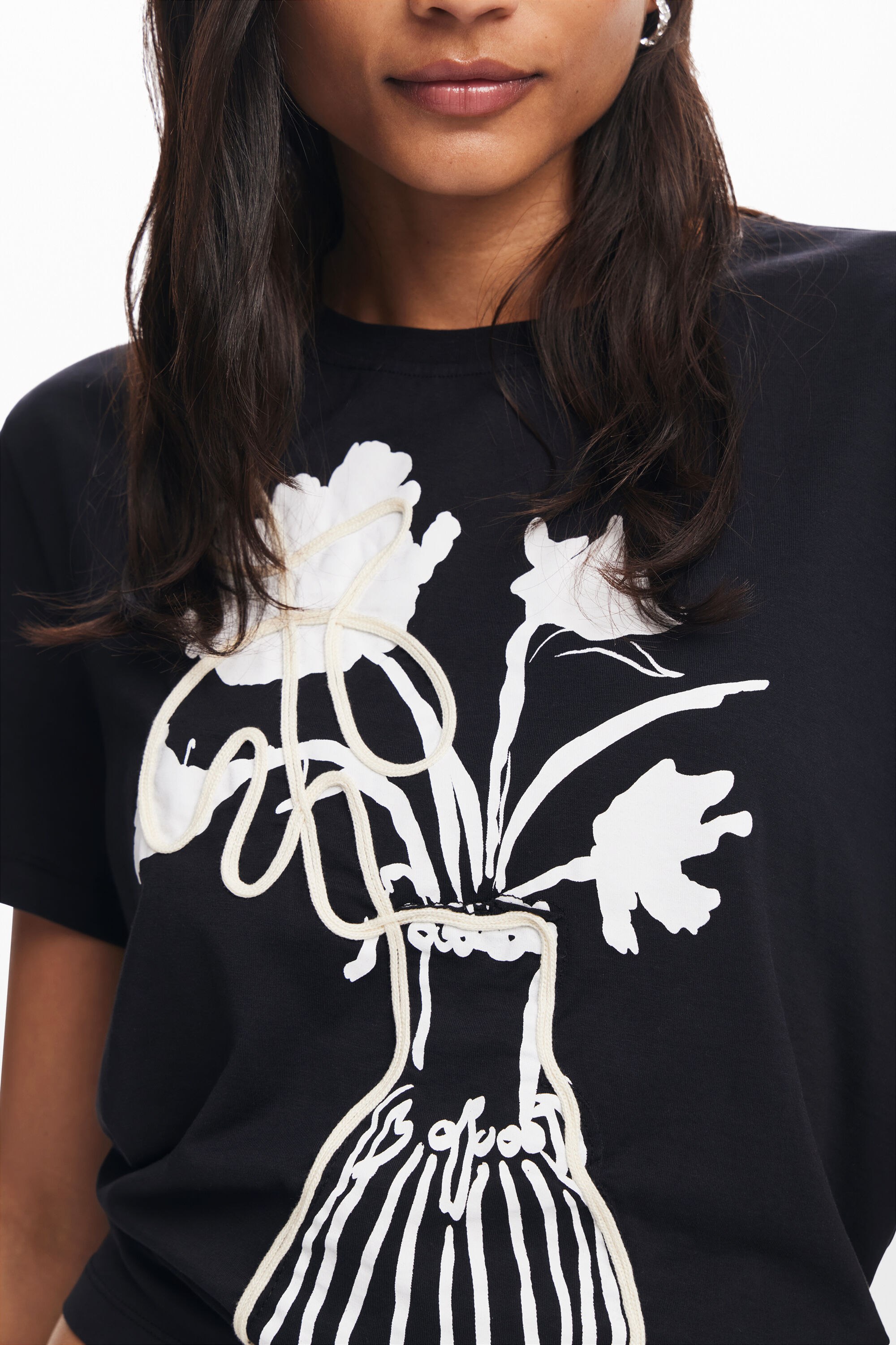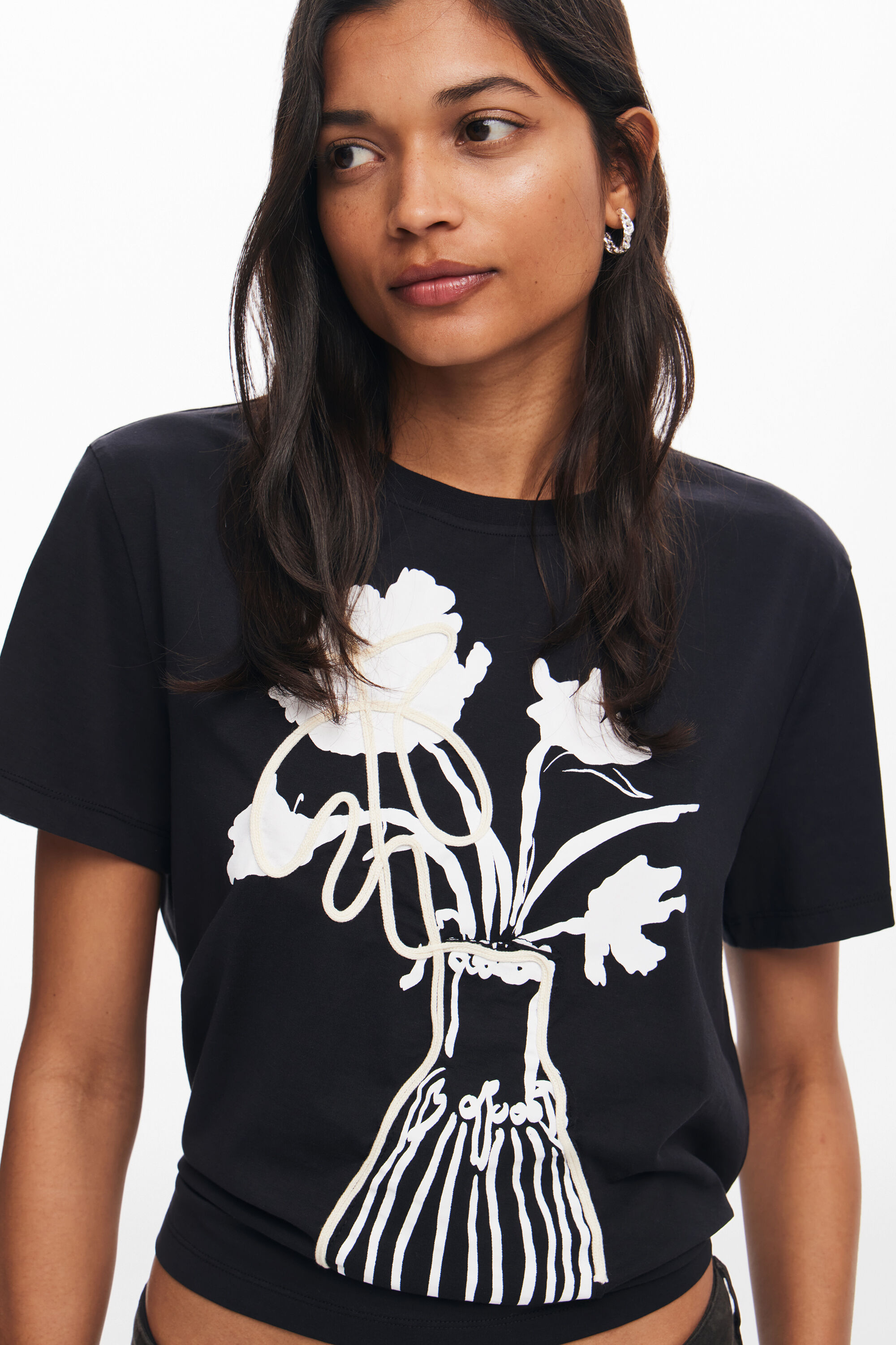 Short-sleeved cotton T-shirt with a round neck and a vase with flowers print