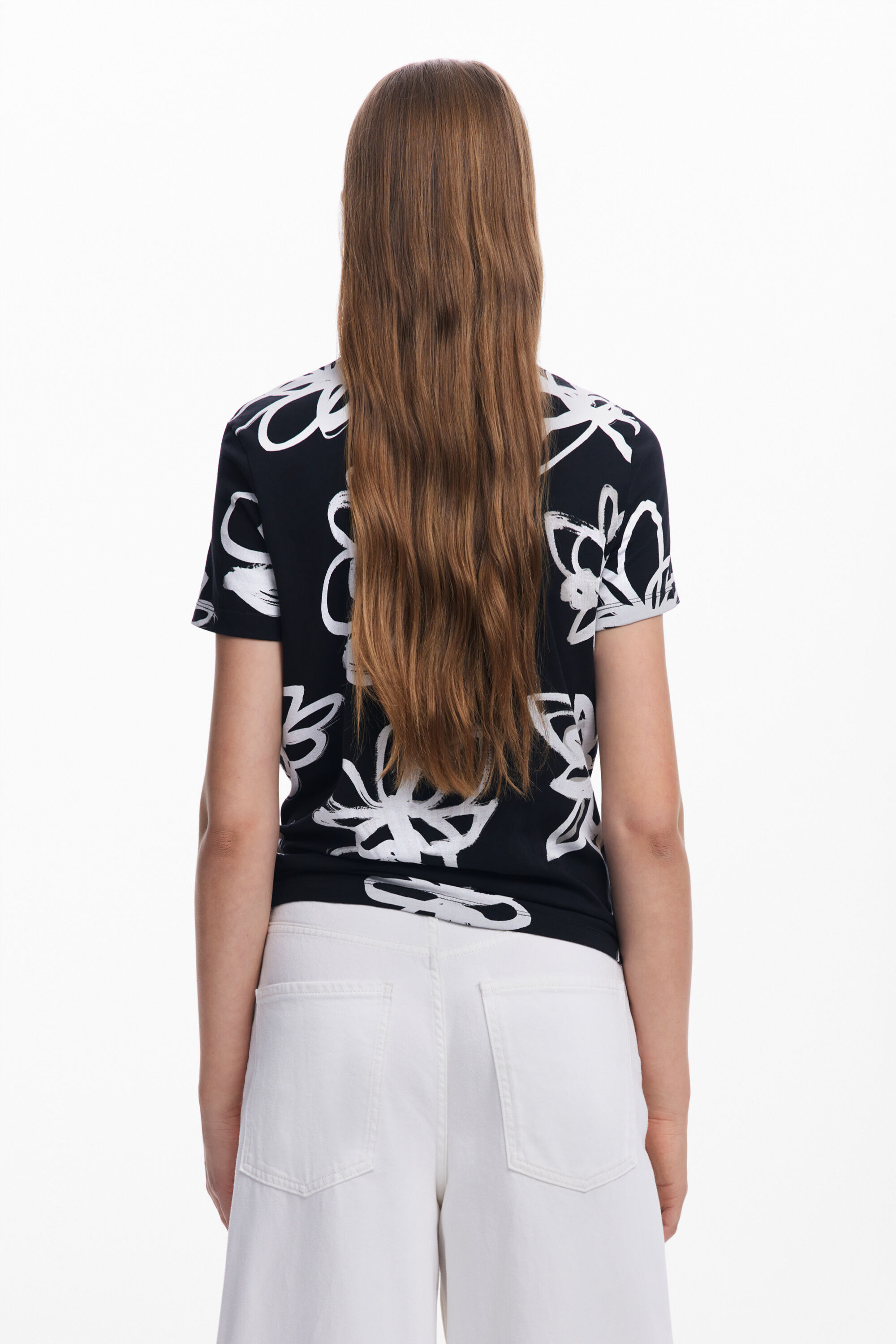 Fitted T-shirt, with a round neck and short sleeves featuring a large flower print on the front.