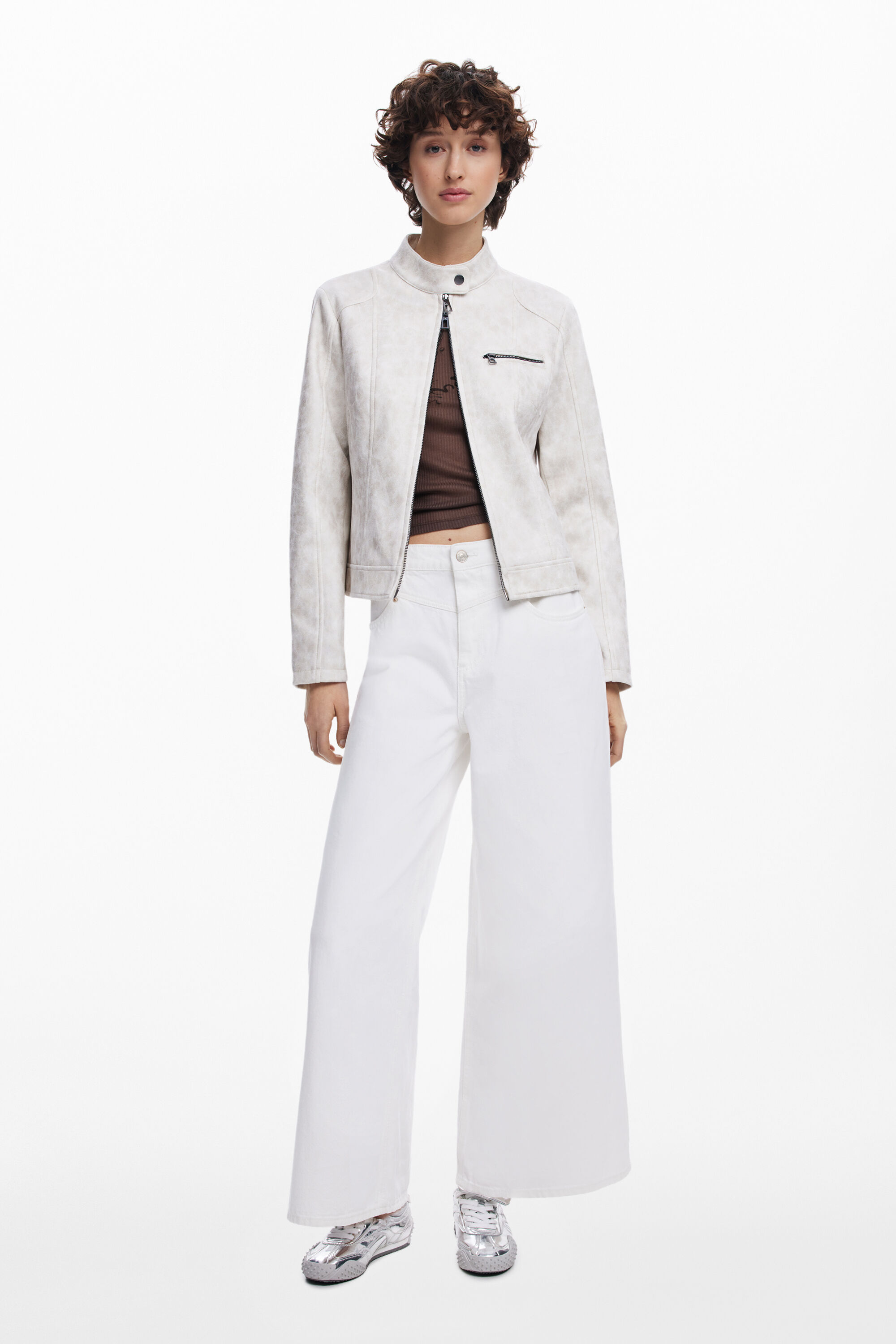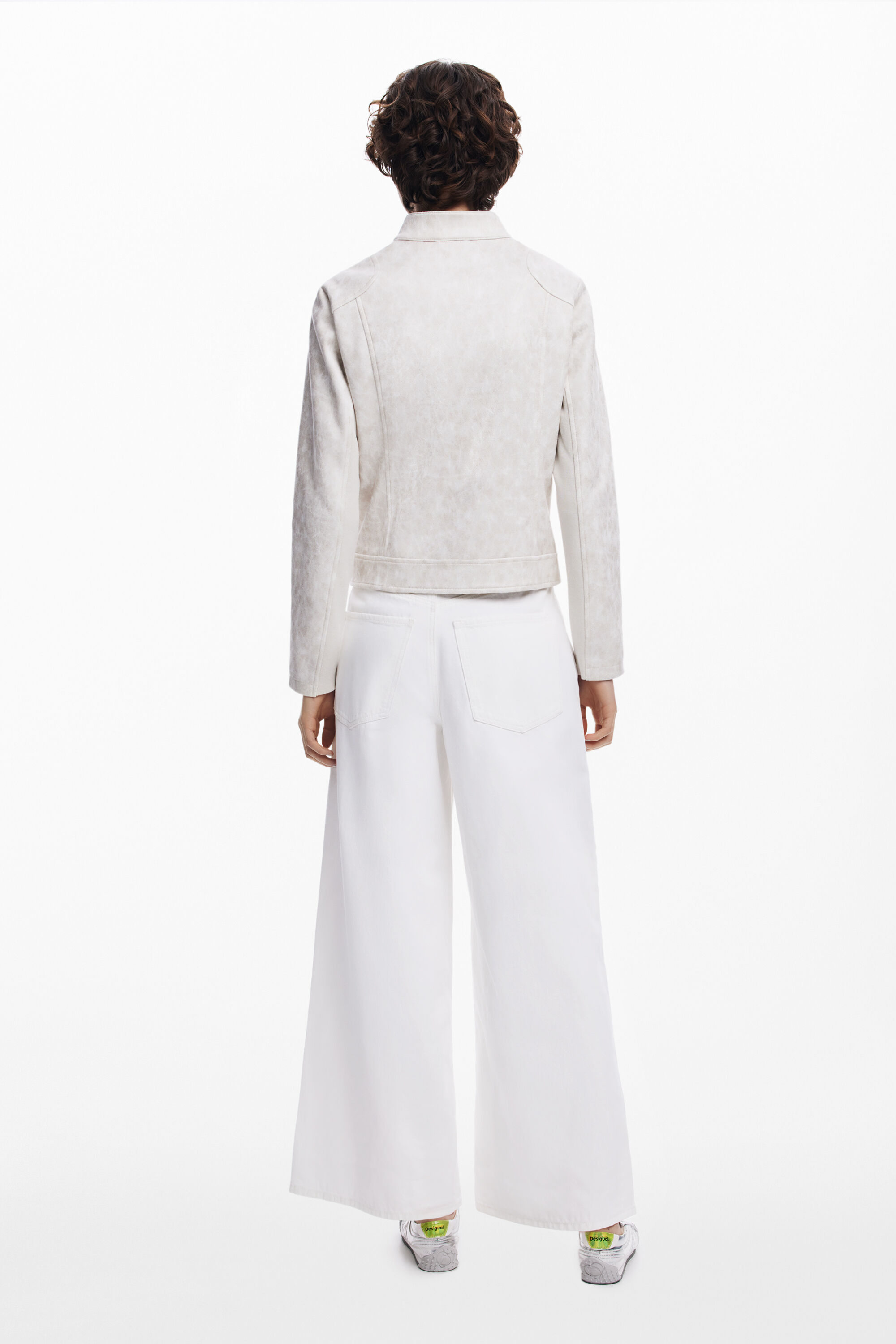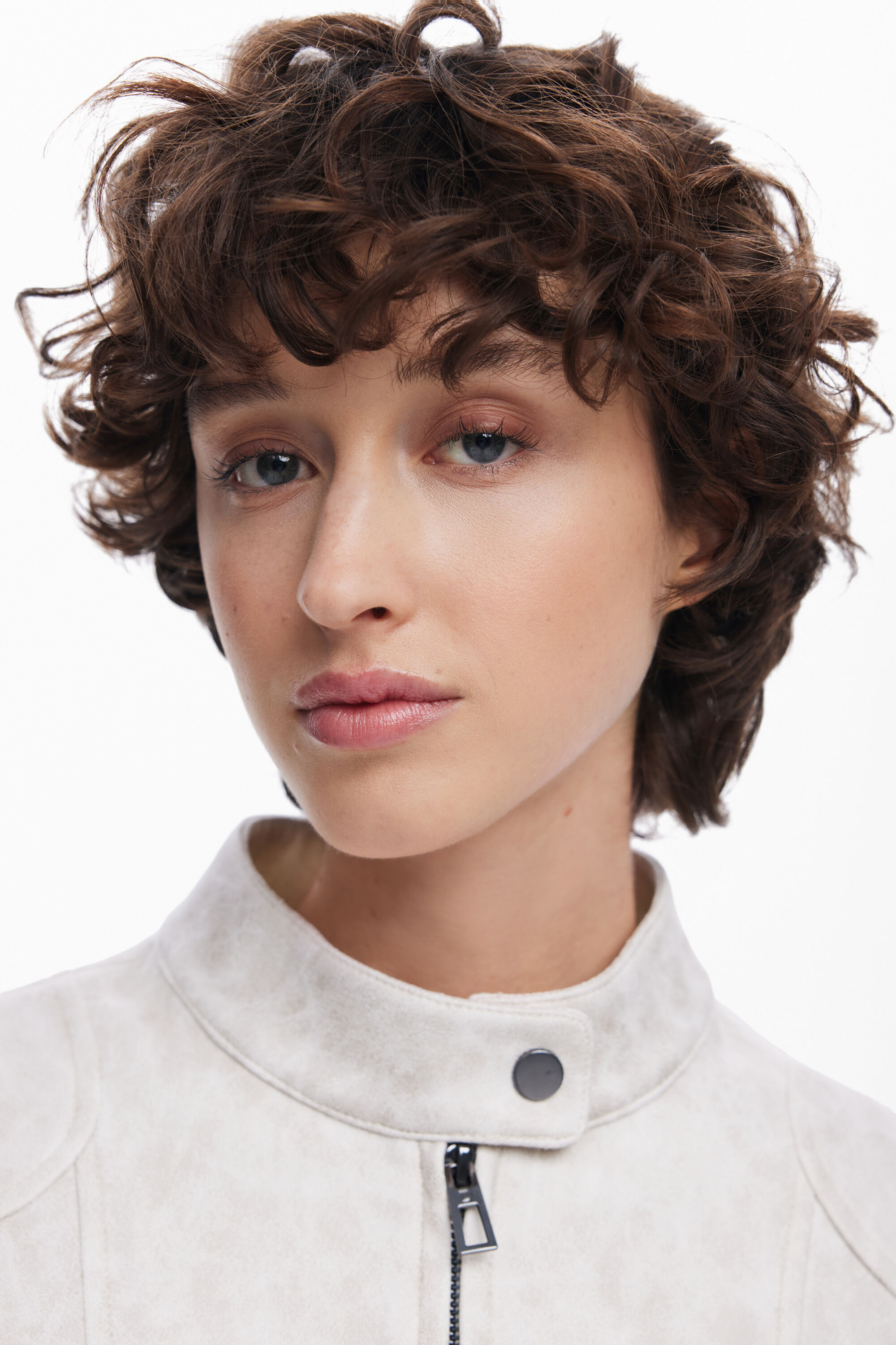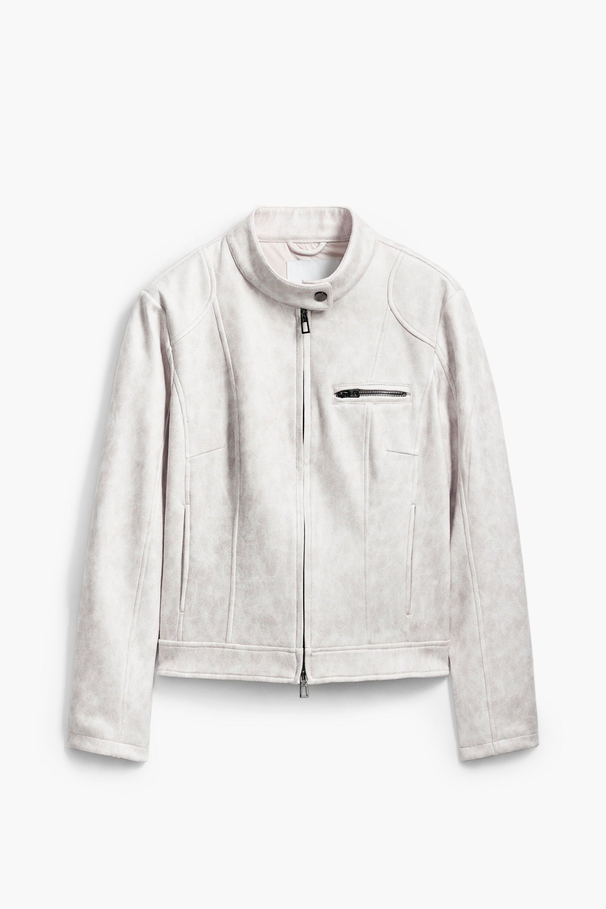 Jacket in worn leather effect, fitted, with mandarin collar, zipper closure, and front pockets.
